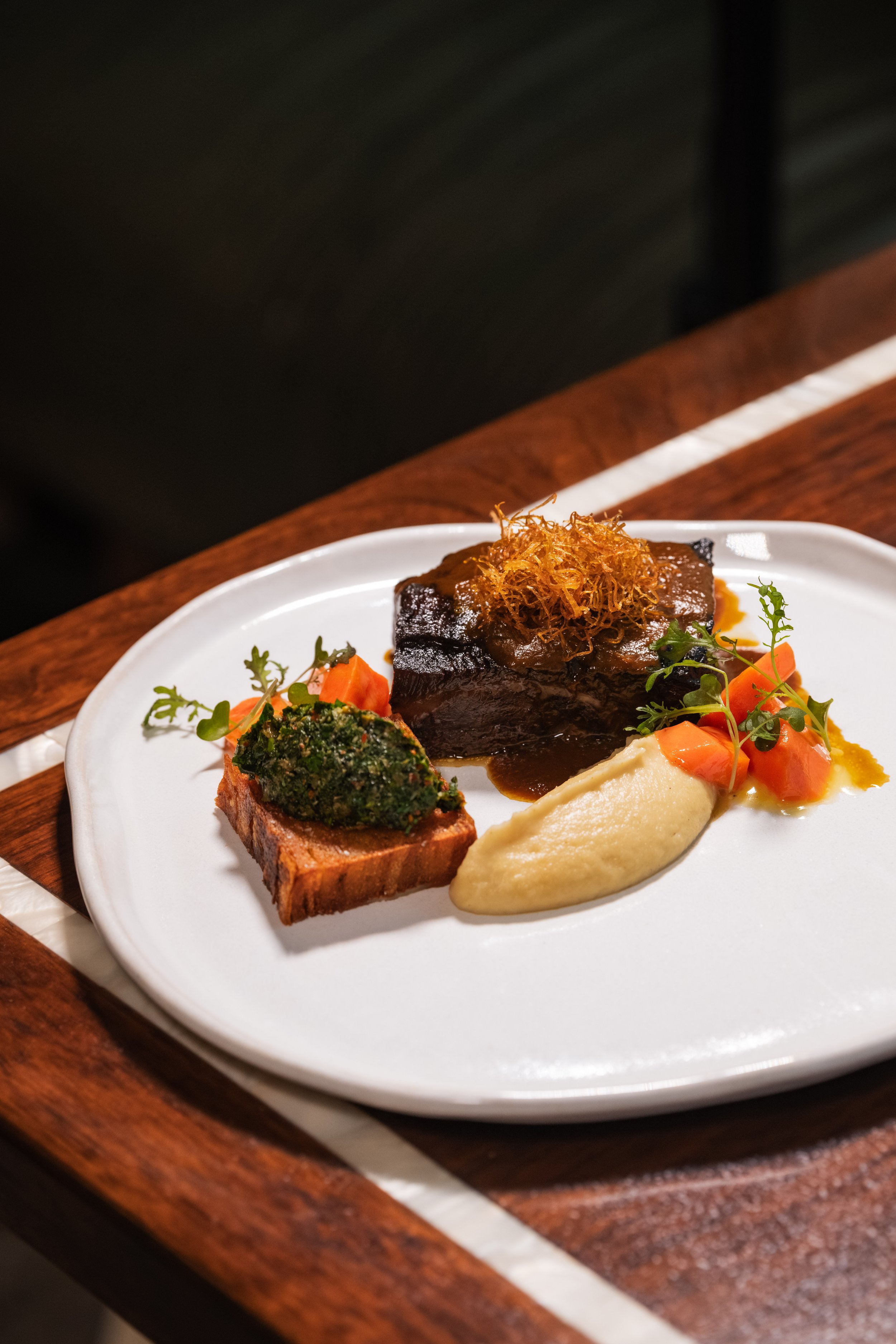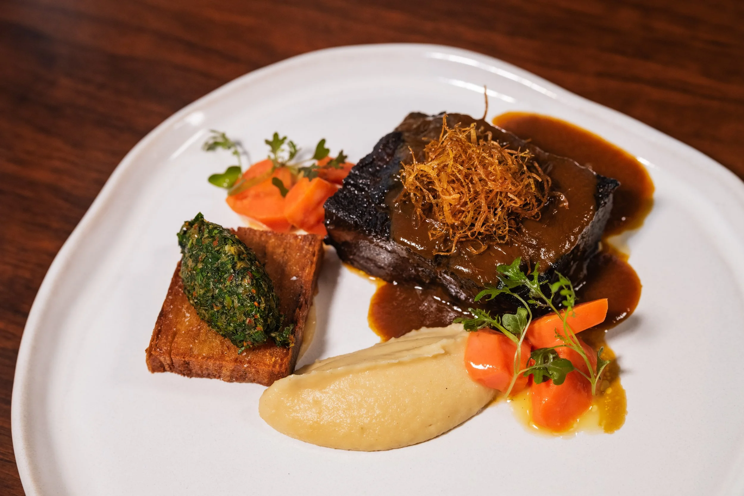 Brasato Al Barolo: Barolo-Braised Beef Cheek, Parsnip-Turnip Purée, Glazed Carrots, Potato Pavé, Salsa Verde, Fried Leeks