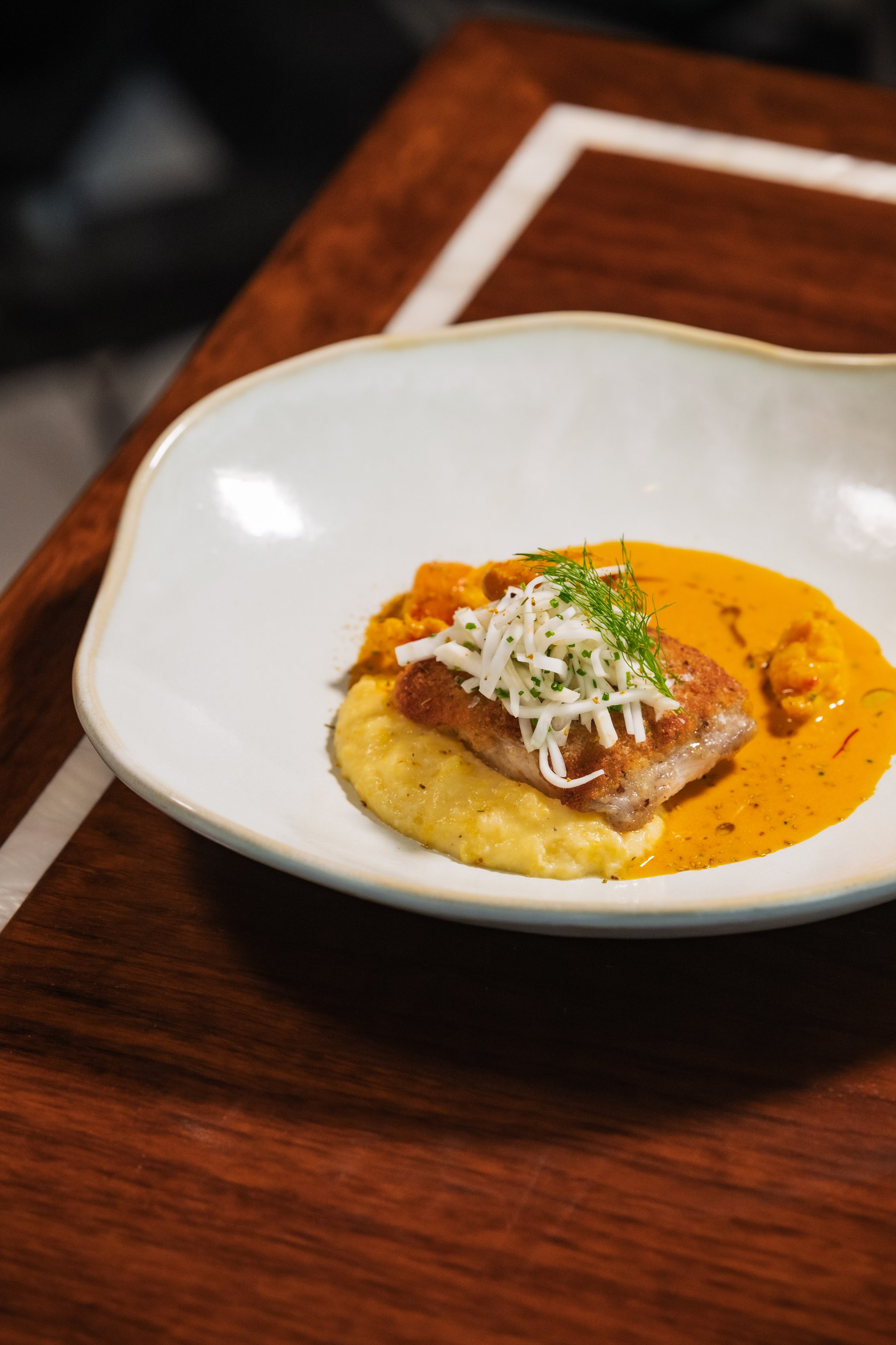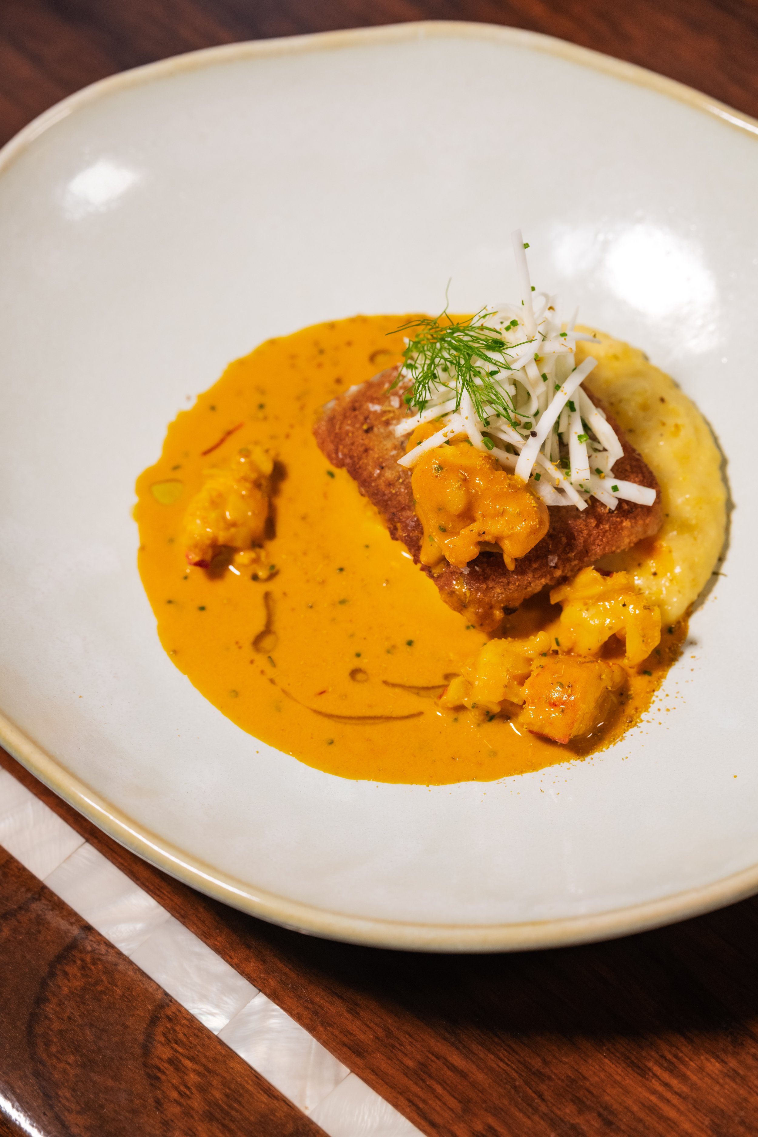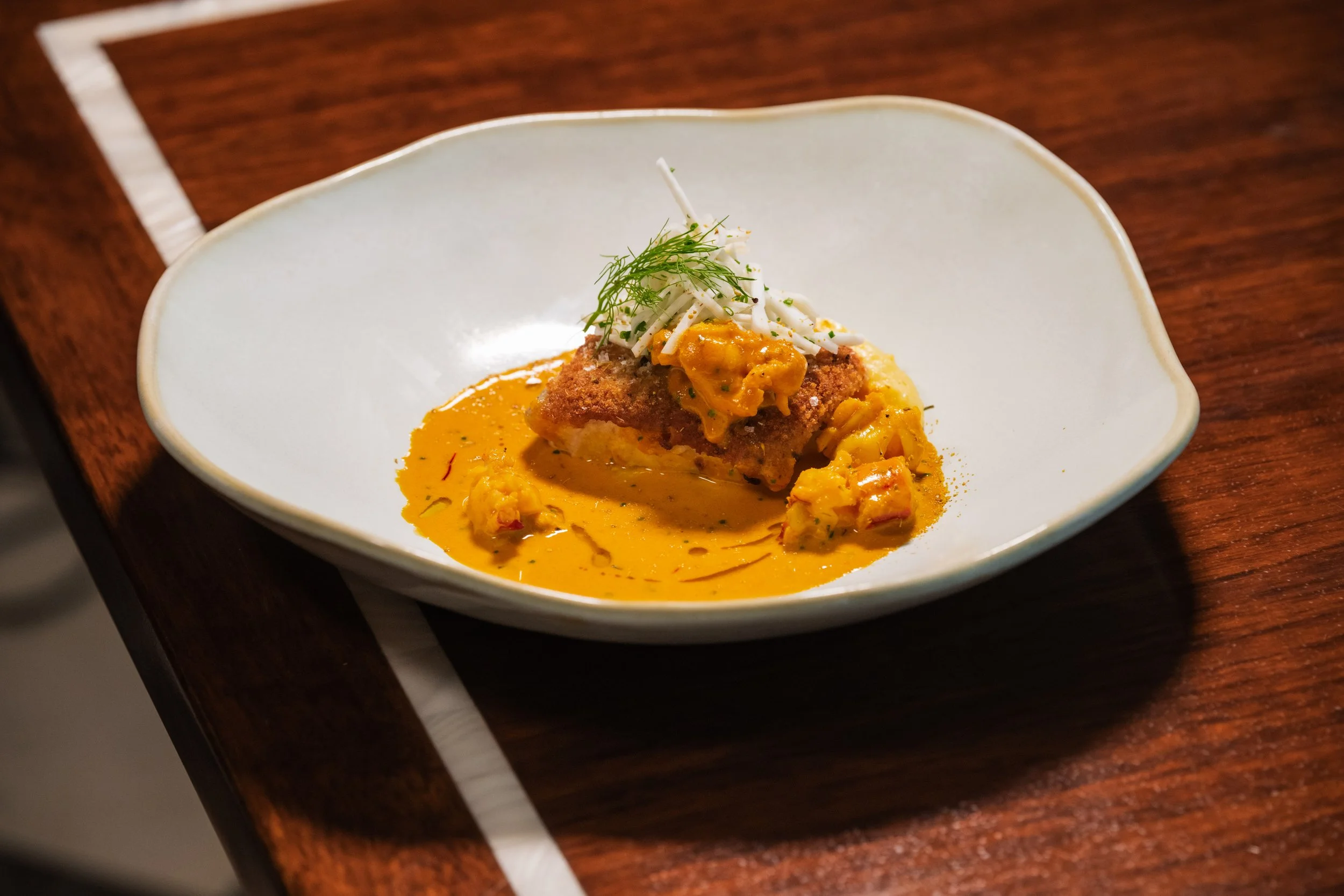 Panko-Breaded Black Cod, Lobster Bisque, Polenta, Celery Root-Fennel Salad, Fennel Fronds, Chives