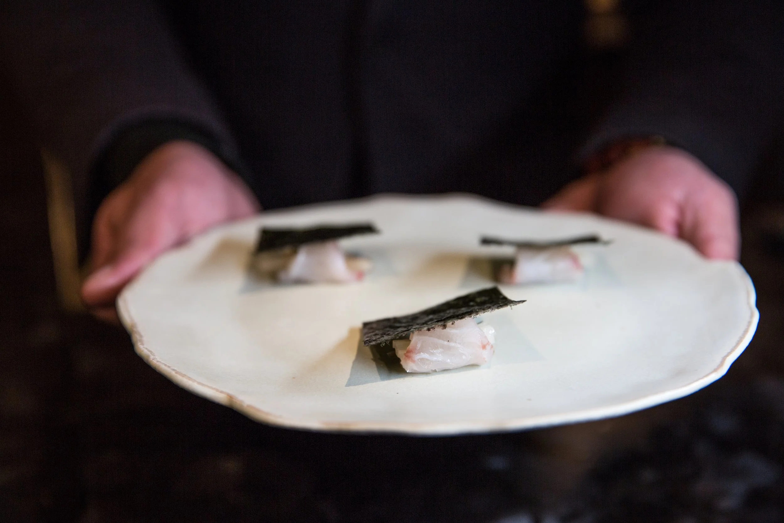 Striped Jack Fish, Kimchi, Fushimi Pepper, and Gim paired with Godello, Ultreia La Claudina, Raul Pérez, Castilla y Leon, Spain, 2014