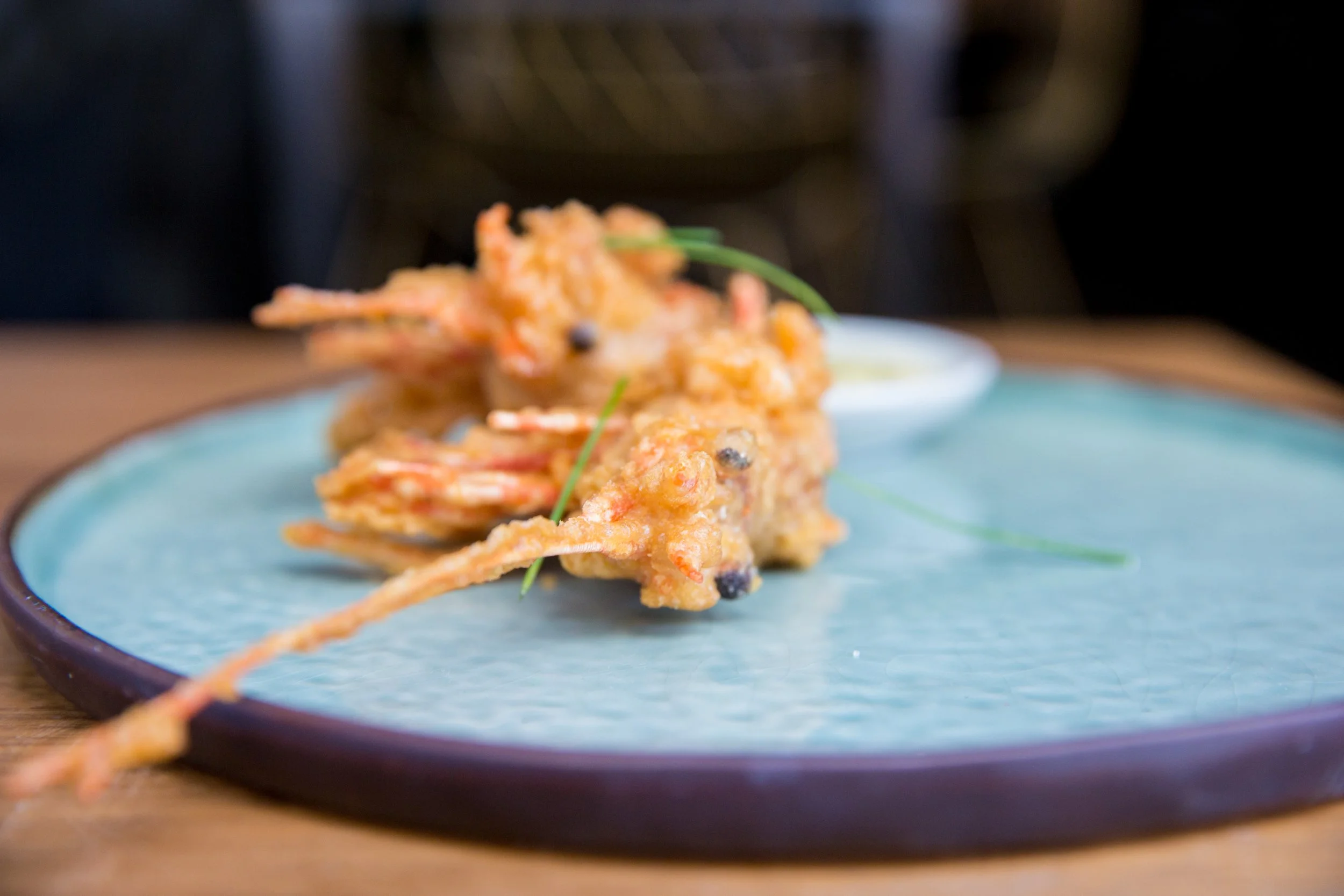 Tempura-Battered Spot Prawn Heads, Yuzukoshō-Kumquat Aïoli, and Chive Tips