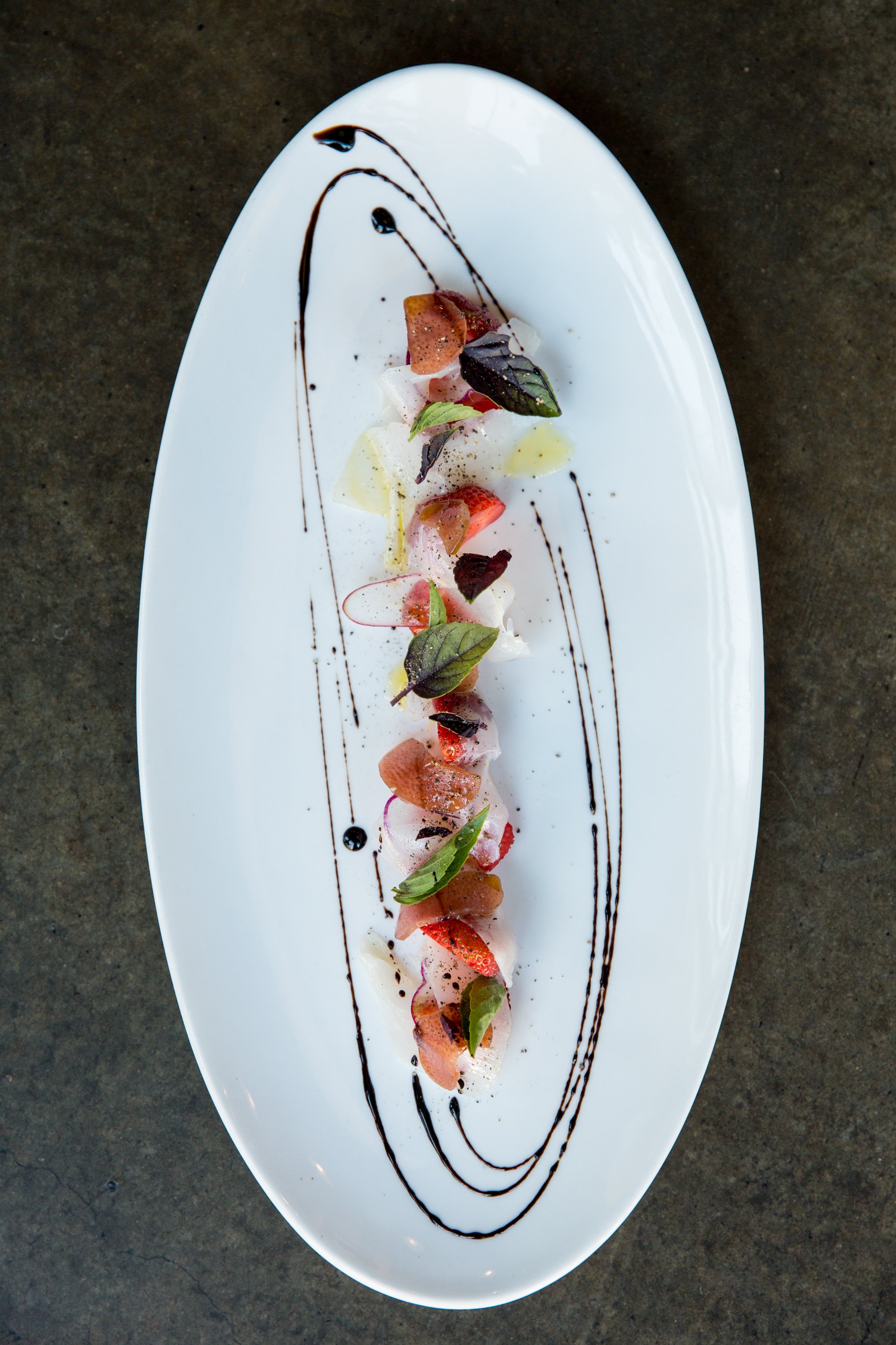Strawberry, Lardo, Radish, Pickled Rhubarb, Smoked Olive Oil, and Balsamic