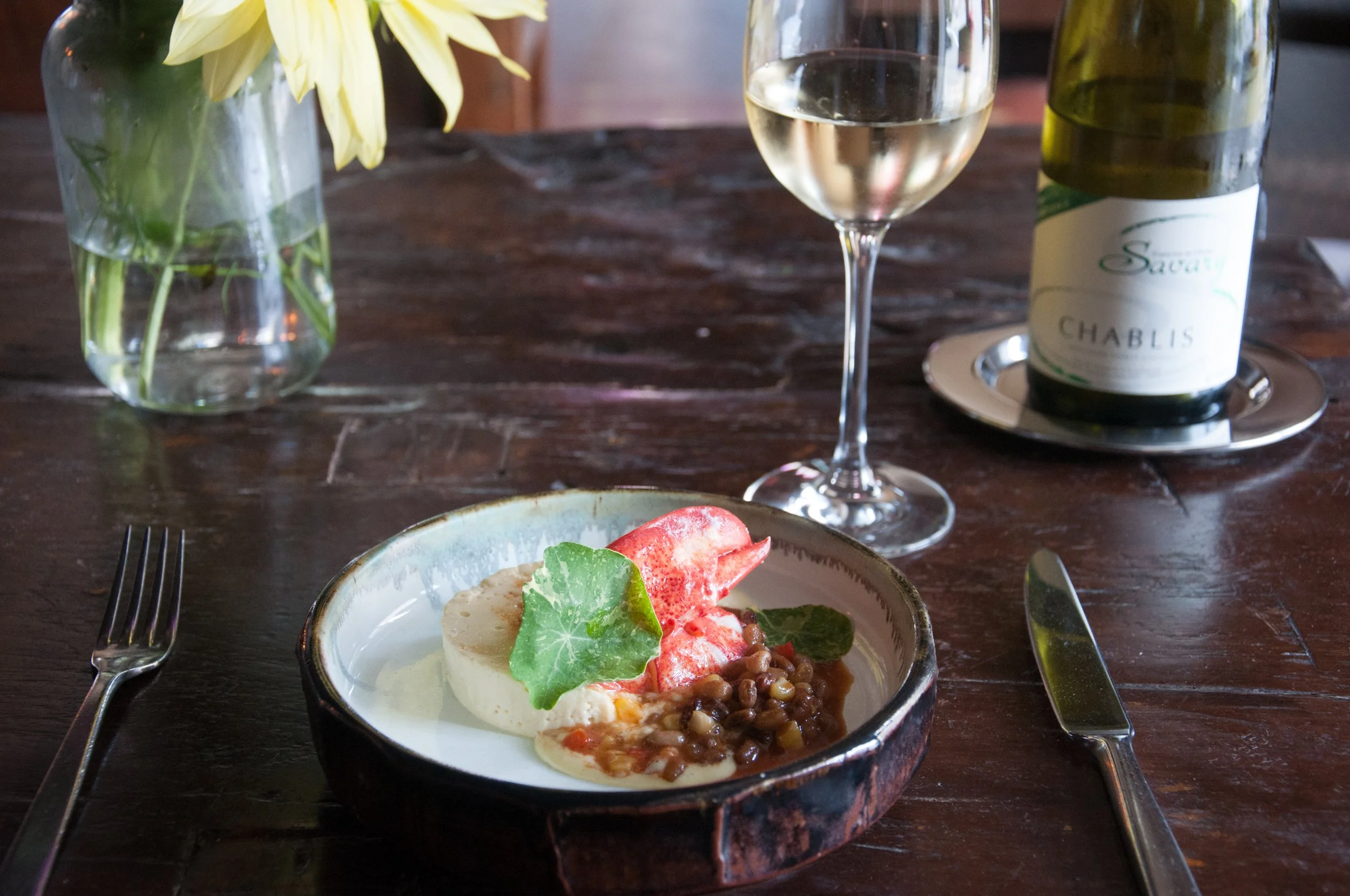 Lobster, Corn Custard, and Peas paired with Chardonnay, Savay Chablis, Francine et Olivier, Burgundy, France