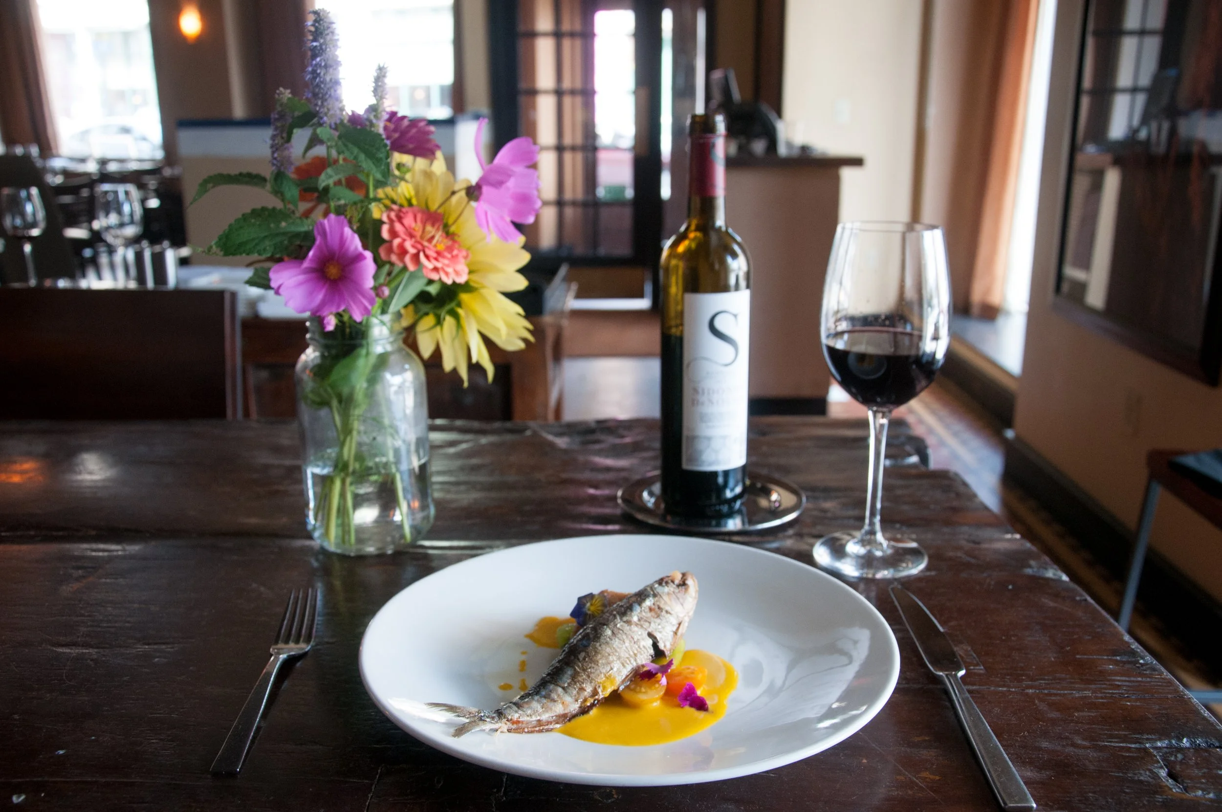 Sardine, Squash-Yucca-Green Plantain Pastele, and Sun Gold Tomato Emulsion paired with Baga, Sidonio De Sousa, Siduri, Bairrada, Portugal