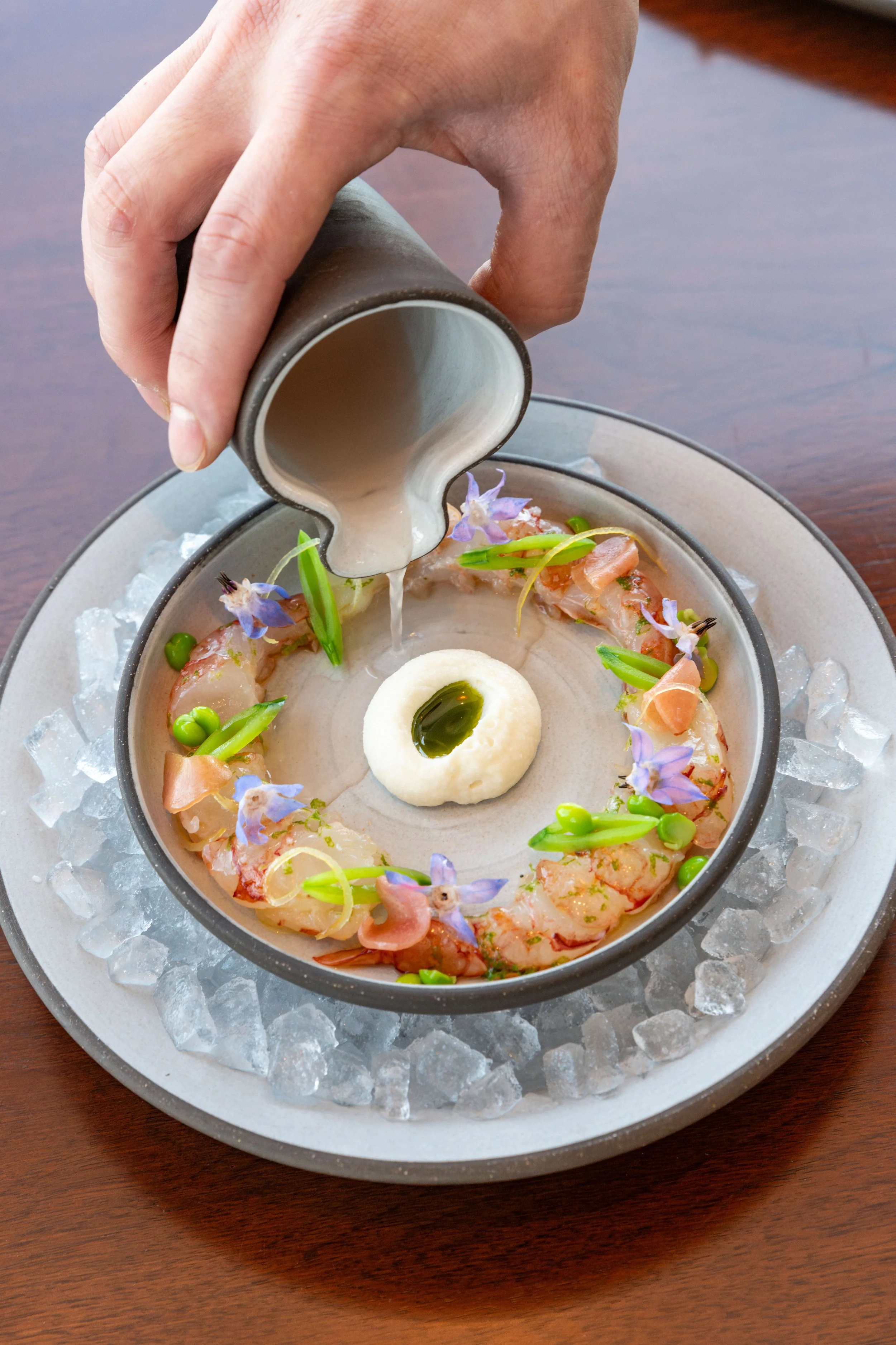 Argentine Red Shrimp Crudo, Smoked Olive Oil, Horseradish Cream, Tarragon Oil, Lime, Candied Lemon, Pickled Rhubarb, Sugar Snap Peas, Boralis