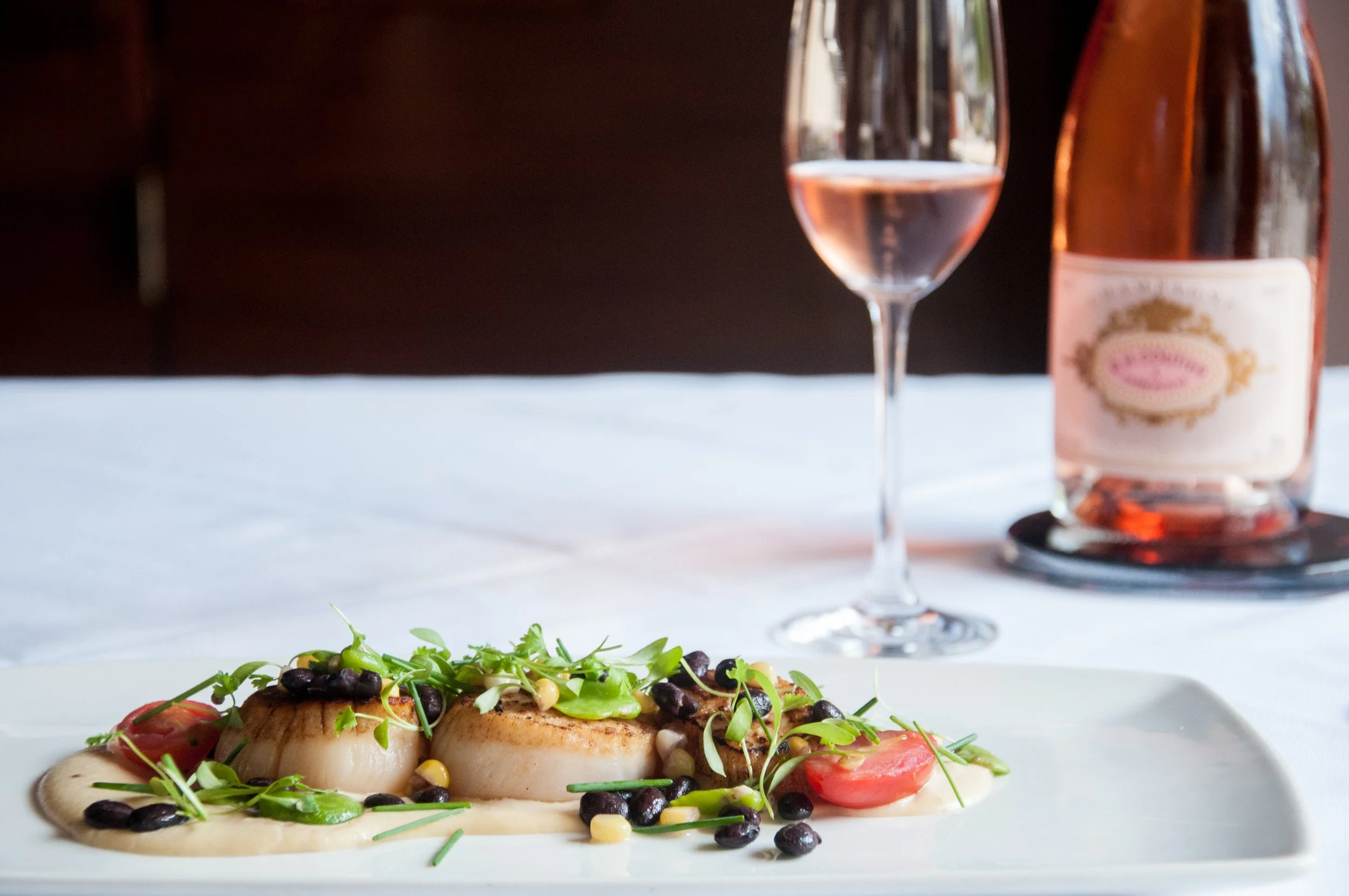 Scallop, Sweet Corn and Black Bean Succotash, Parsnip Purée, Bacon Vinaigrette, Micro Cilantro, and Chive paired with Chardonnay/Pinot Noir, Grand Cru Brut, R.H. Coutier, Champagne, France, NV
