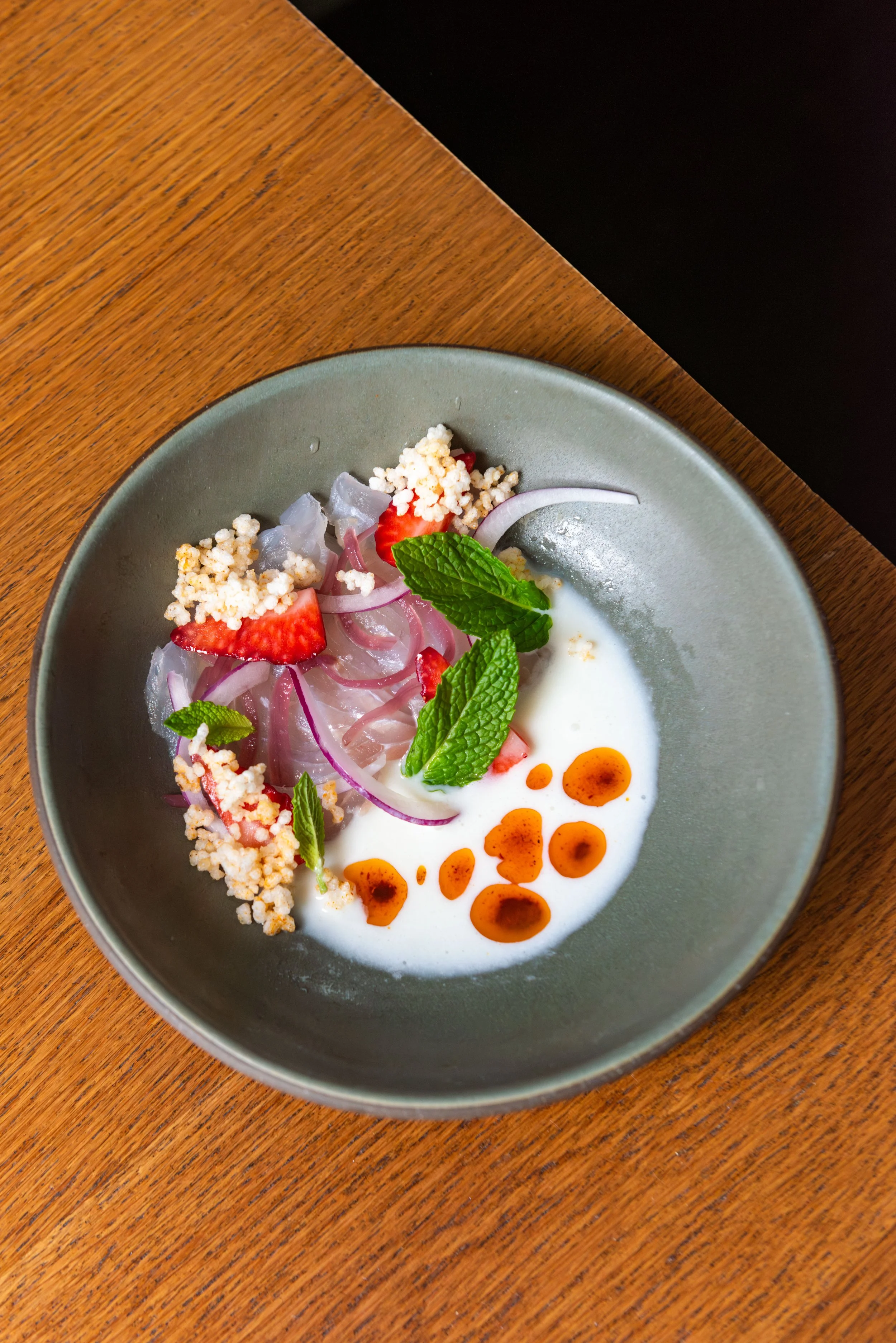 Flounder, Berbere Spice, Buttermilk Leche de Tigre, Pickled Red Onion, Crispy Carolina Gold Rice, Mint