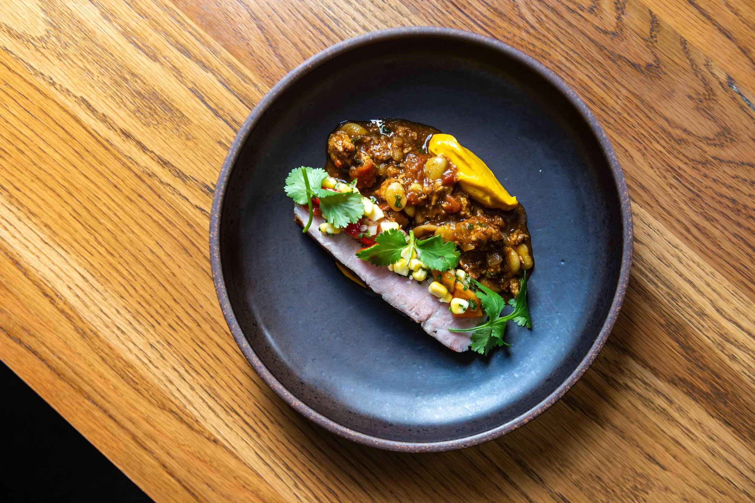 Grilled Pork, Chorizo, Butter Beans, Carrot Purée, Tomato, Sour Corn Relish, Roasted Bell Pepper, Pickled Ramps
