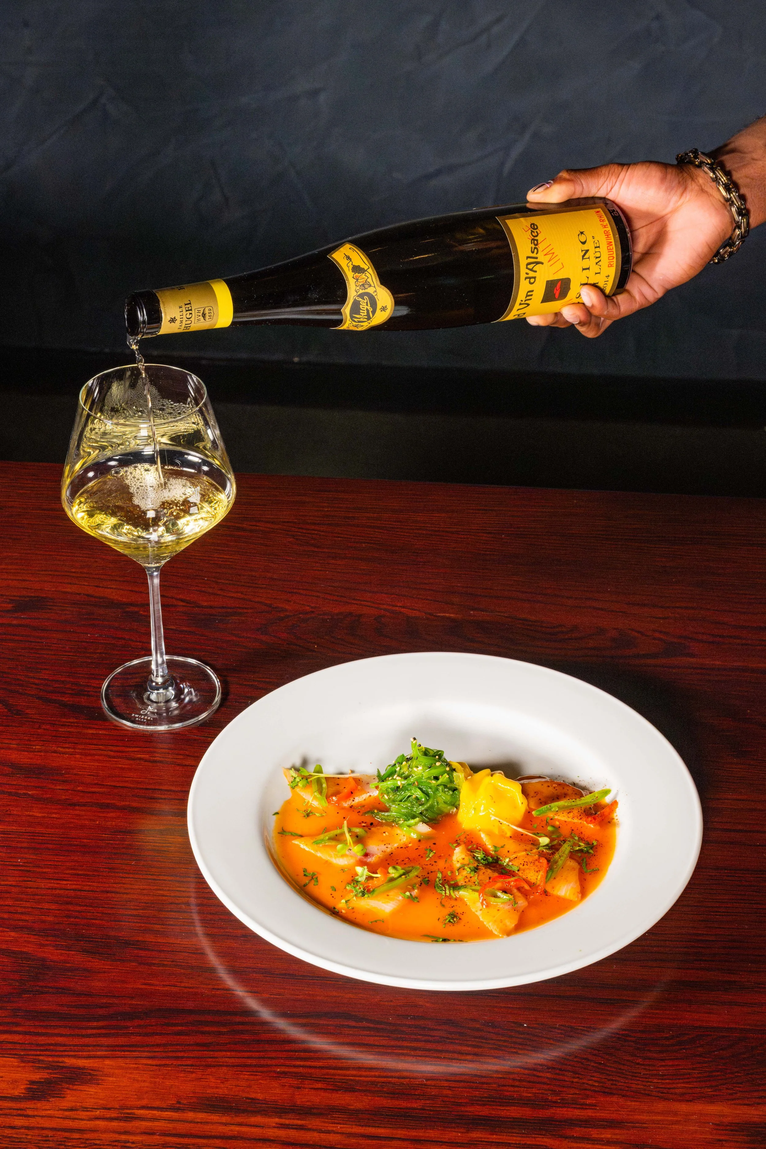 Hamachi Crudo, Pickled Mango, Seaweed, Peppadew Peppers, Sriracha Vinaigrette, Cilantro, Togarashi paired with Riesling, Riesling Grossi Laüe, Hugel Alsace, France 2014