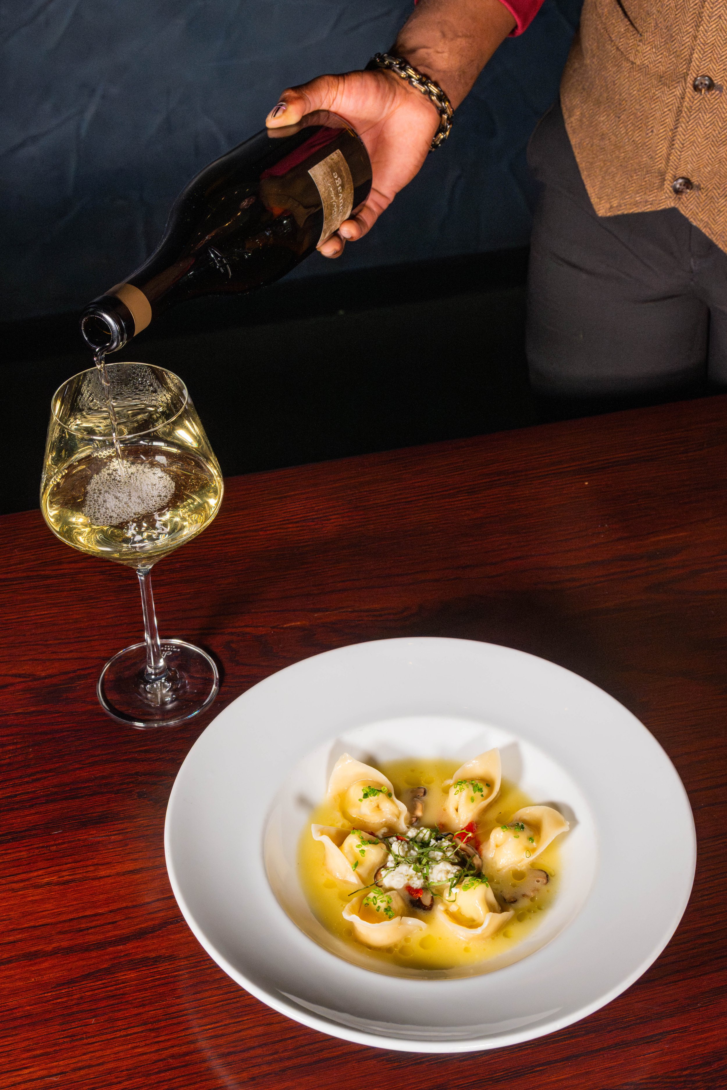 Goat Cheese Ravioli, White-Truffle Sauce, Garlic, Sundried Tomatoes, Basil, Chives paired with Sauvignon Blanc, Sancerre Sauvage Blanc, Pascal Jolivet, Loire Valley, France, 2023