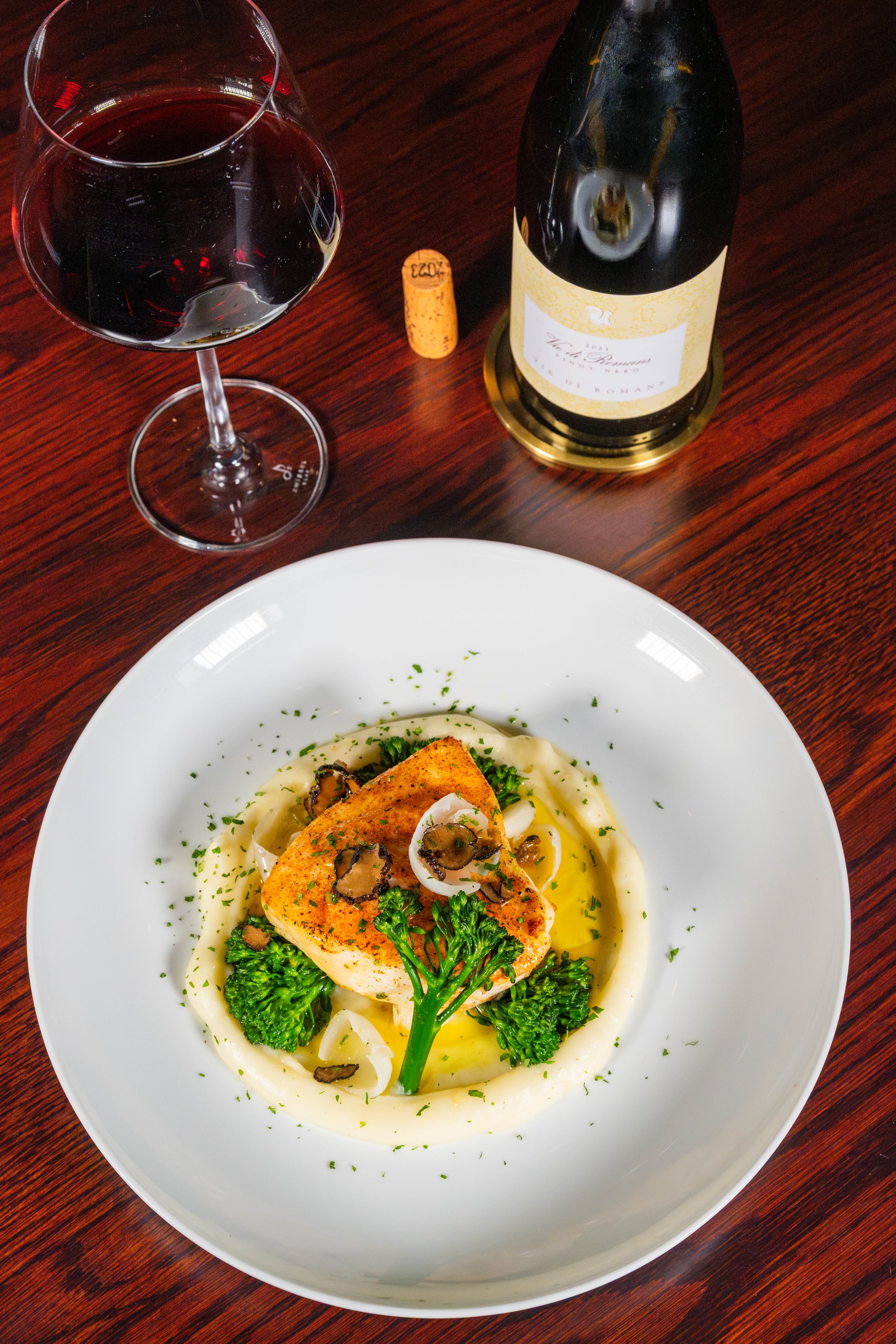 Cajun-Spiced Chilean Seabass, Whipped Potatoes, Sautéed Broccolini, Pearl Onions, Citrus Vinaigrette, Shaved Black Truffles paired with Pinot Nero, Vie di Romans, Friuli Isonzo, Italy 2021