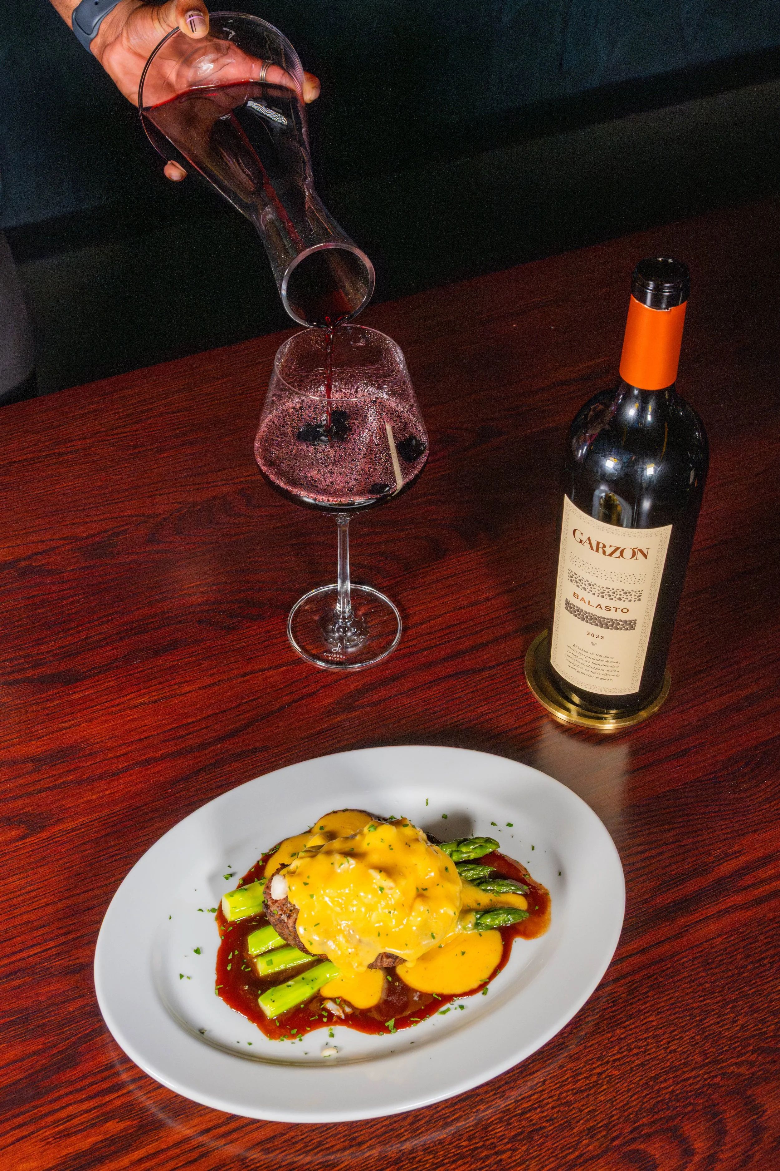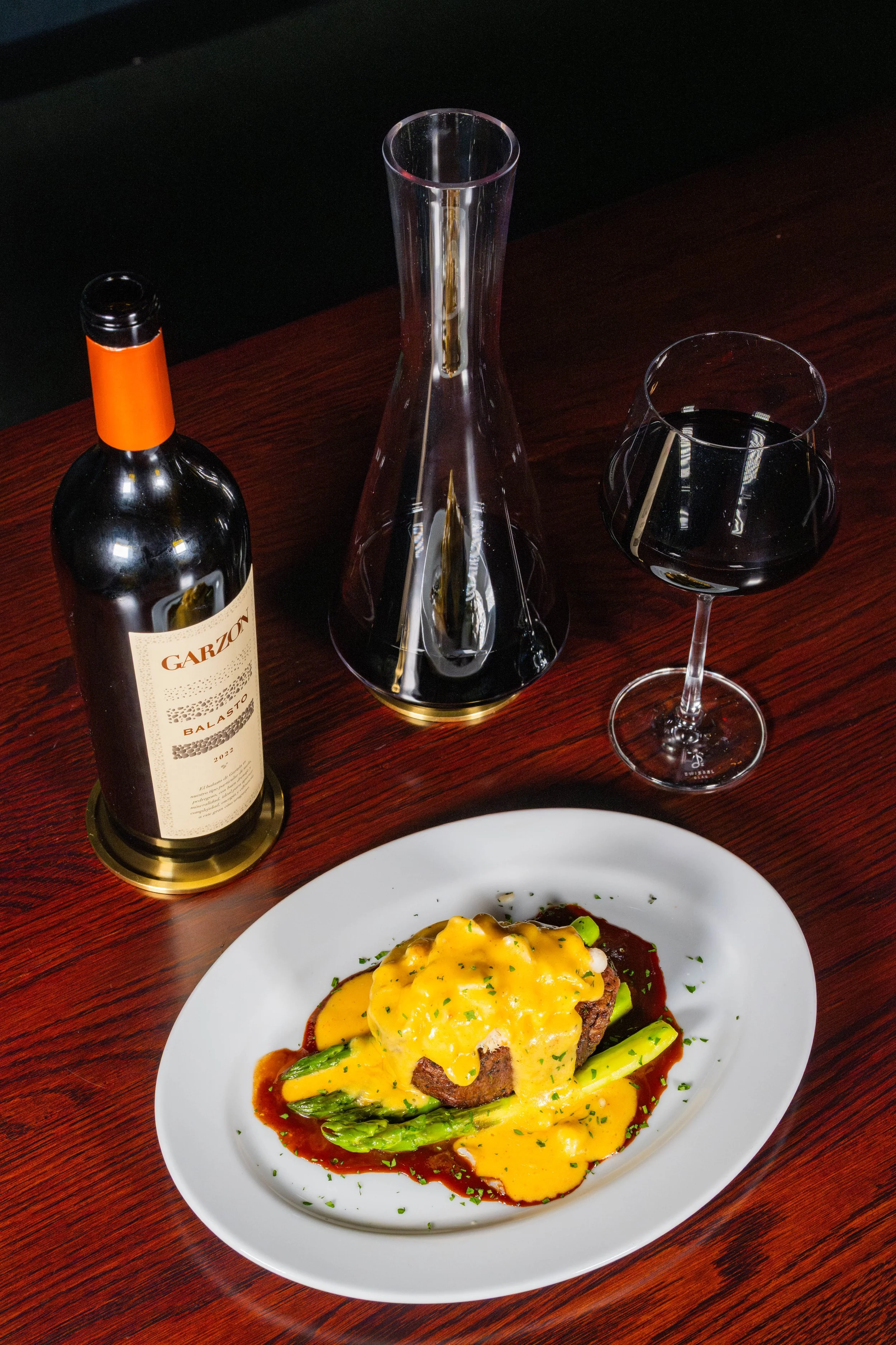 Prime Filet Mignon, Jumbo Lump Crab, Asparagus, Bernaise Sauce, Cabernet Jus paired with Tannat Blend, Balasto, Bodega Garzón, Uruguay, 2022