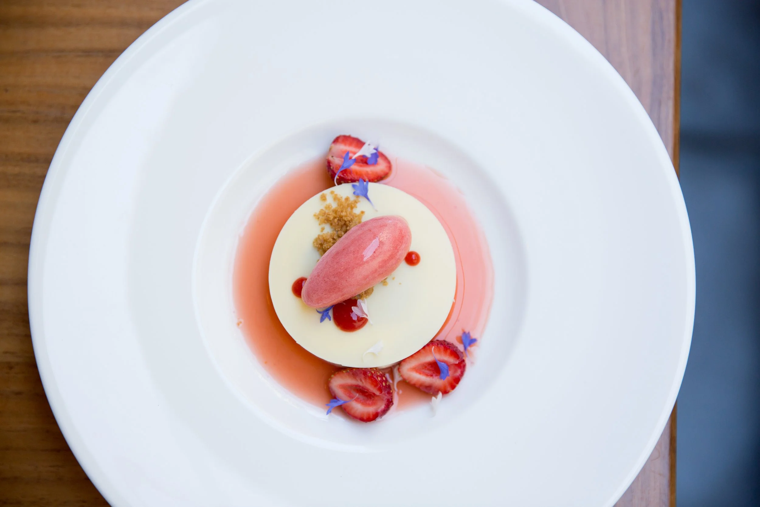 Strawberry Cheesecake: Harry's Berries Strawberries, Rhubarb-Ras el Hanout Syrup, Graham Cracker Crumbs, White Chocolate, and Strawberry Sorbet