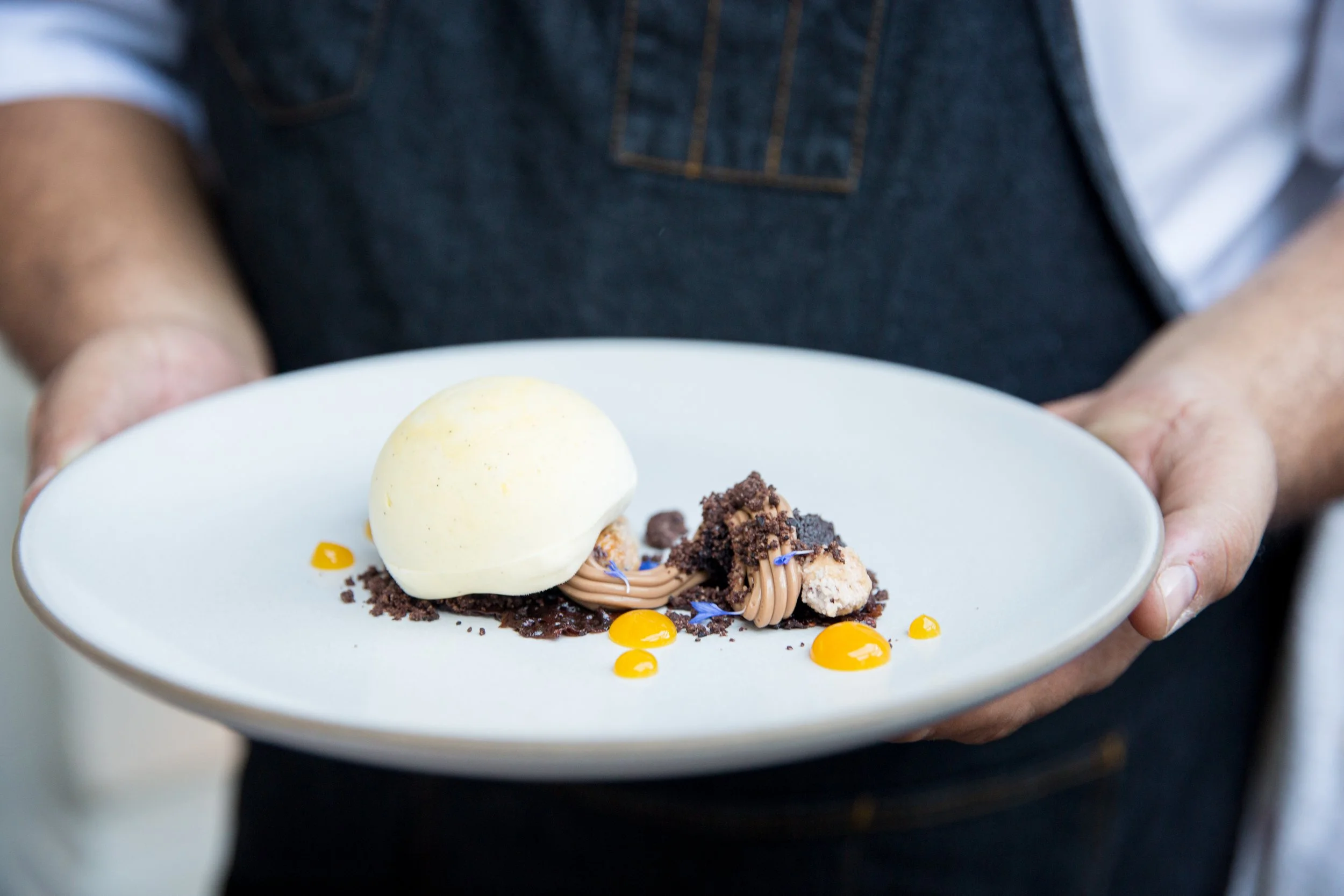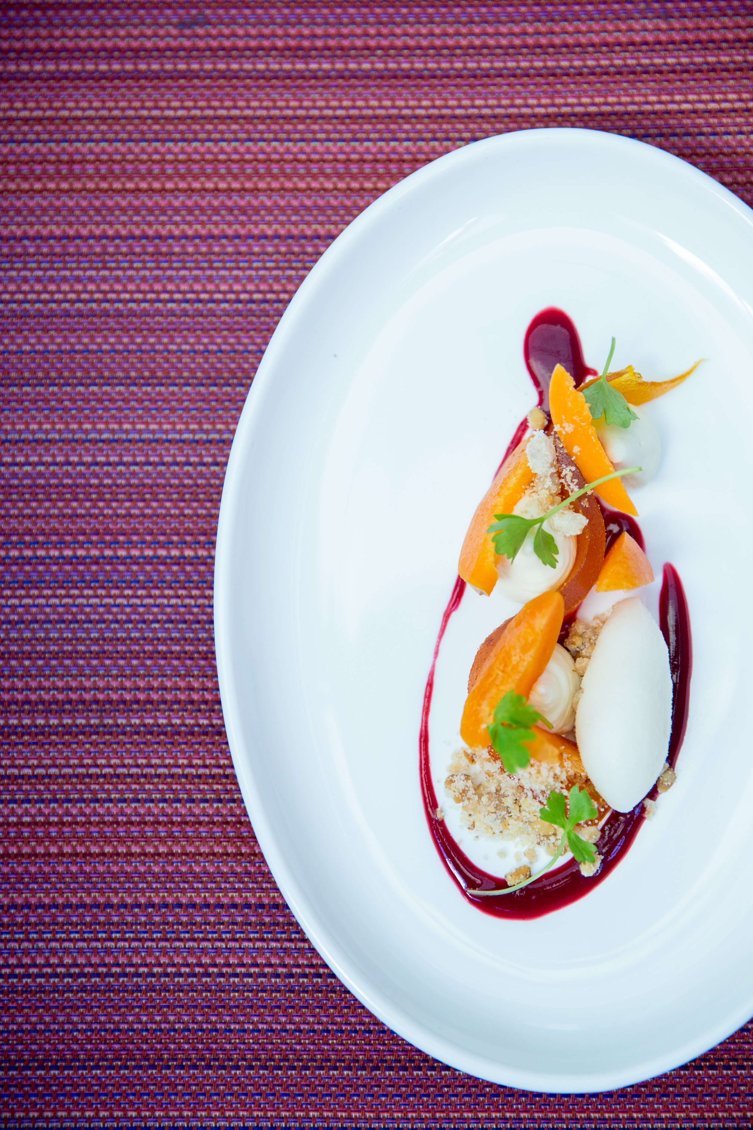 Oaxacan Peach: Mole Dulce, Condensed Milk Flan, Pepitas, Masa Cake Crumble, Burnt Canela Ice Cream, Micro Cilantro, and Marigold Petals