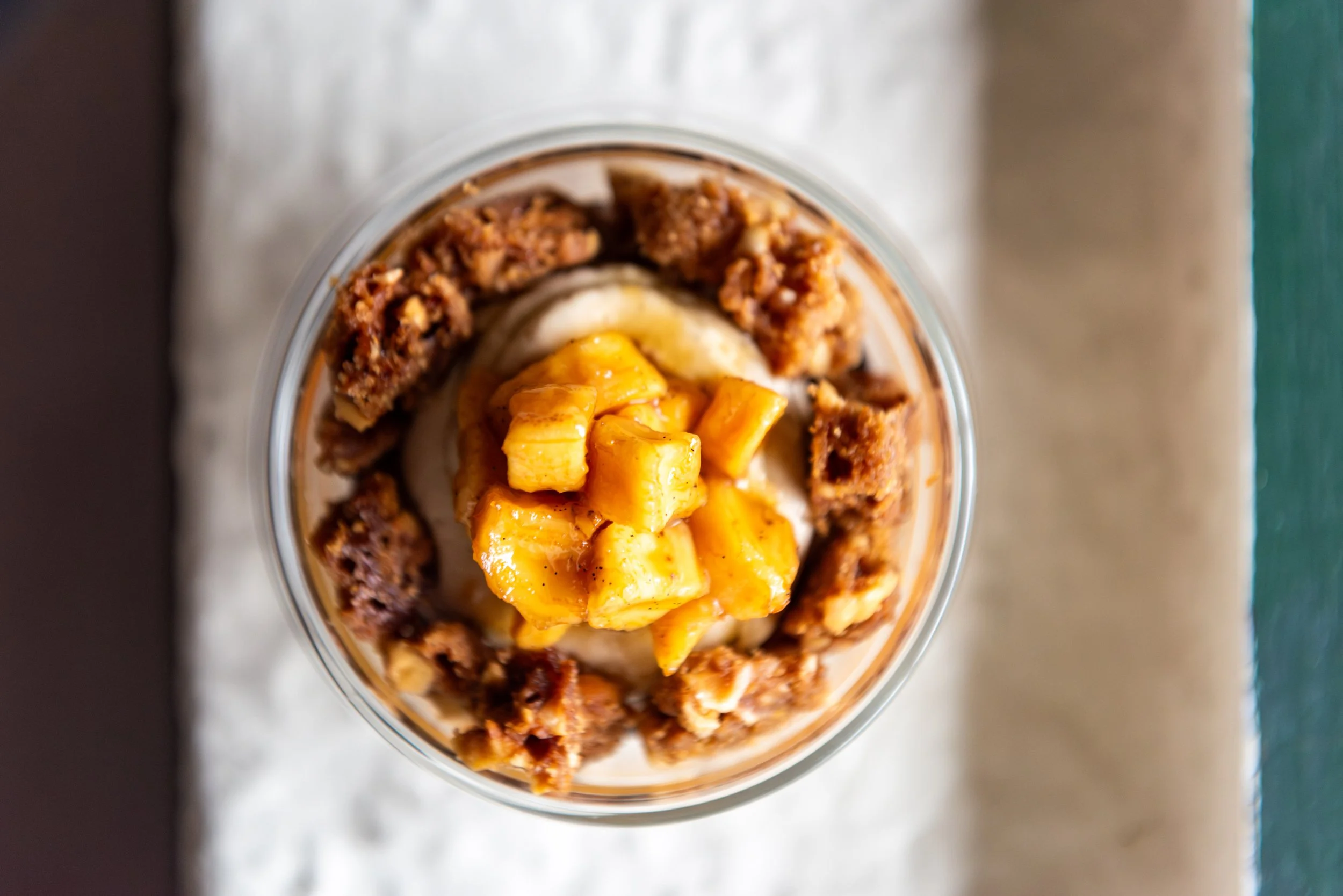 Japanese Whisky Baba, Sunflower Butter, Whipped Cream, Caramelized Banana, Vanilla Syrup, Hazelnut Crumb, Dark Chocolate