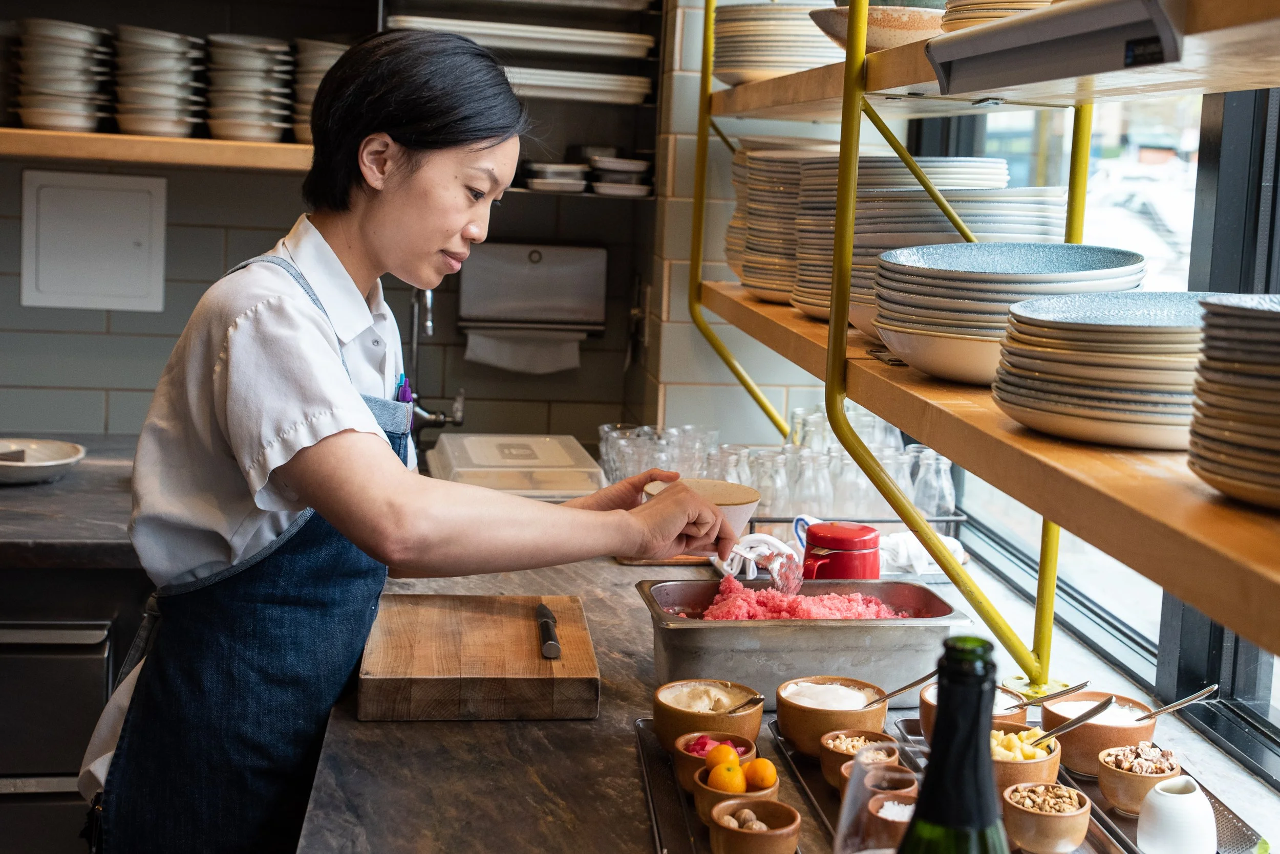 Rhubarb and Passionfruit Granita, Kumquat, Nutmeg, and Oat Mousse