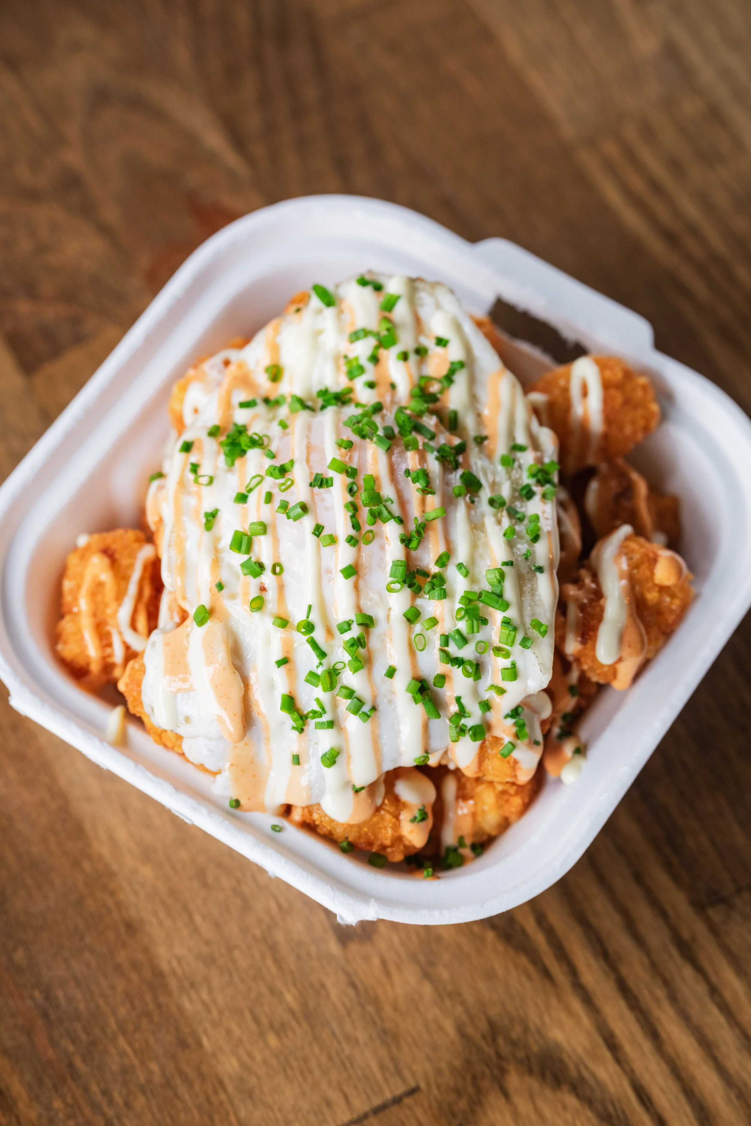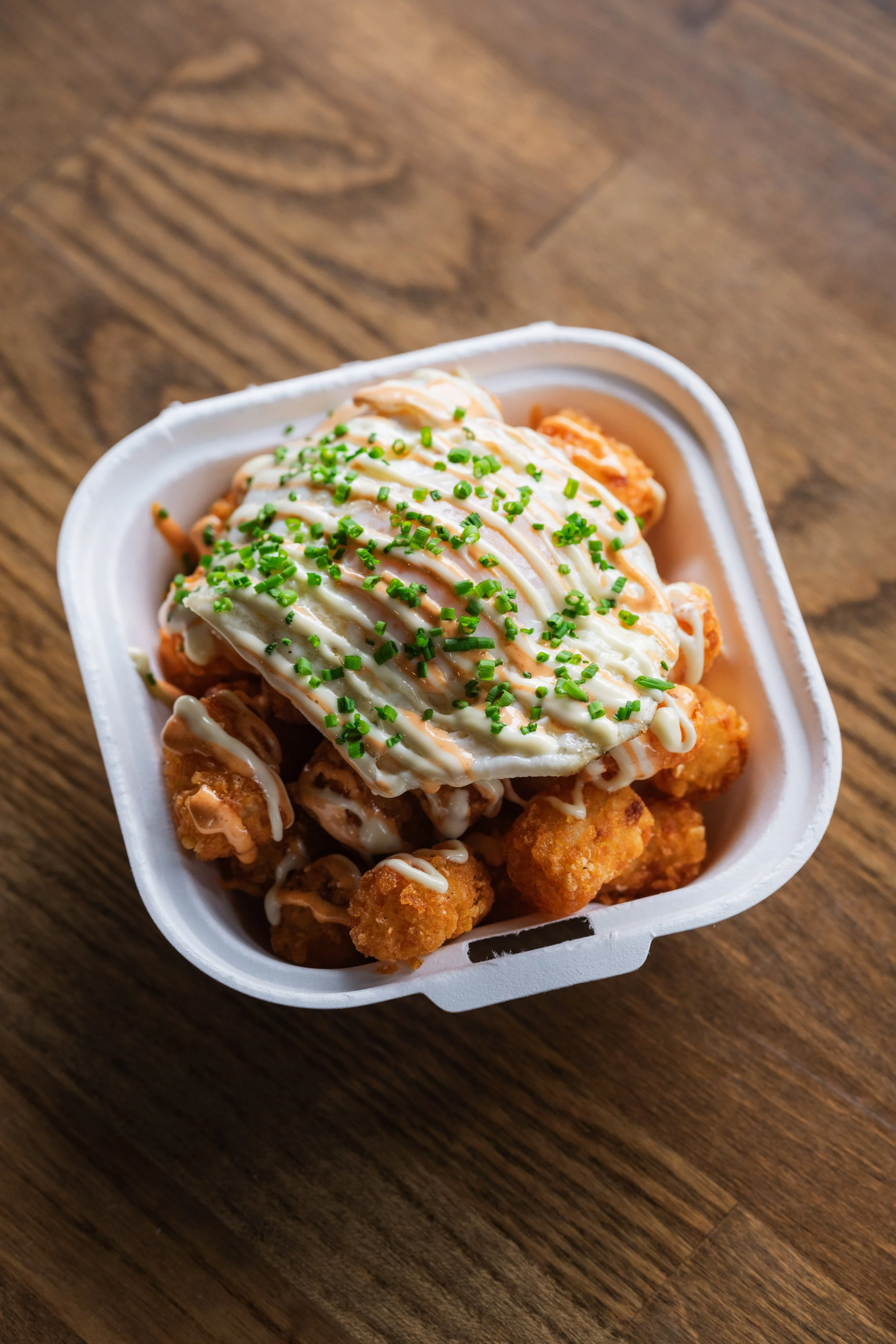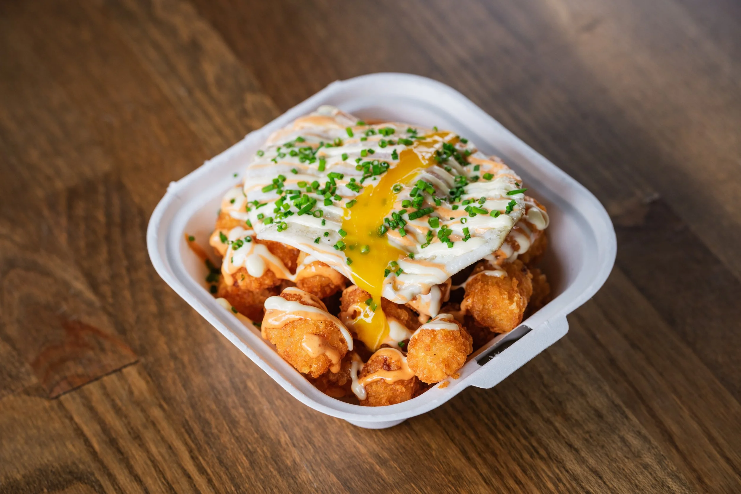 Eggy Tots: Creole-Spiced Tater Tots, Fried Egg, Spicy Aioli, Sweet Aioli, Chives