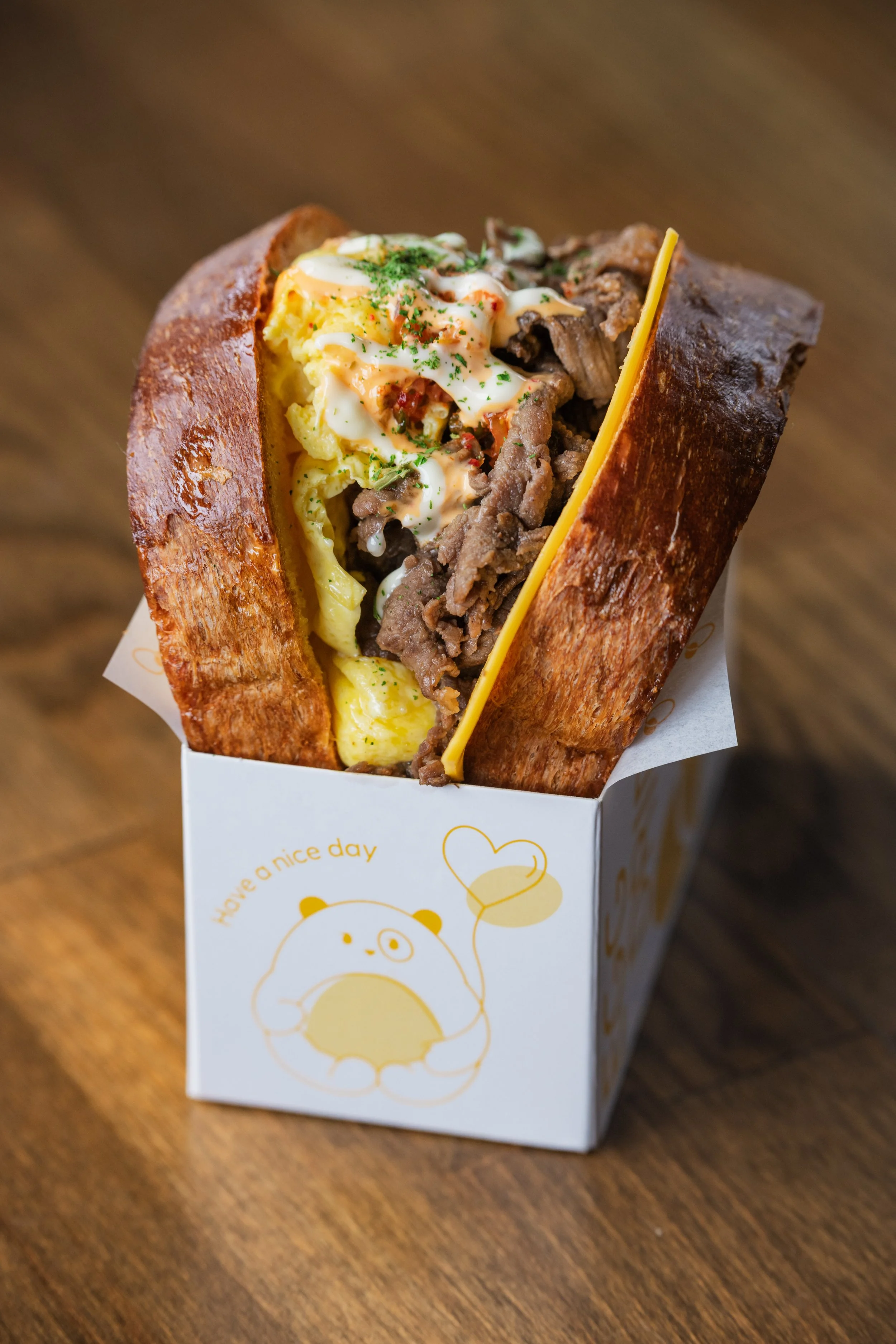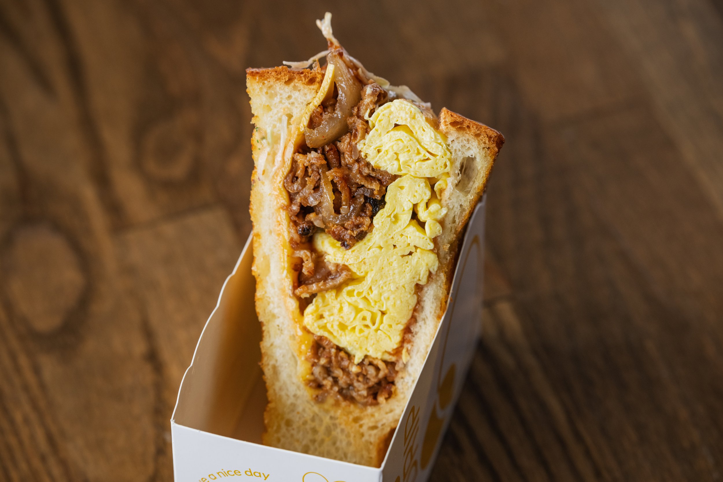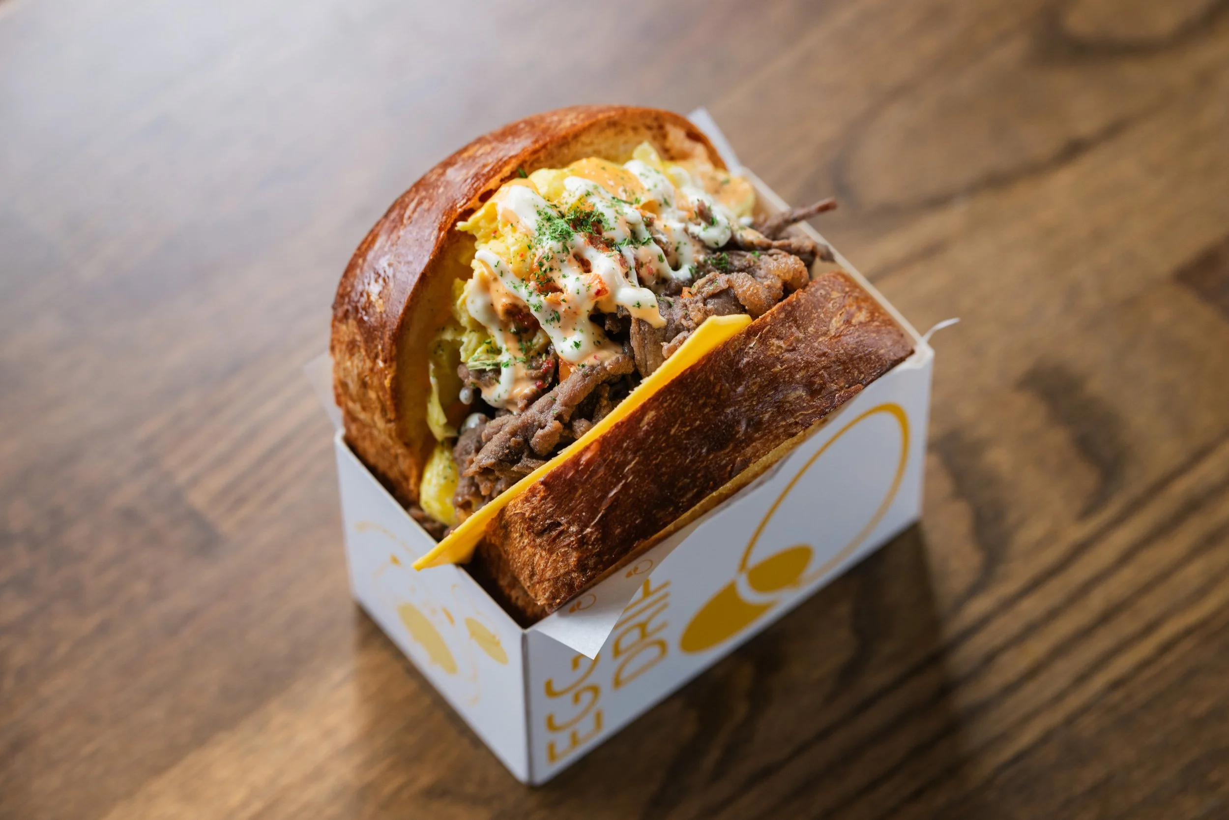 Oh My Gogi: Folded Scrambled Eggs, American Cheese, Beef Bulgogi, Kimchi, Kimchi Mayonnaise, Aïloi, Parsley, Toasted Honey-Garlic Butter Milk Bread