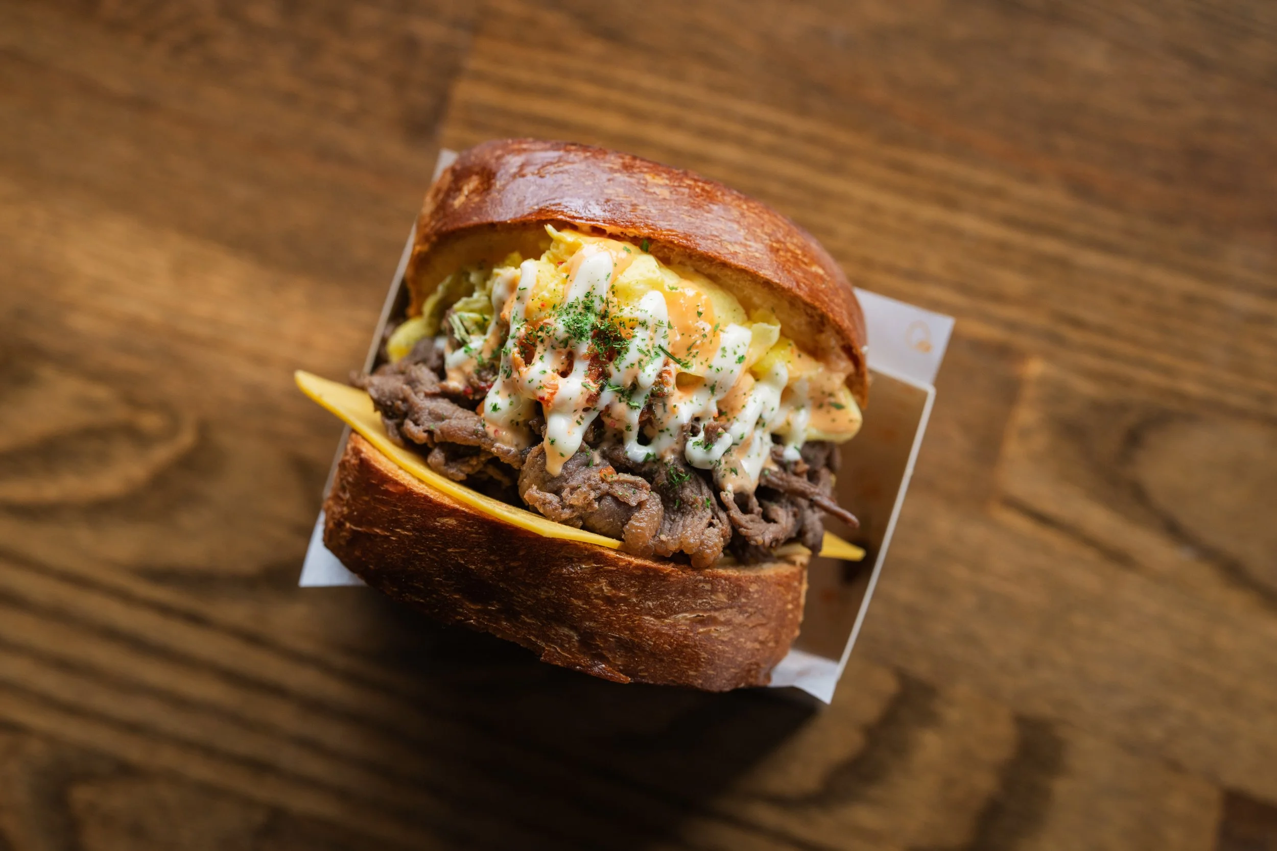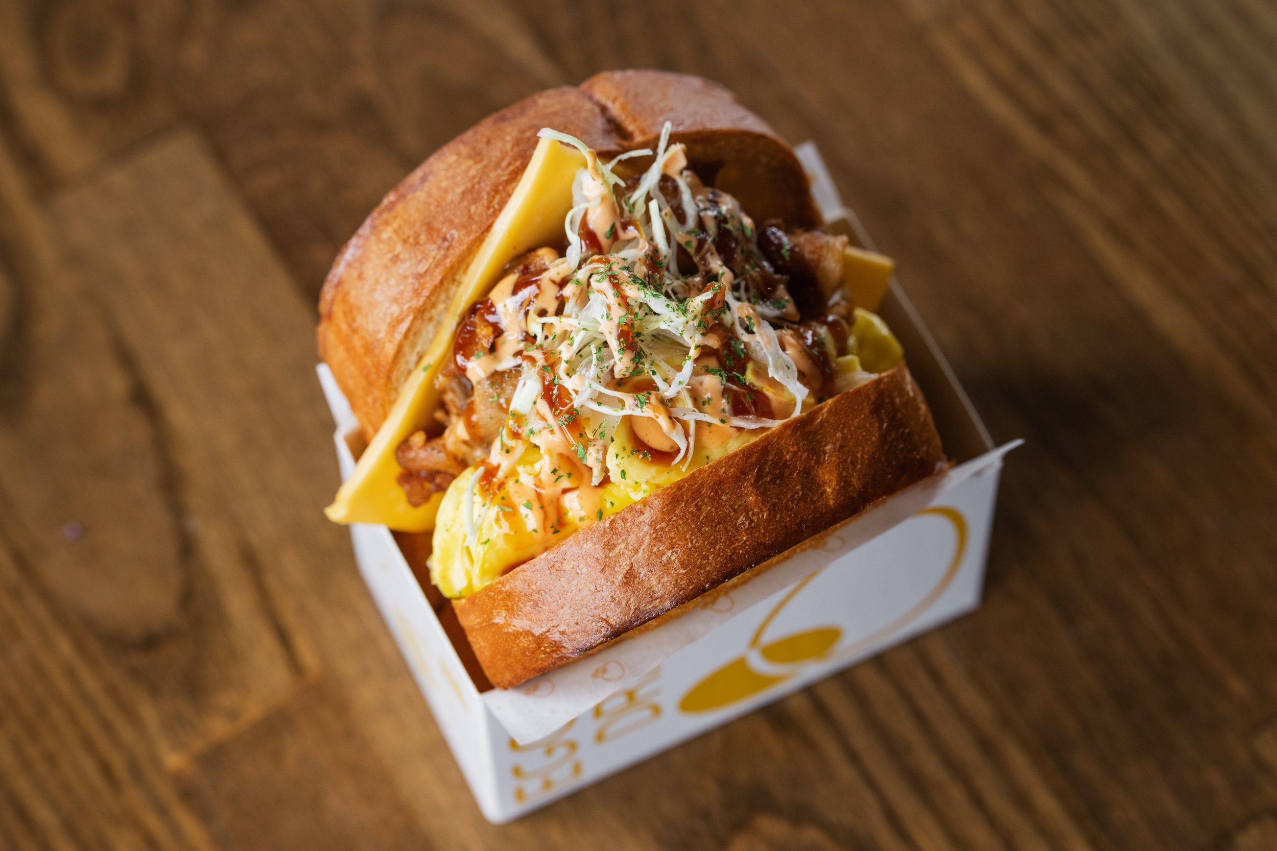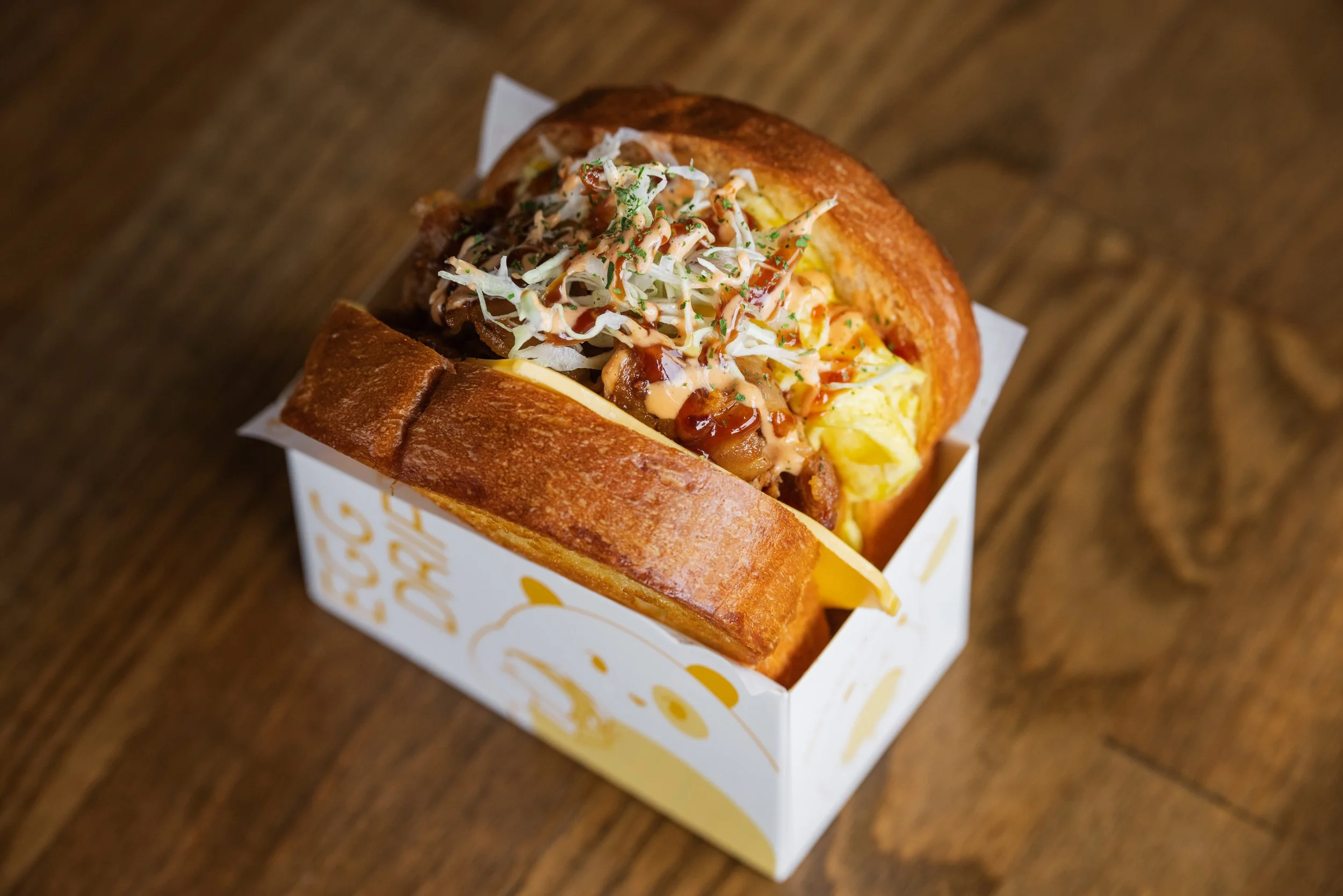 Playin’ Dirty: Folded Scrambled Eggs, American Cheese, Spicy Pork Belly, Shredded Cabbage, Spicy Aioli, Okonomiyaki Sauce, Toasted Honey-Garlic Butter Milk Bread