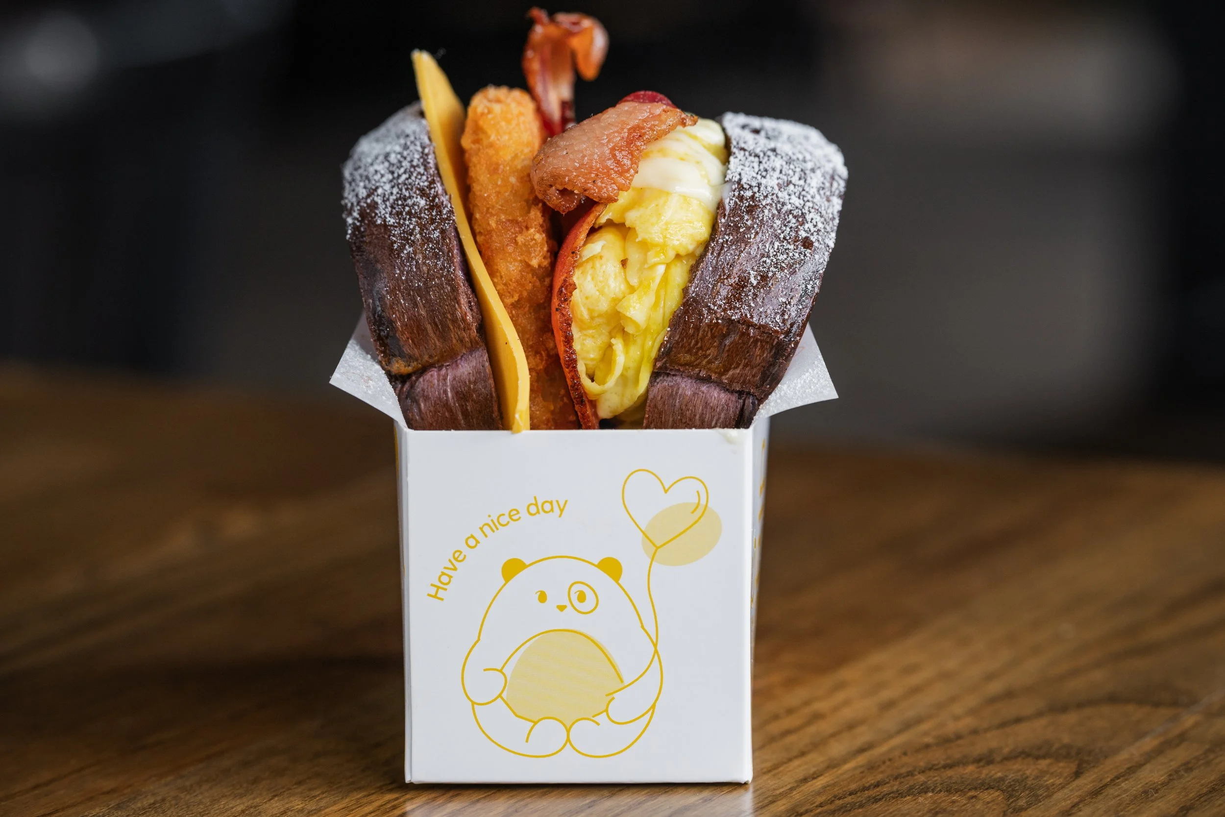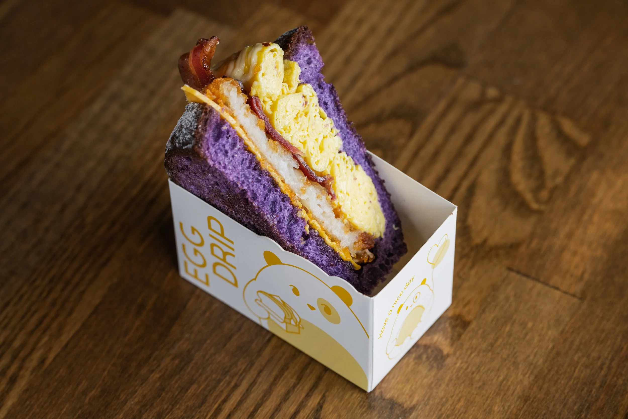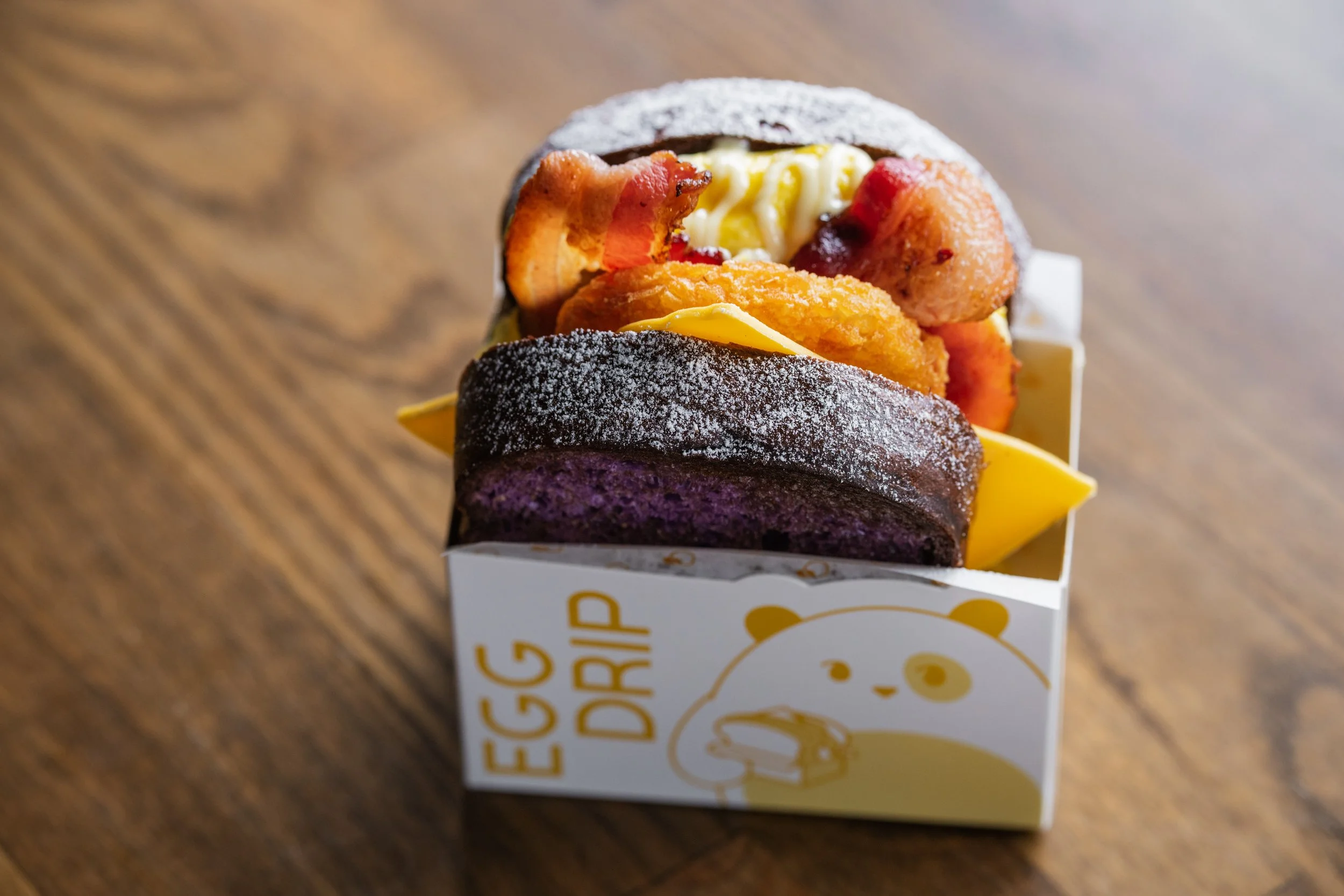 Ube-Bee: Folded Scrambled Eggs, American Cheese, Applewood-Smoked Bacon, Hashbrown Patty, Miso Maple Syrup, Ailoi, Powdered Sugar, Cinnamon Sugar-Coated Ube Milk Bread