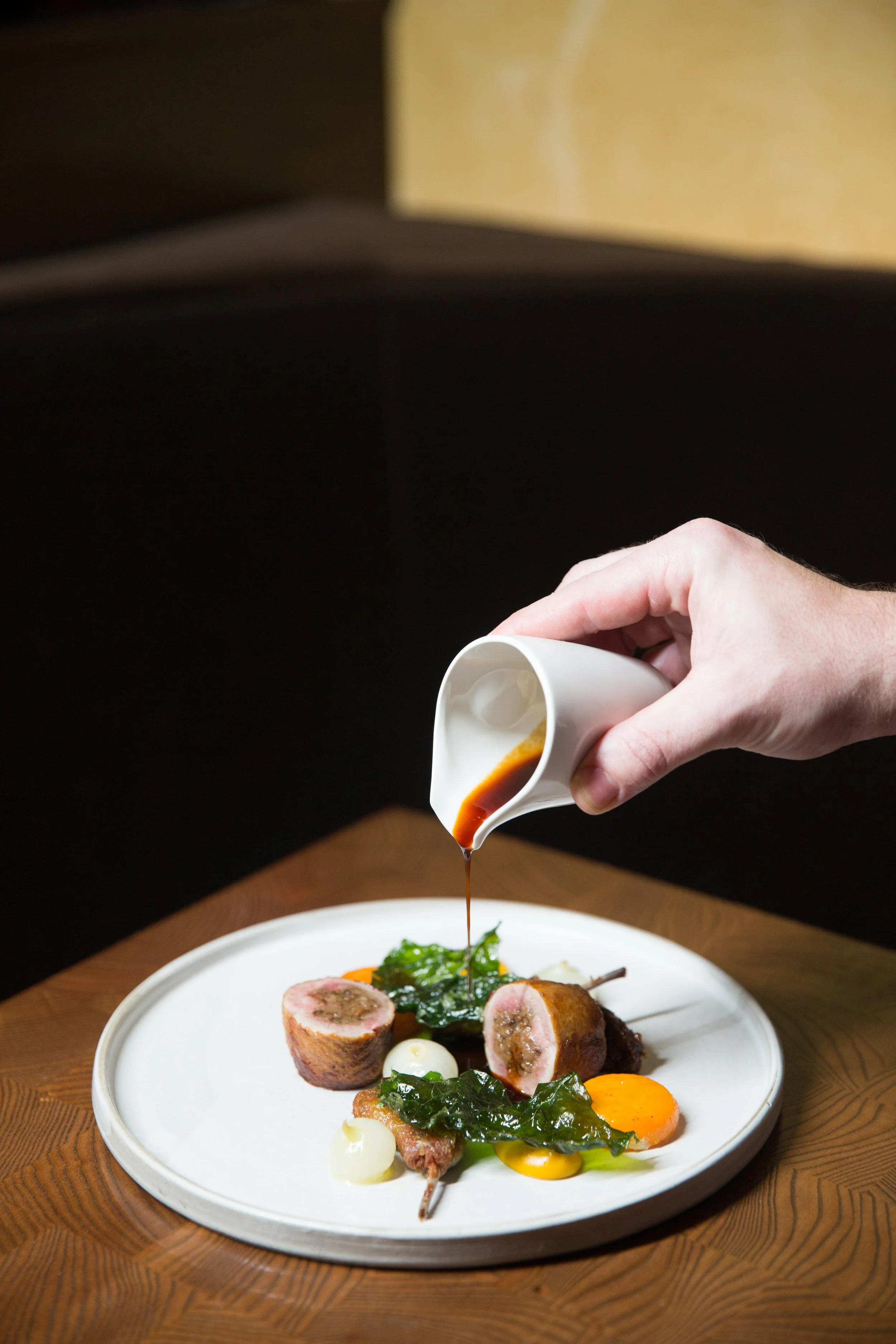 Quail Ballotine, Duck-Quail-Porcini Farce, Roasted Sweet Potatoes, Sweet Potato Purée, Cippolinis, Bacon Jam, and Madeira Jus