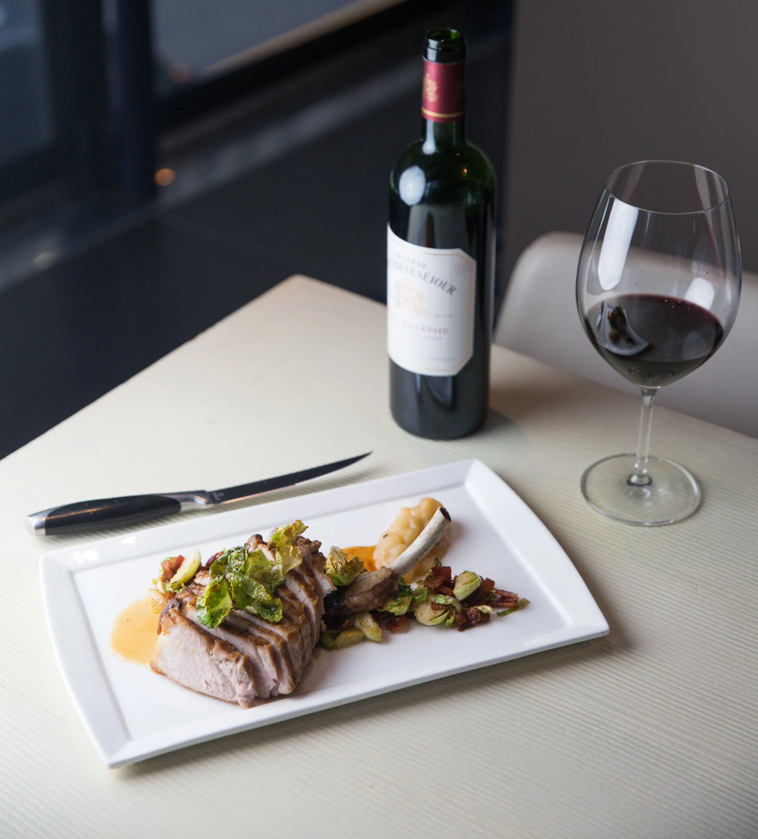 Pork Chop, Apple Purée, Brussels Sprouts, Bacon, and Natural Jus