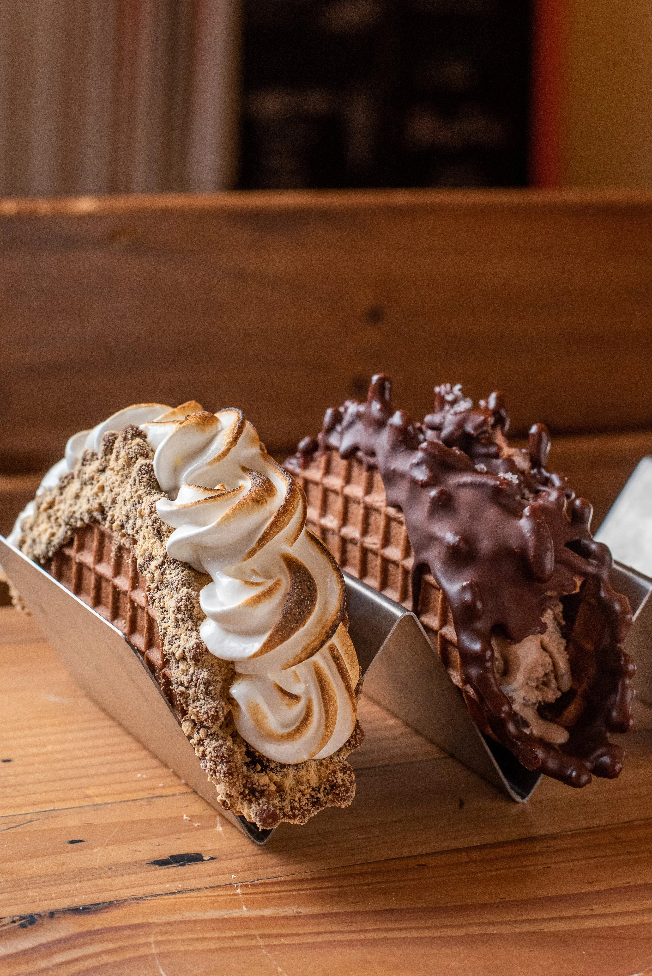 Choco Tacos: (1) Chocolate Waffle Cone, Malted Vanilla Ice Cream, Taza Dark Chocolate Dip, Toasted Marshmallow; (2) Waffle Cone, Stracciatella Ice Cream, Caramel, Toasted Pecans, Taza Milk Chocolate Dip, Sea Salt