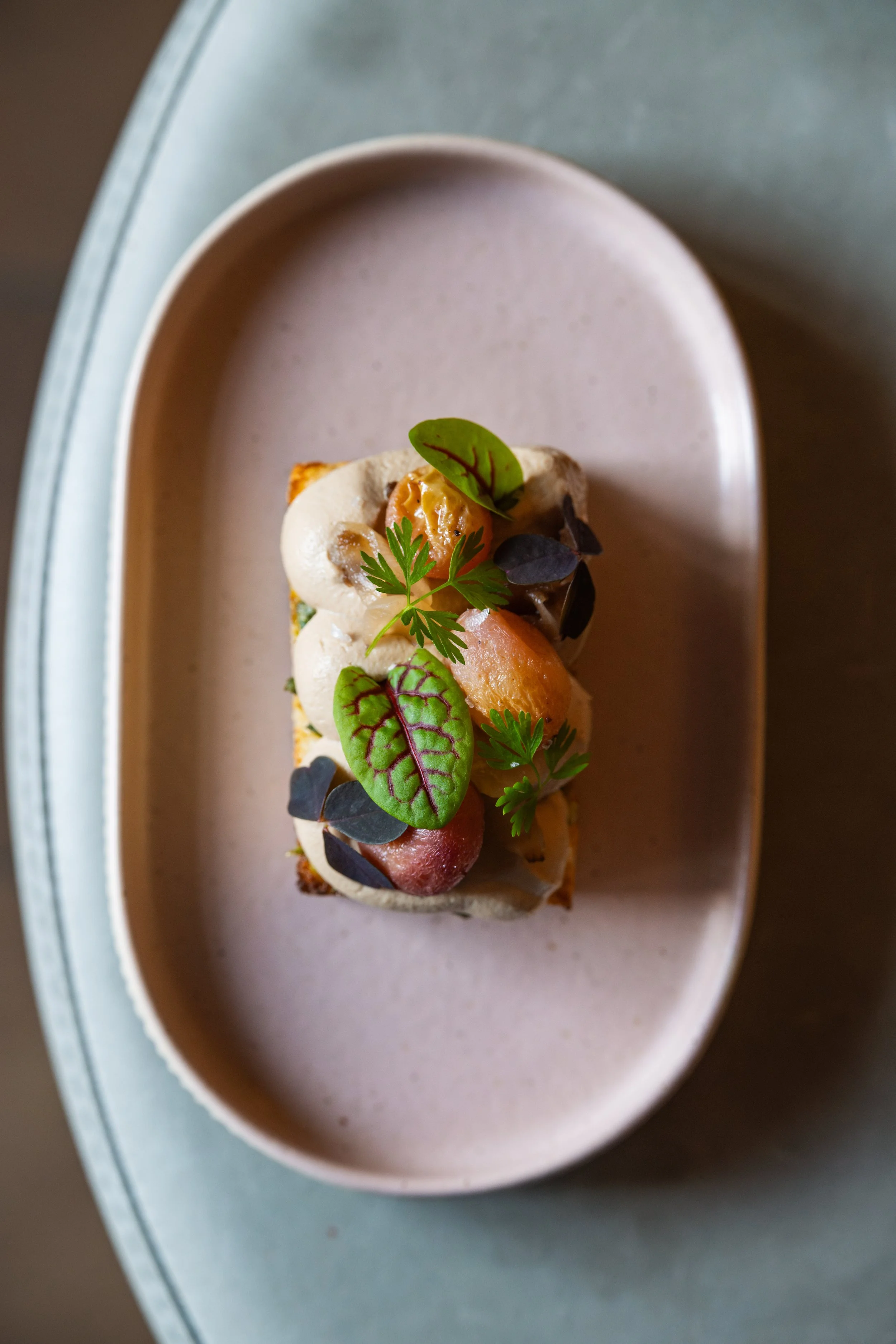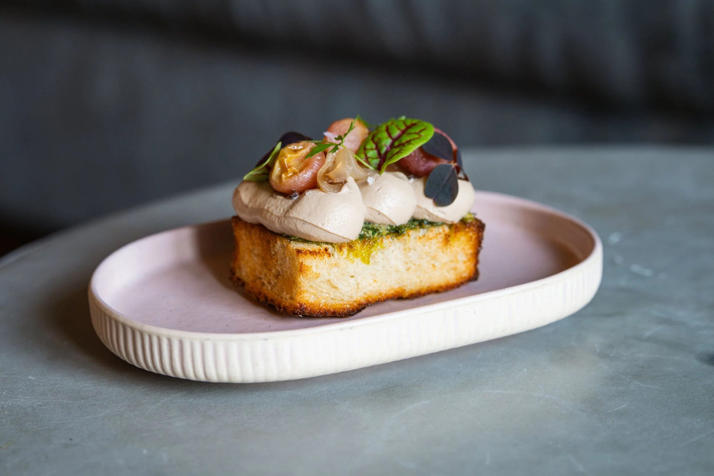 Chicken Liver Mousse, Roasted Grapes, Shallots, Walnut Pesto, Balsamic Vinegar, Raspberry Vinegar, Honey-Fermented Garlic Focaccia