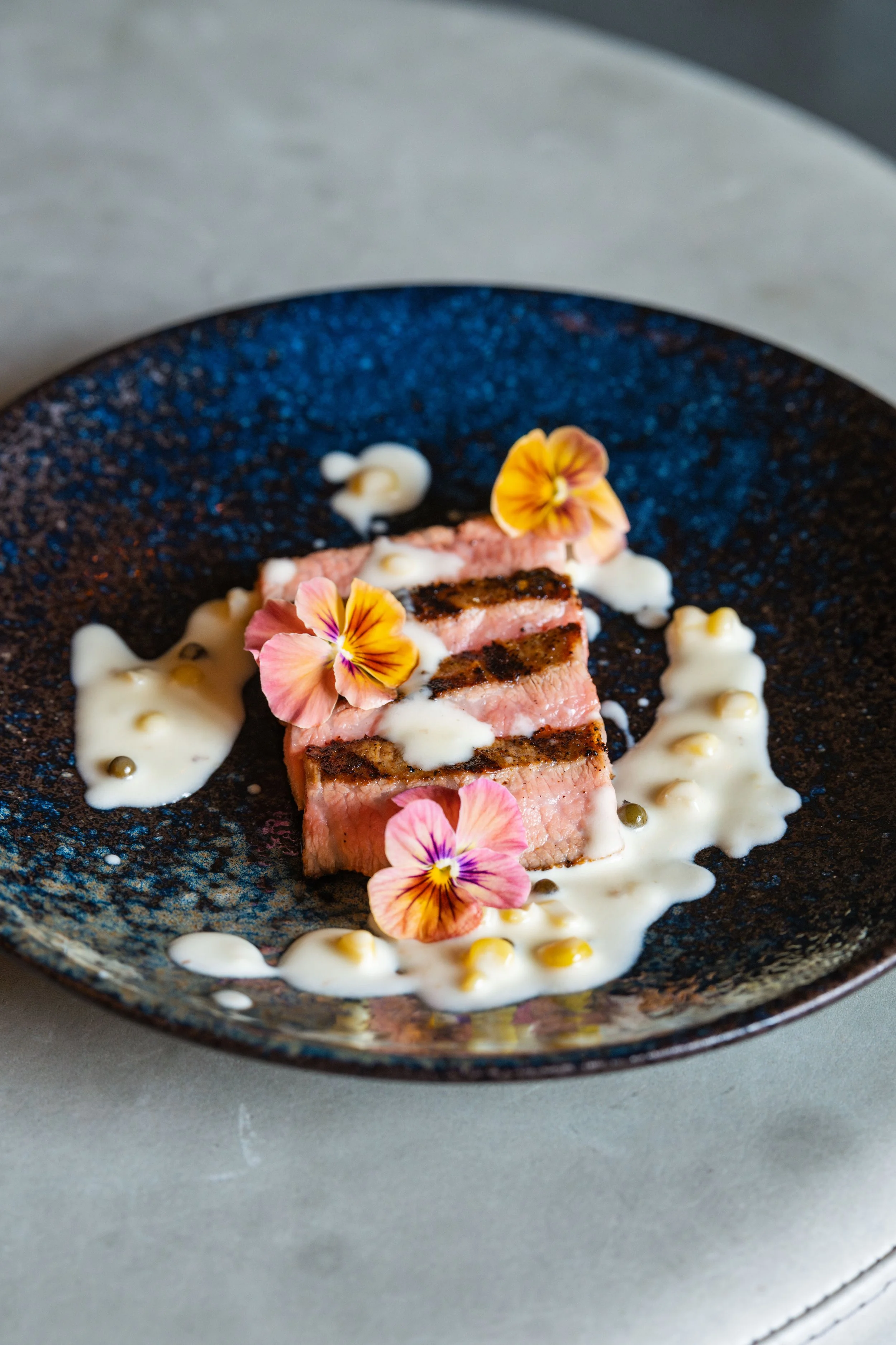 Grilled Ibérico Pork Loin, Green Peppercorn-Pickled Corn Cream Sauce, Edible Flowers