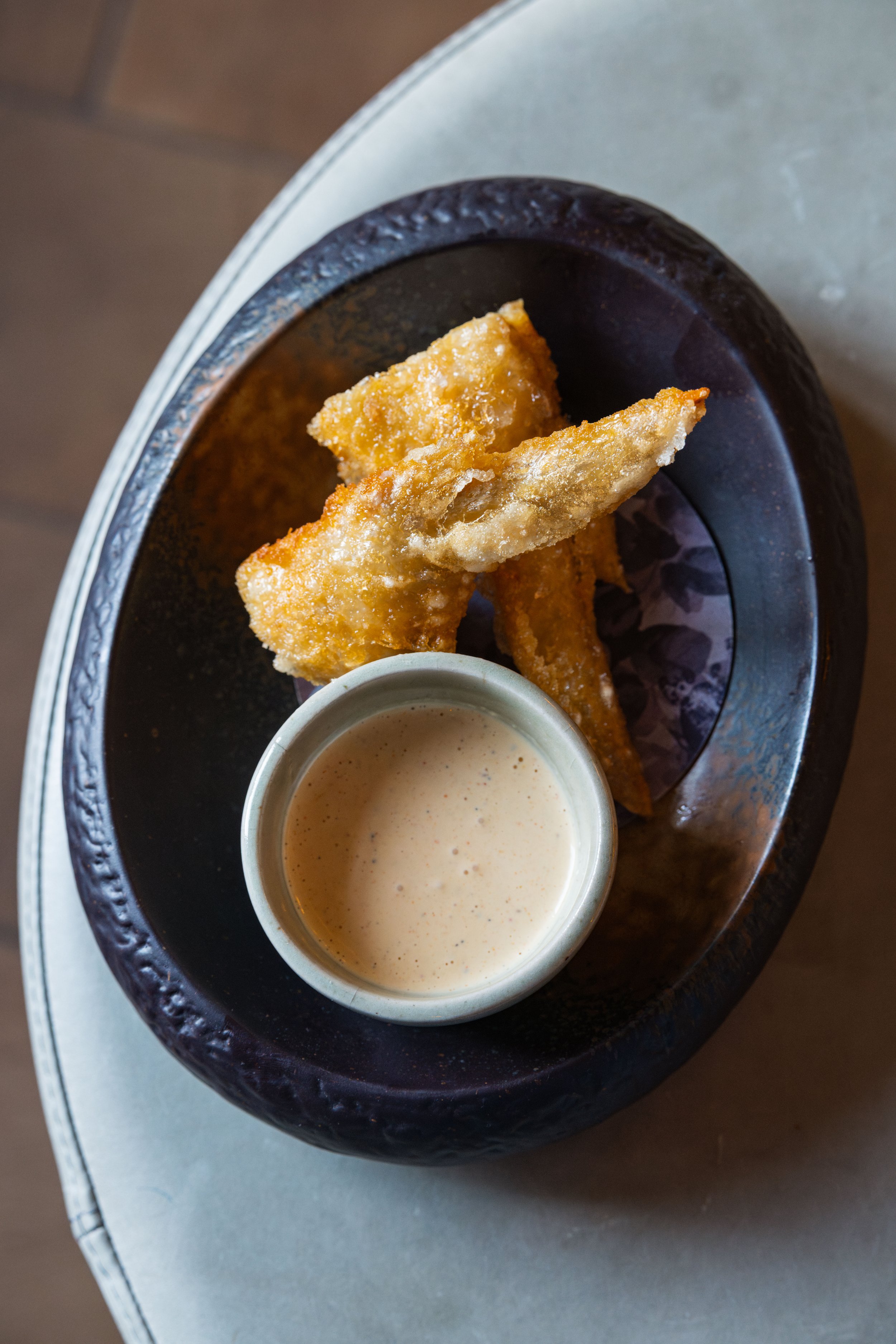 Tebasaki Gyoza: Fried Chicken Wing, Shrimp-Ginger Filling, Thai Curry, Alabama White Barbecue Sauce