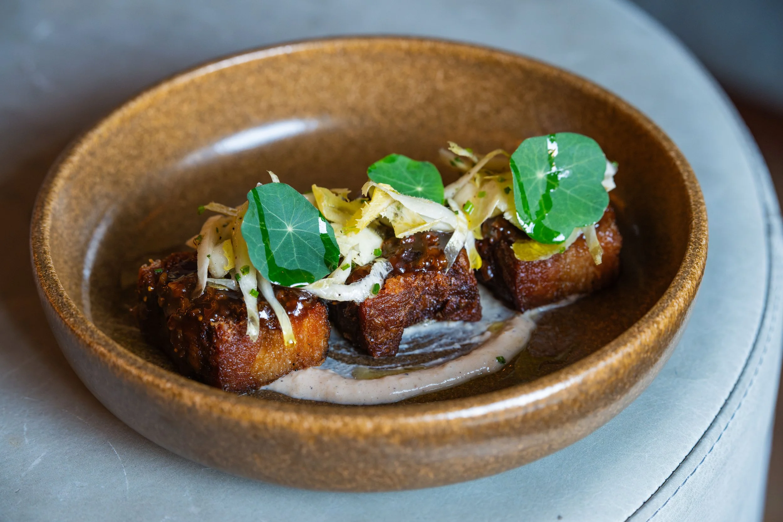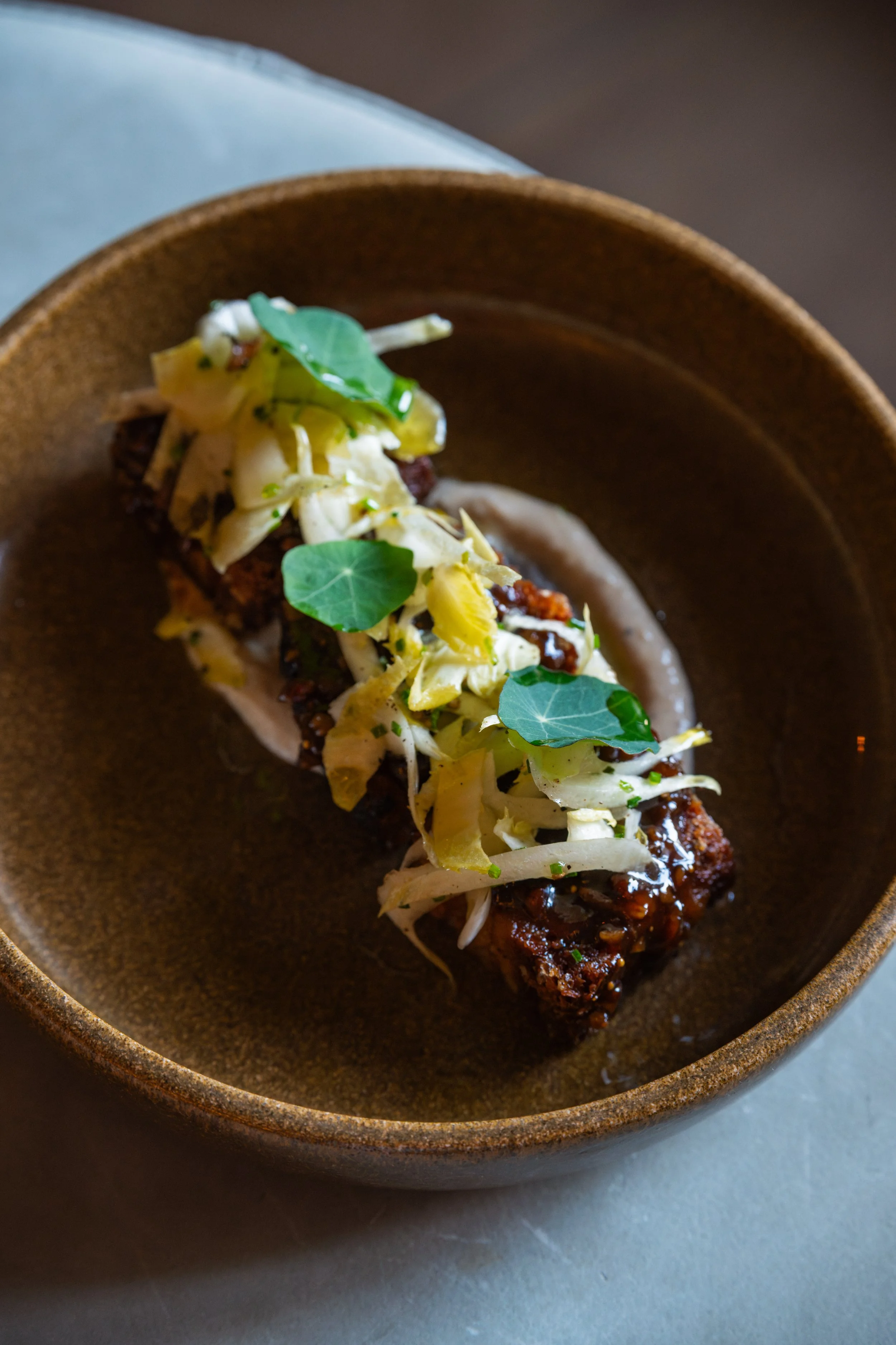 Crispy Pork Belly, Smoked Garlic-Herb Greek Yogurt, Mesquite-Smoked Pecan-Fig Jam, Endive Salad, Yuzu Olive Oil