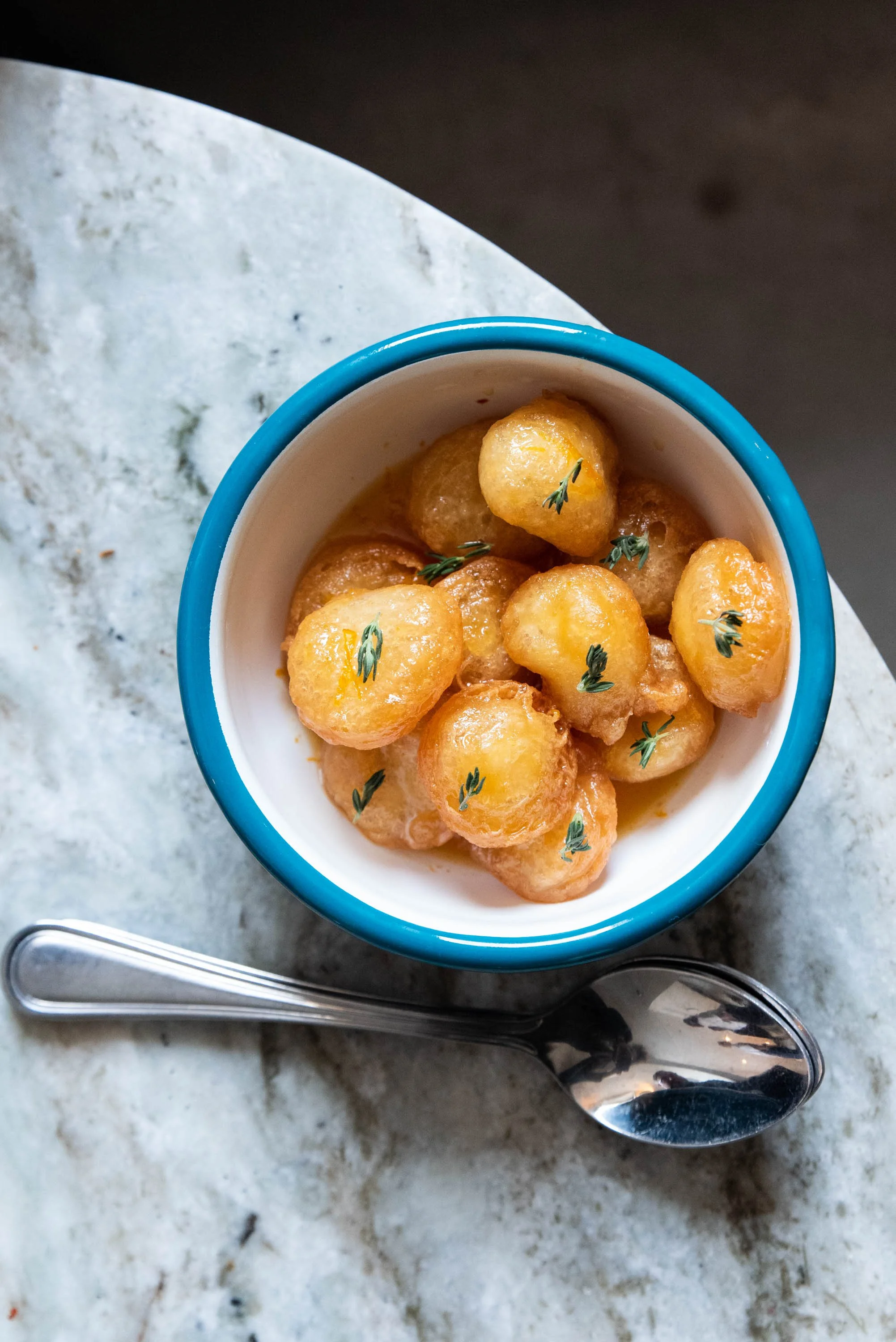 Noosh’s Pick Kebabs: unchoke with Lemon Zhug, Chicken with Ajika Red Yogurt, Pork with Yellow Harissa, Noosh Halloumi with Szechuan Rose Honey, and Lamb Shoulder with Herbed Yogurt