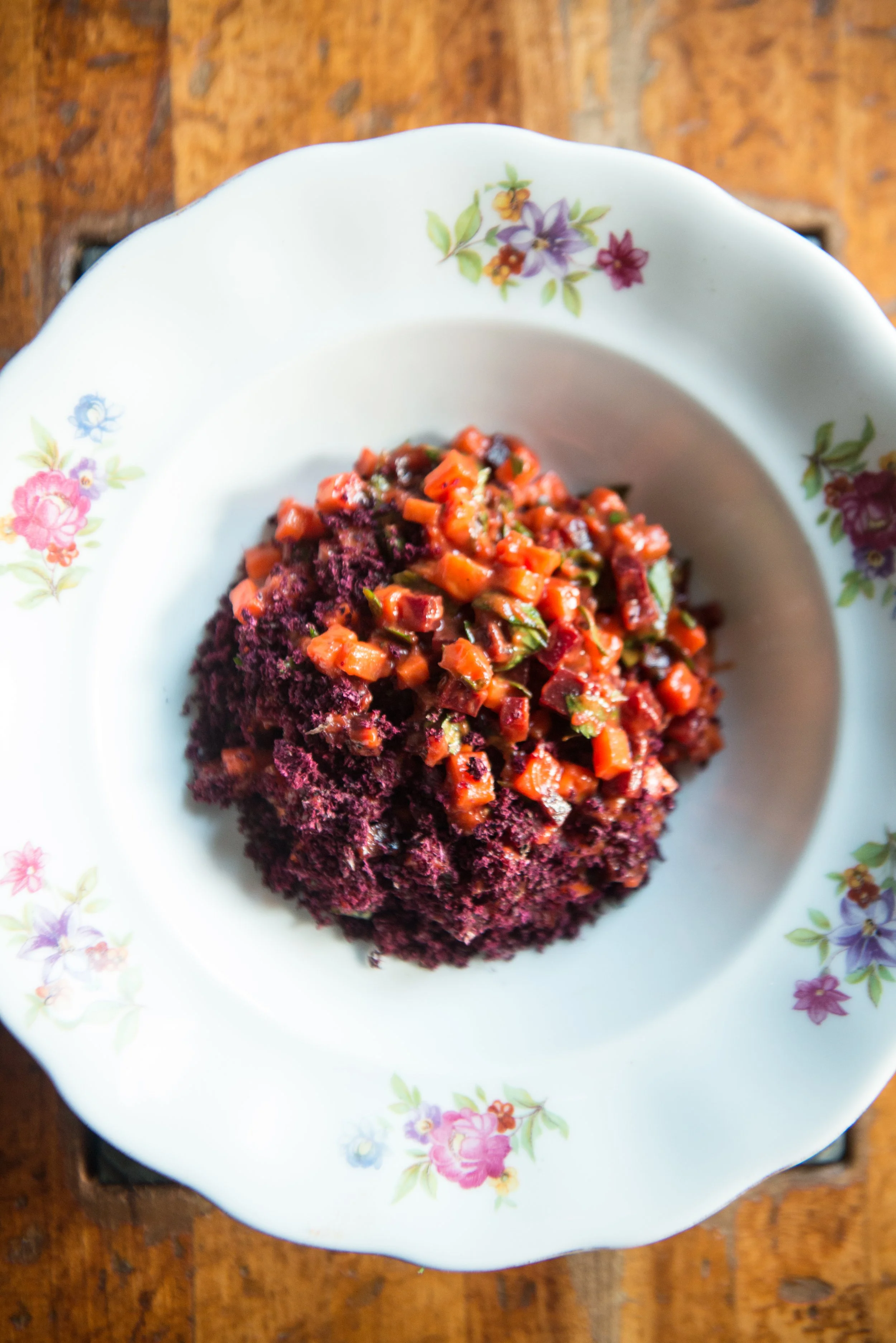 Carrot-Beet Tartare, Sourdough Breadcrumbs, Chervil, Sherry Vinegar, and Dehydrated Beets and Carrots