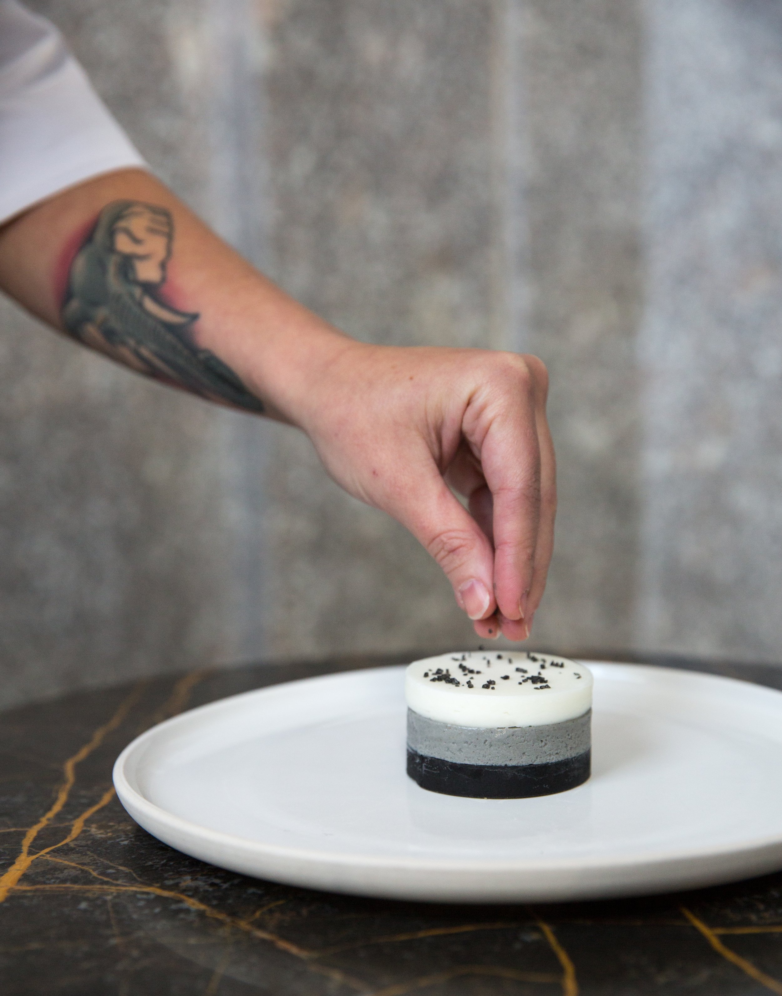 Dark Chocolate Ice Cream, Coffee Vinegar, Coffee Meringue, Cacao Nibs, Coffee Granita, and Browned Milk Solids