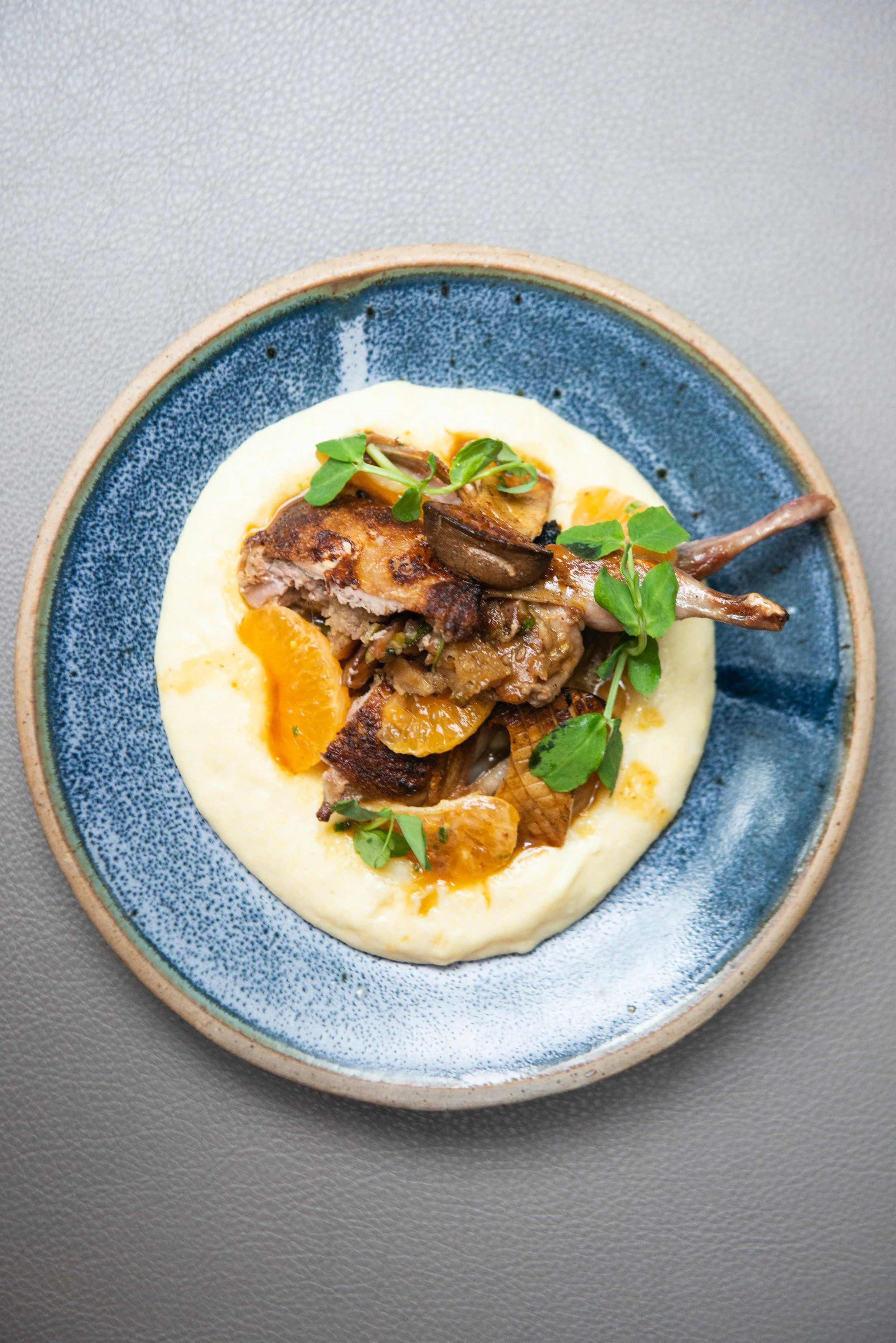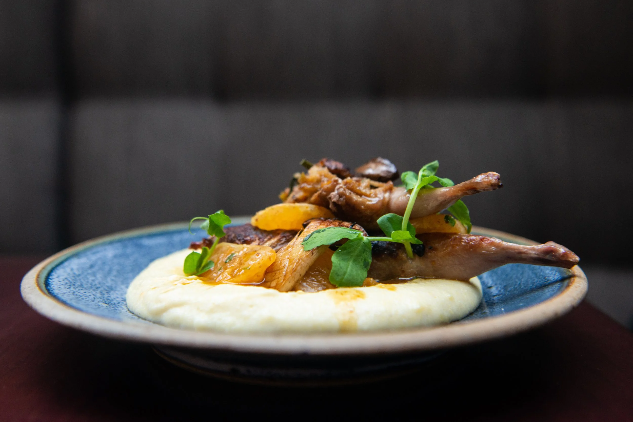 Mushroom, Chestnut, and Freekeh Bread-stuffed Quail, Smoked Polenta, Mustard Tangerine Vinaigrette