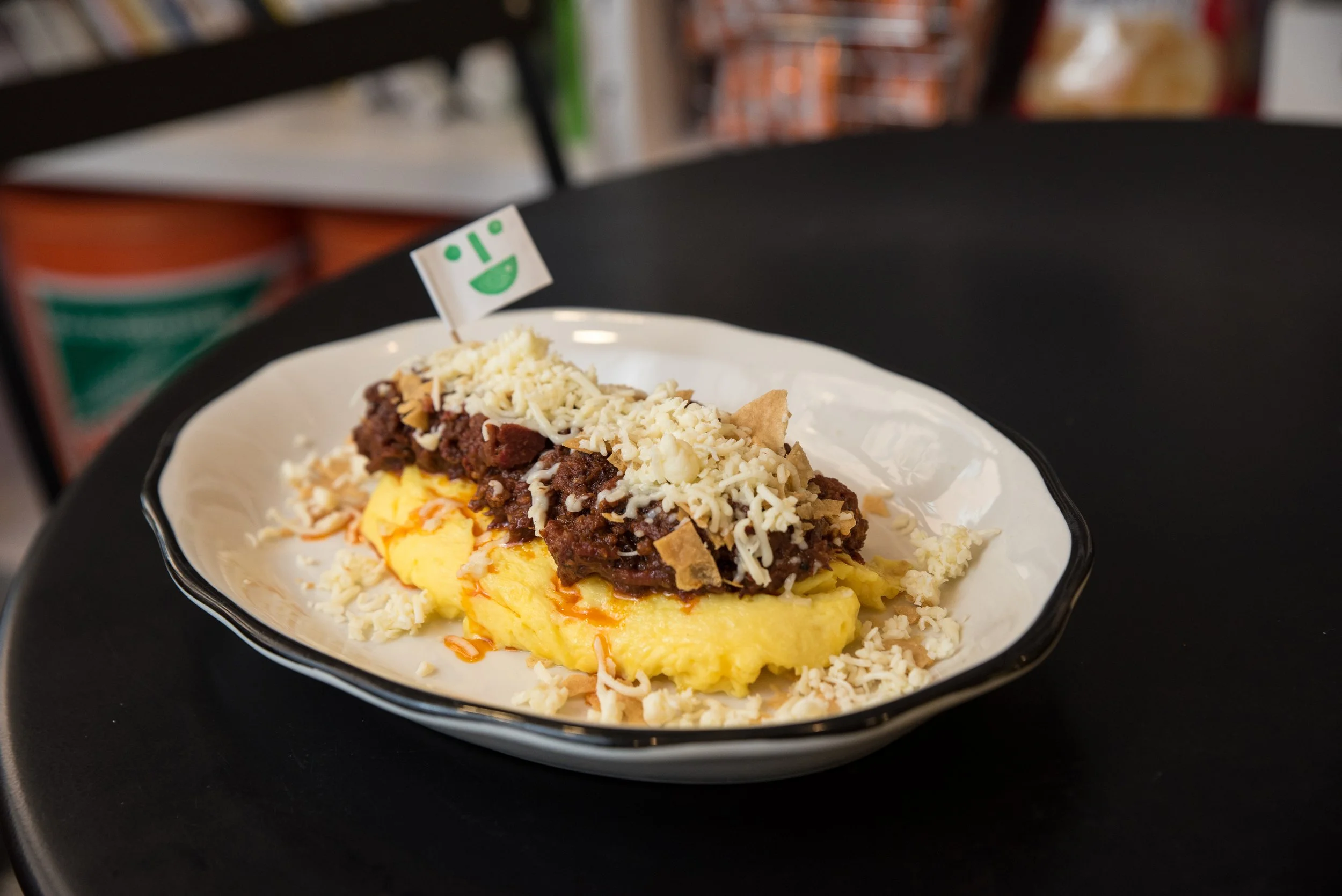 Corned Beef Chili, Eggs, Cooper Sharp American Cheese, and Tortilla Chips