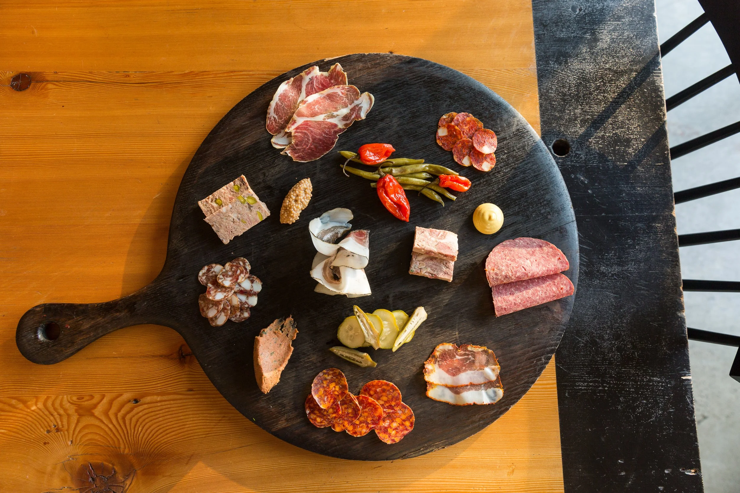 Charcuterie Board: Dry Cured Pepperoni, Lonza, Spicy Pork Salumi, Truffle Salumi, Turkey Country Paté, Coppa, Lardo, Goat Rillettes, Beef Summer Sausage, Head Cheese, Dijon Mustard, Pickled Mustard Seed, Pickled Vegetables, Dill Pickles, and Aji Dulce Chiles