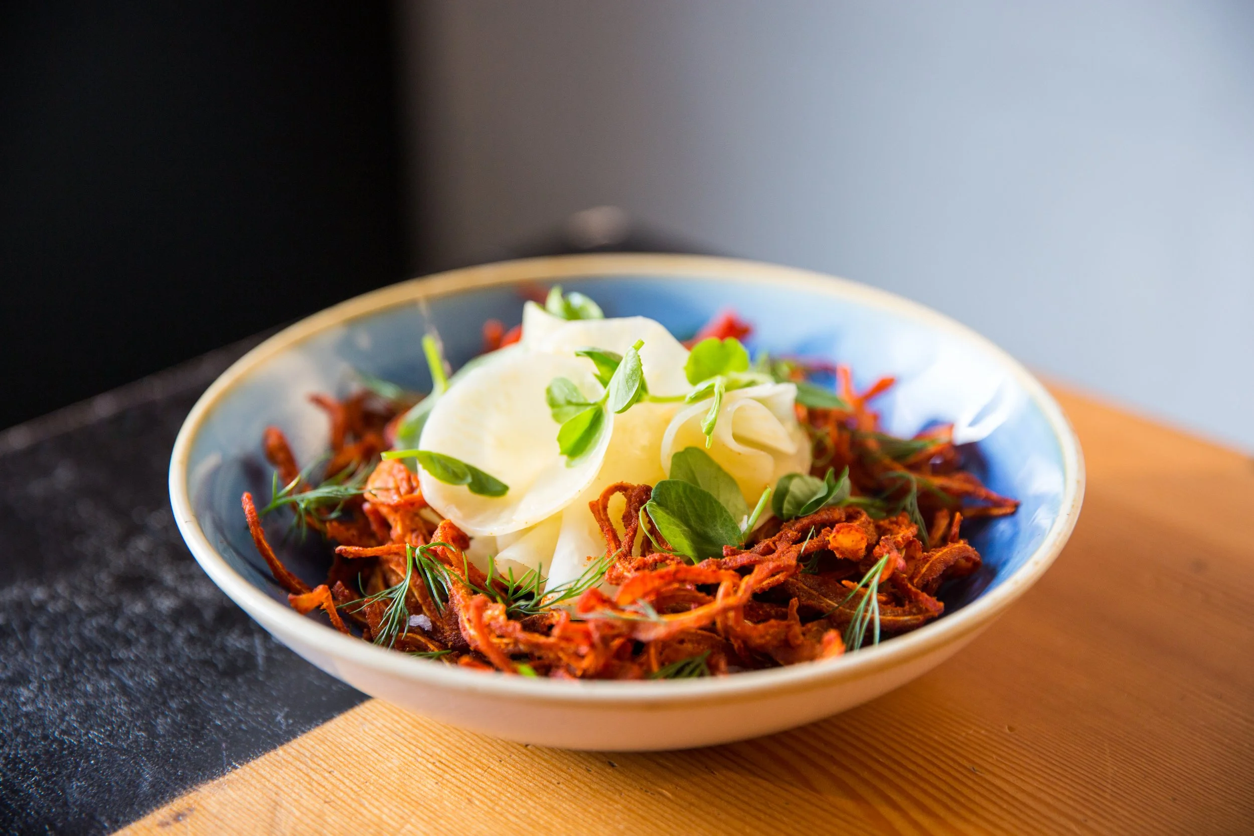 Red Wine Braised Short Rib, Mole, Fermented Aji Dulce Chiles, Beef fat-confited and Roasted Carrots, and Mustard Greens