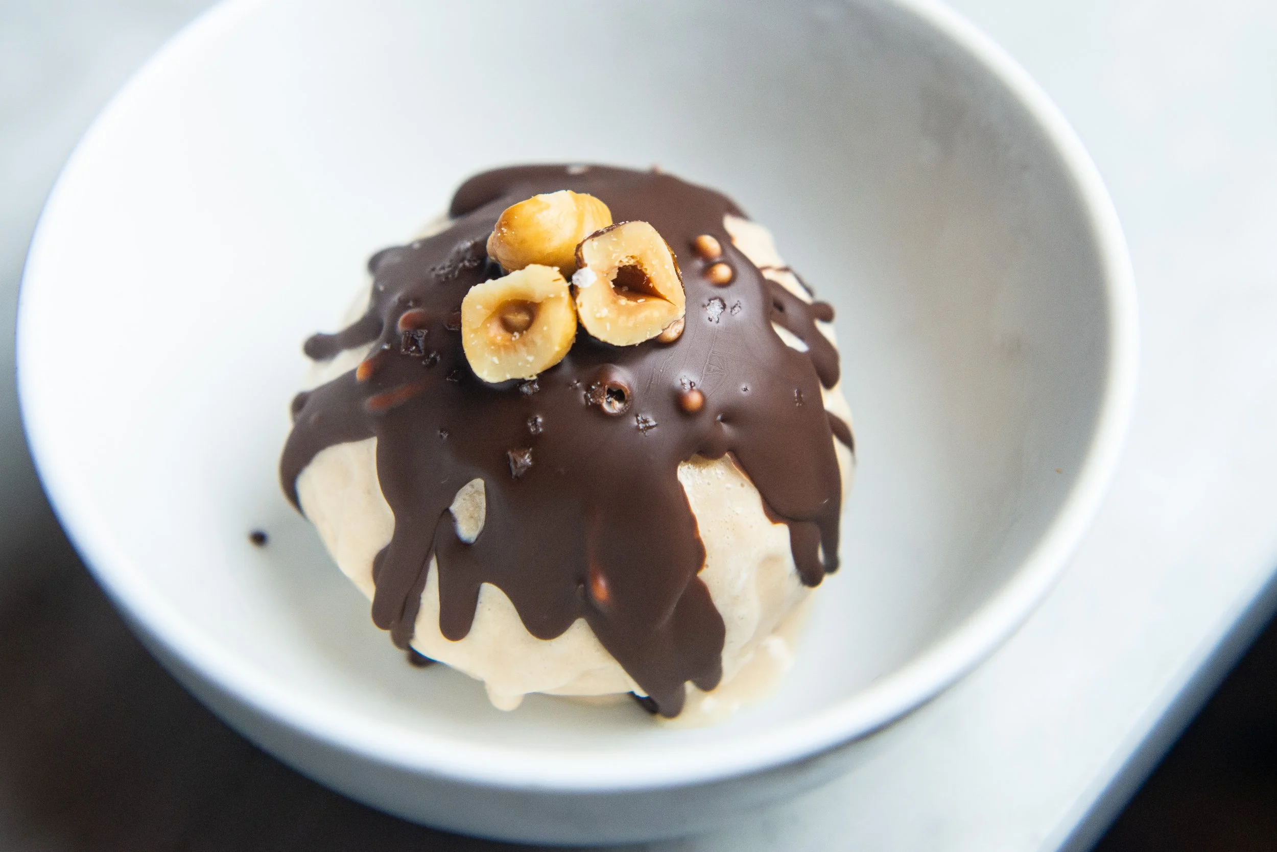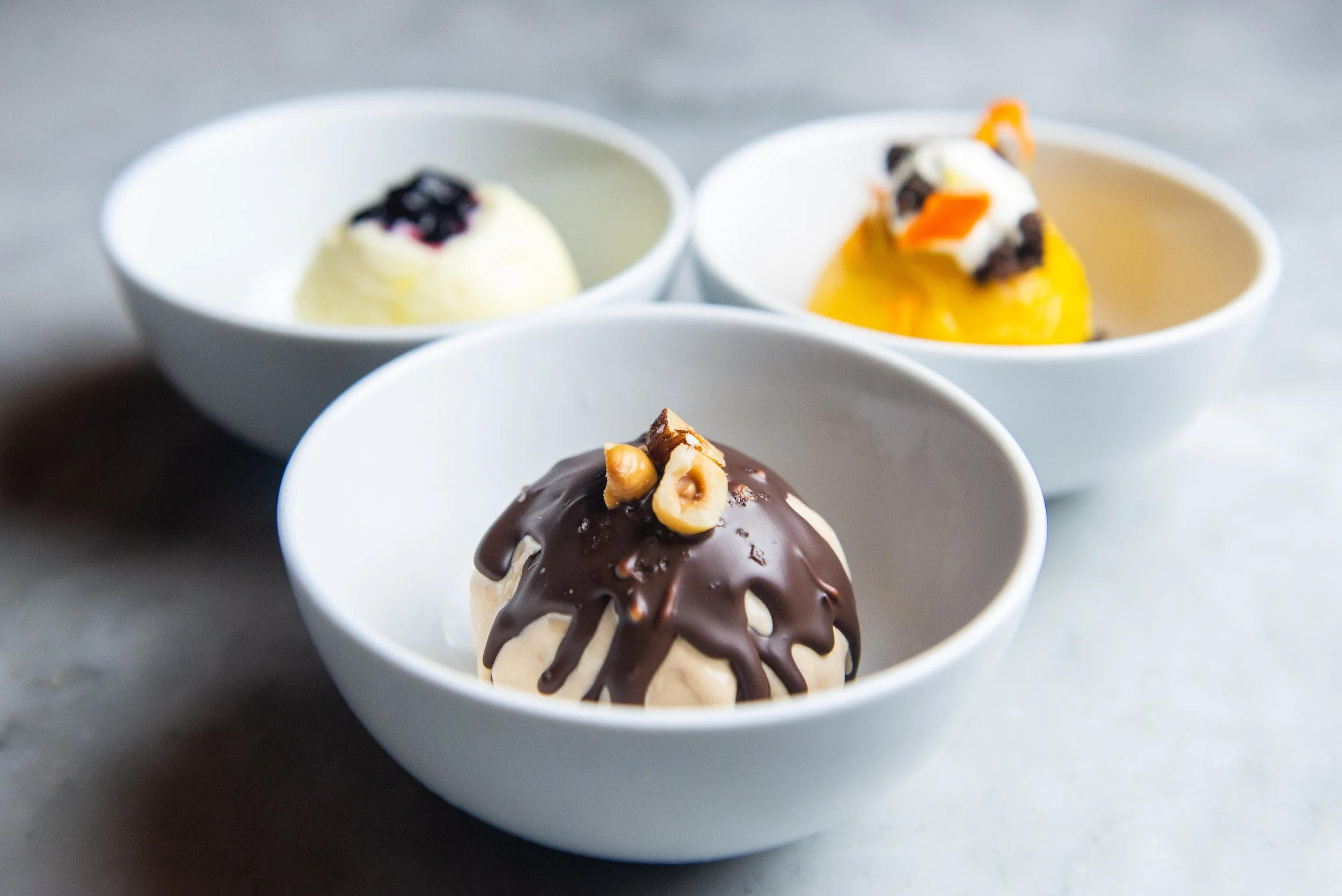 Bacio with Hazelnut and Chocolate Magic Shell, Kabocha Squash Sorbet with Mascarpone Crema, Candied Cocoa Nib, and Marigold; Meyer Lemon Gelato with Huckleberry Jam