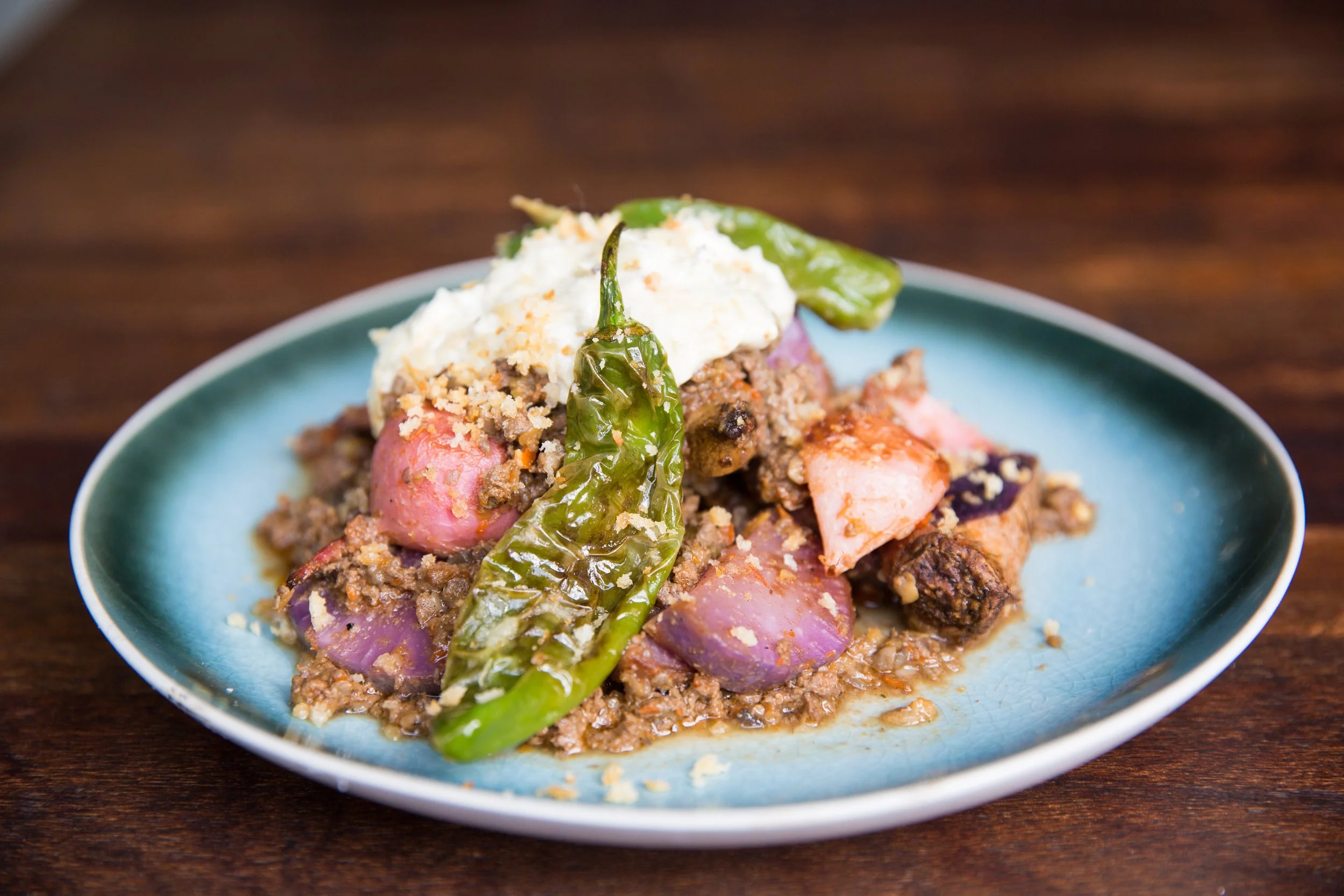 Roasted Purple Daikons, Sweet Potatoes, Scarlet Turnips, Charred Shishito Peppers, Duck Heart Chile Ragu, and Fermented Chile Sour Cream