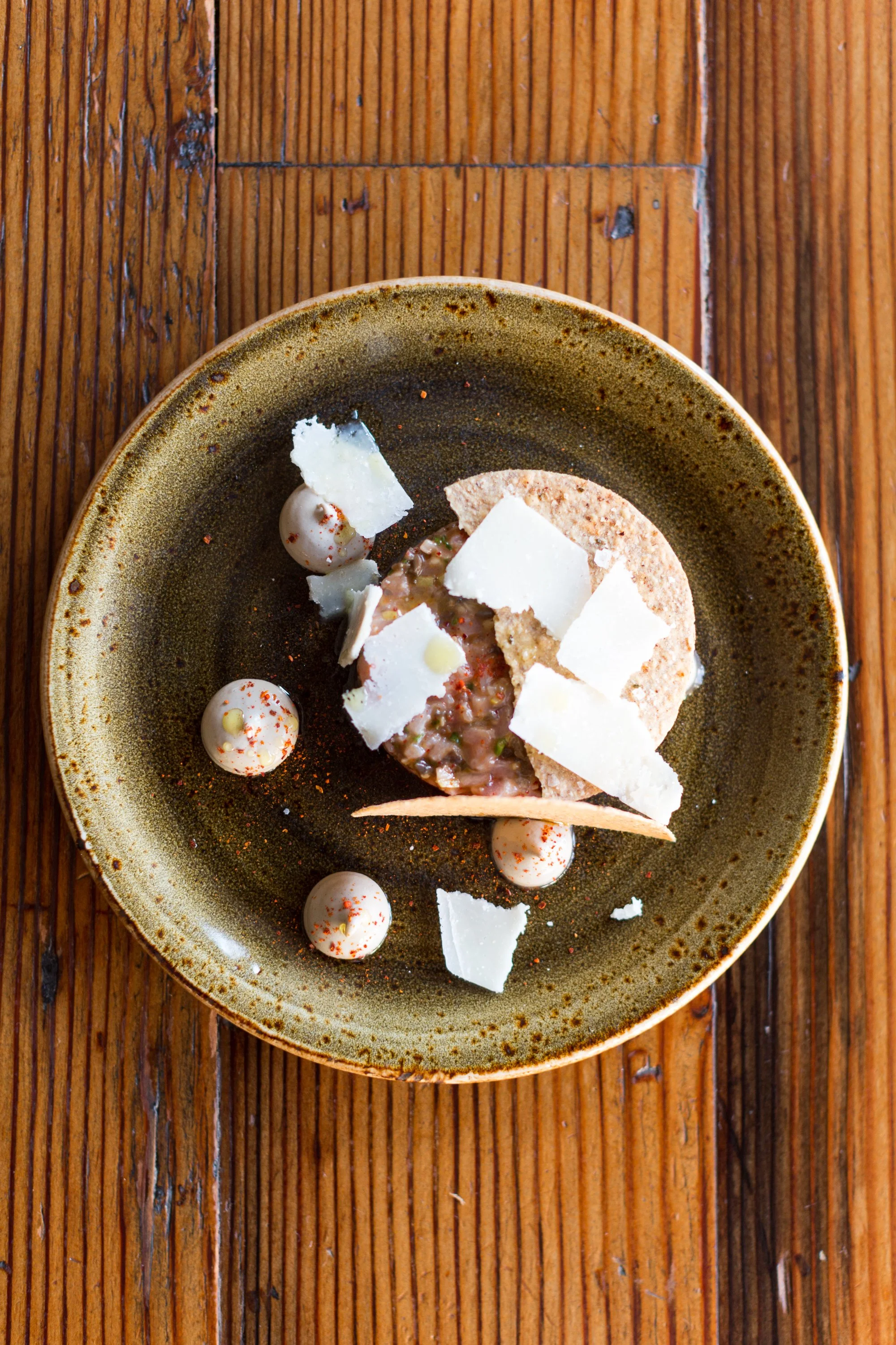 Veal Tartare, Black Truffle-Mushroom Conserva, Porcini Aïoli, Lemon Zest, Parmesan, and Sourdough Cracker