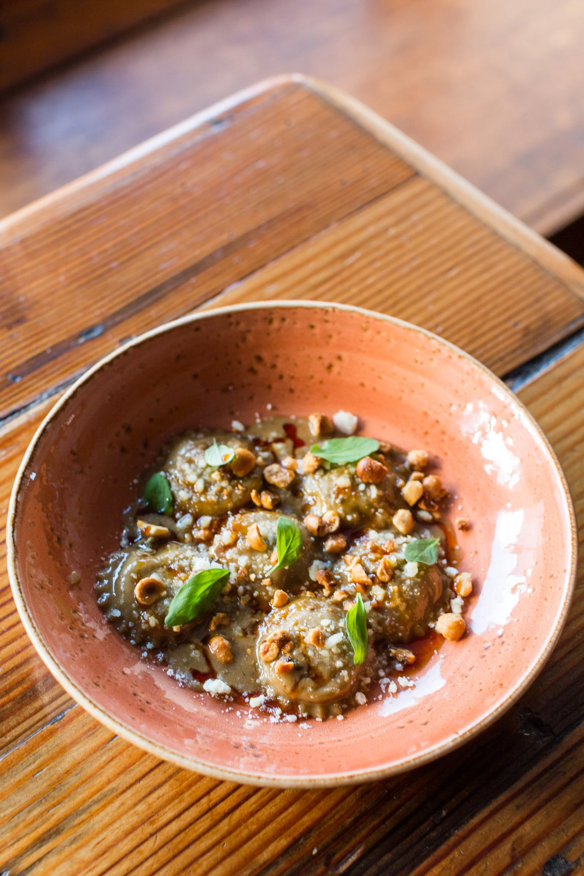 Mushroom Ravioli, Foie Gras, Toasted Hazelnuts, Marjoram, and Mugolio