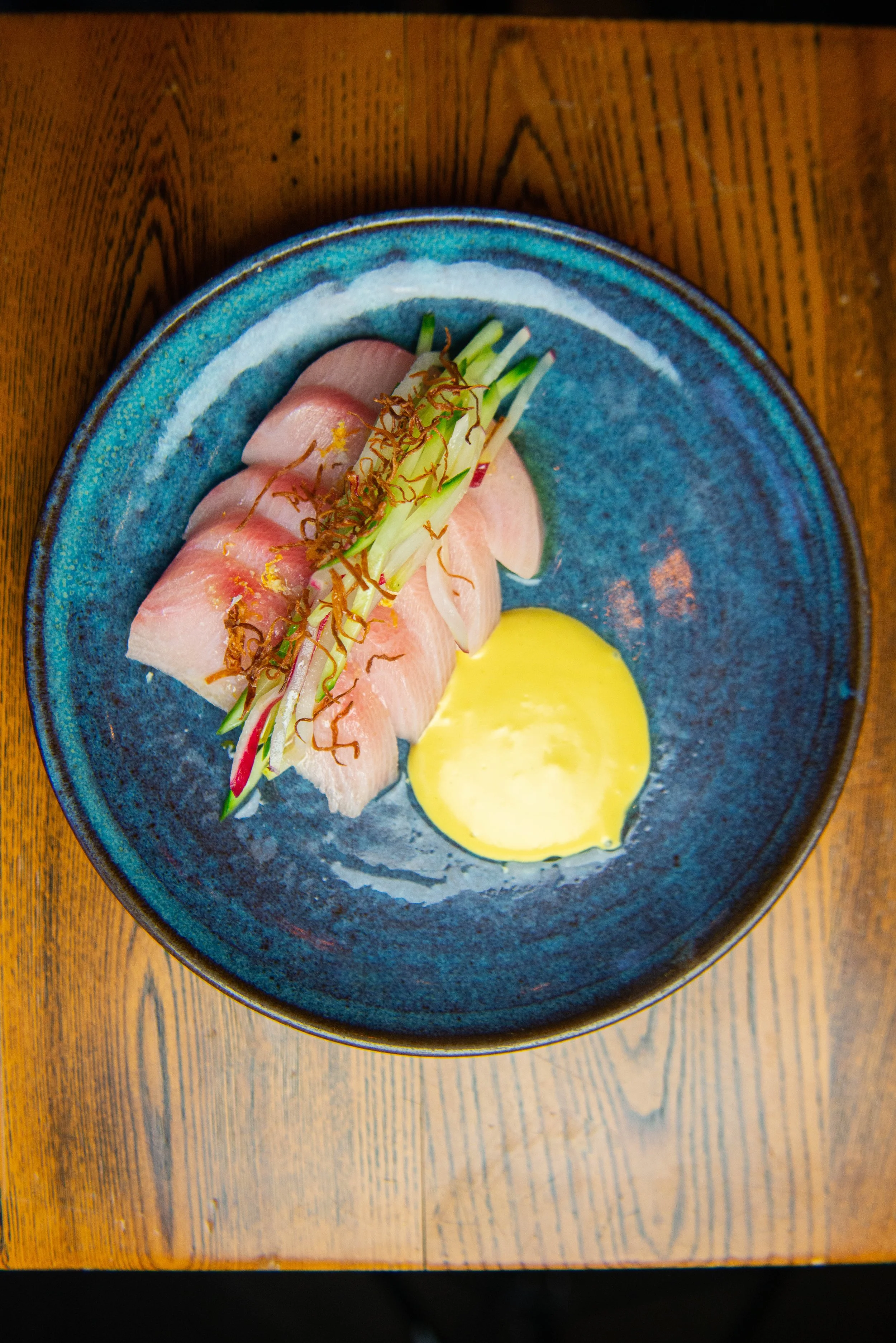 Hamachi Crudo, Passionfruit, Crispy Ginger, Radish, Cucumber, Orange Sea Salt