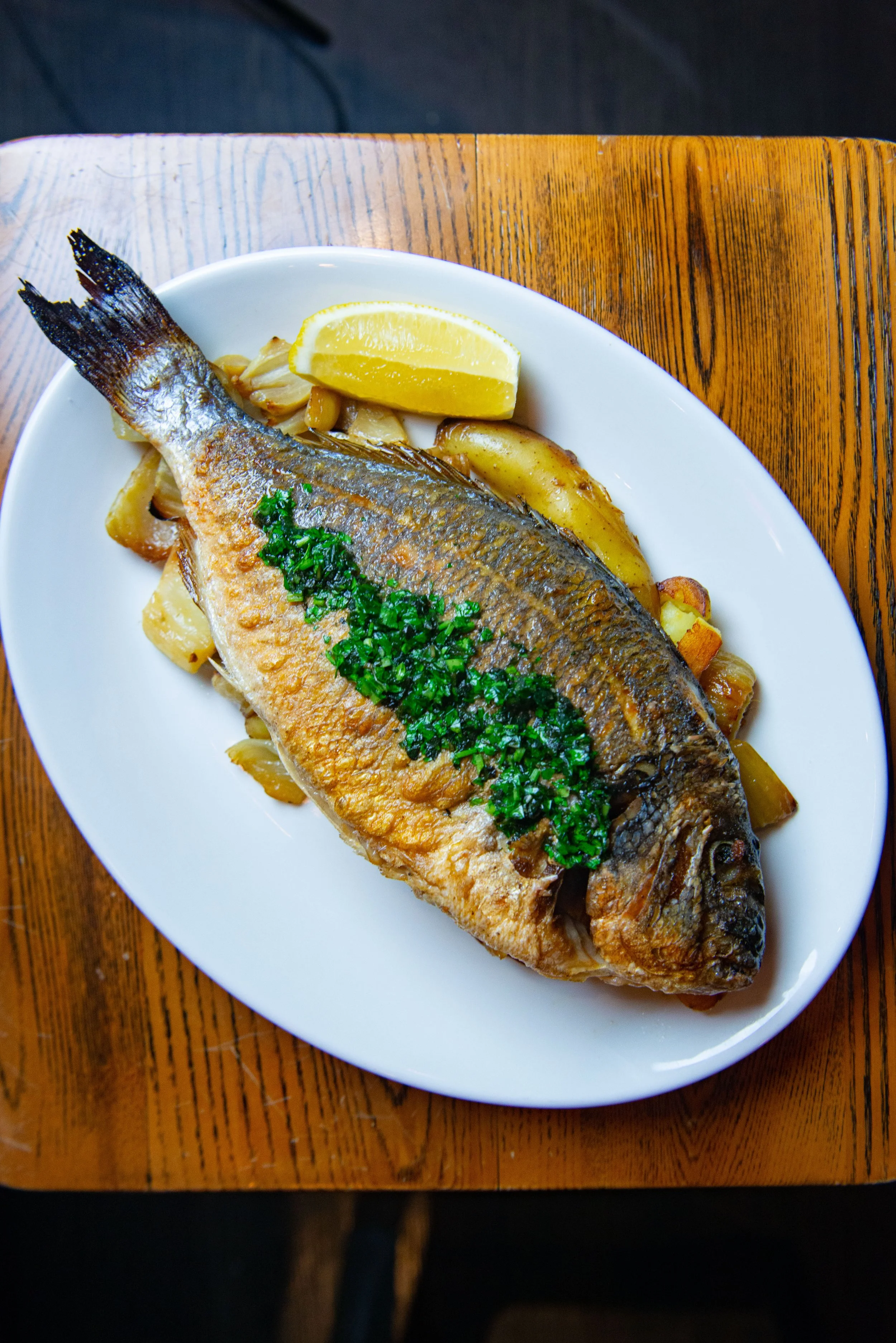 Whole Roasted Sea Bream, Salsa Verde, Roasted Fennel and Fingerling Potatoes