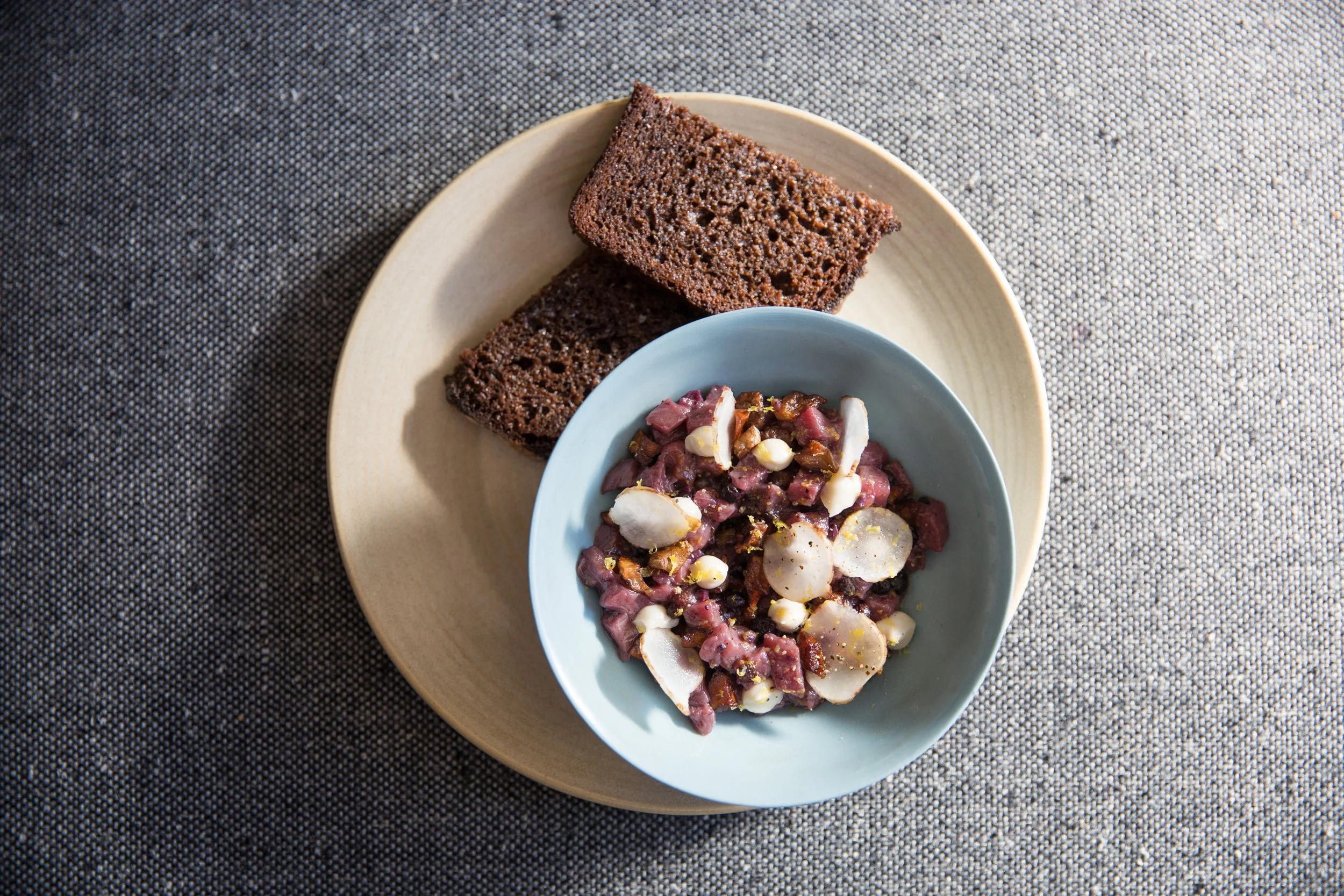 Bison Tartare, Capered Huckleberries, Sunchoke, Cashew Cream, Dried Egg Yolk, Lost Bread Co. Beet-Rye Bread