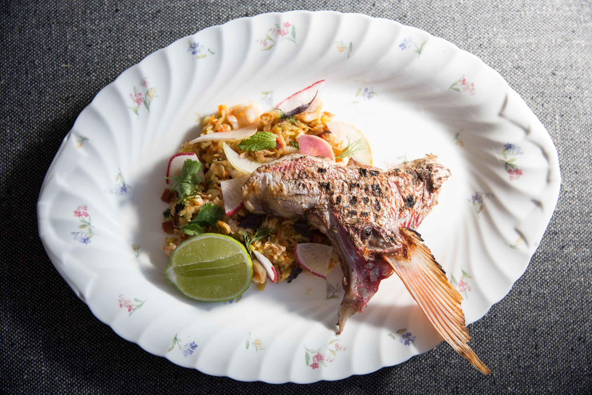 Grilled Snapper Collar, Delta Blues Seafood Fried Rice, Lobster Bottarga, Shrimp, Chorizo, Lime, Radish, Crispy Shallots, Basil, Mint, Cilantro, and Dill
