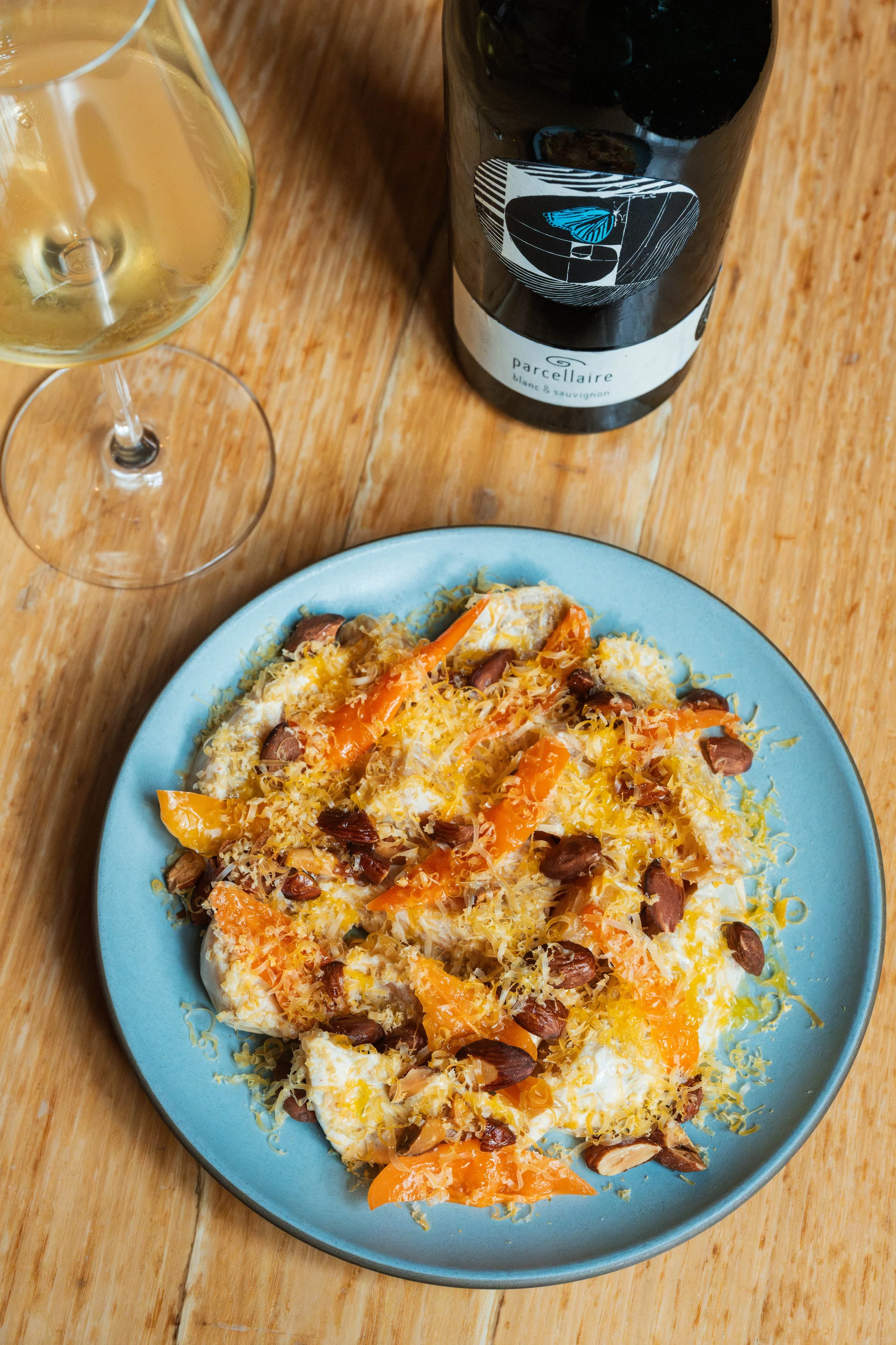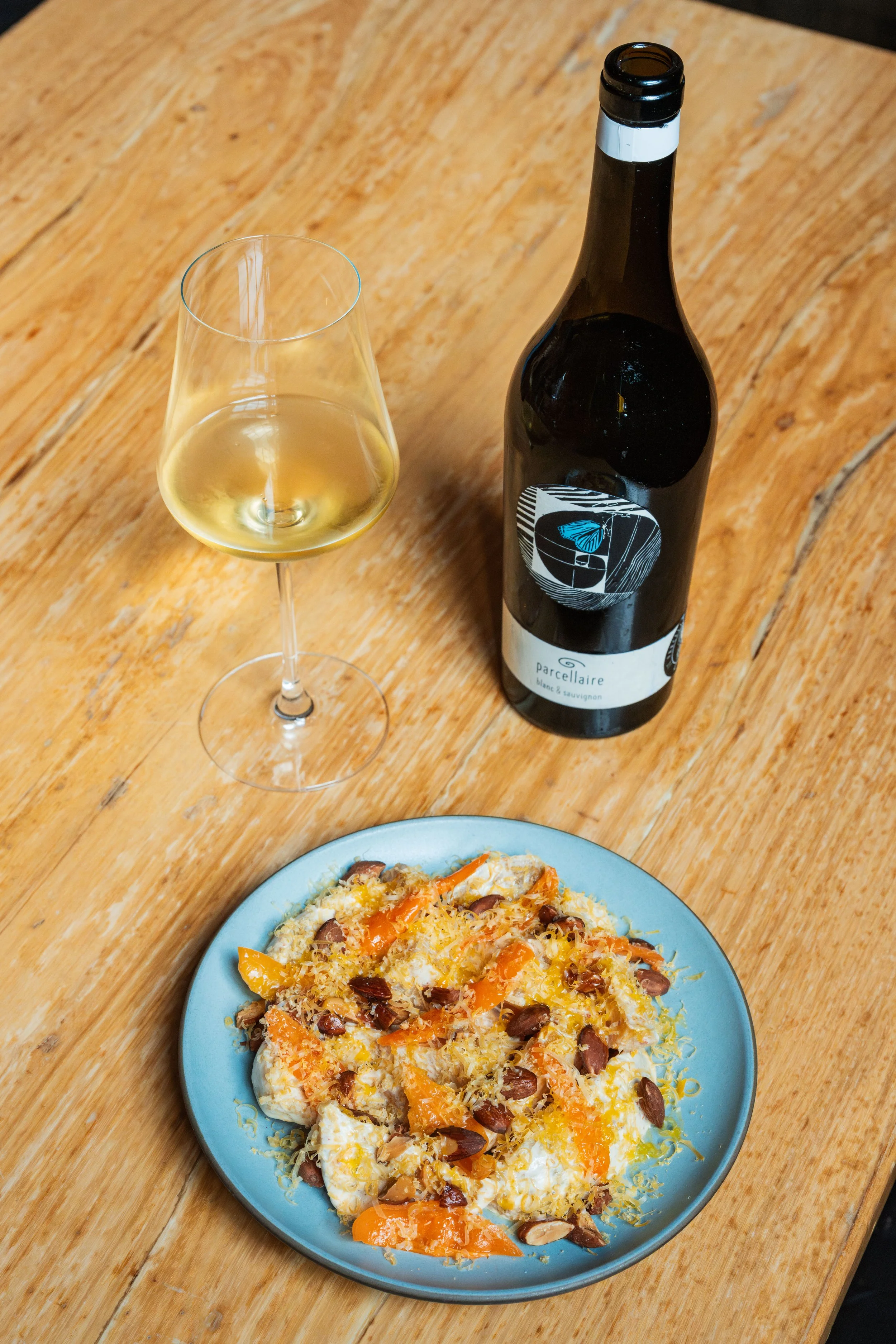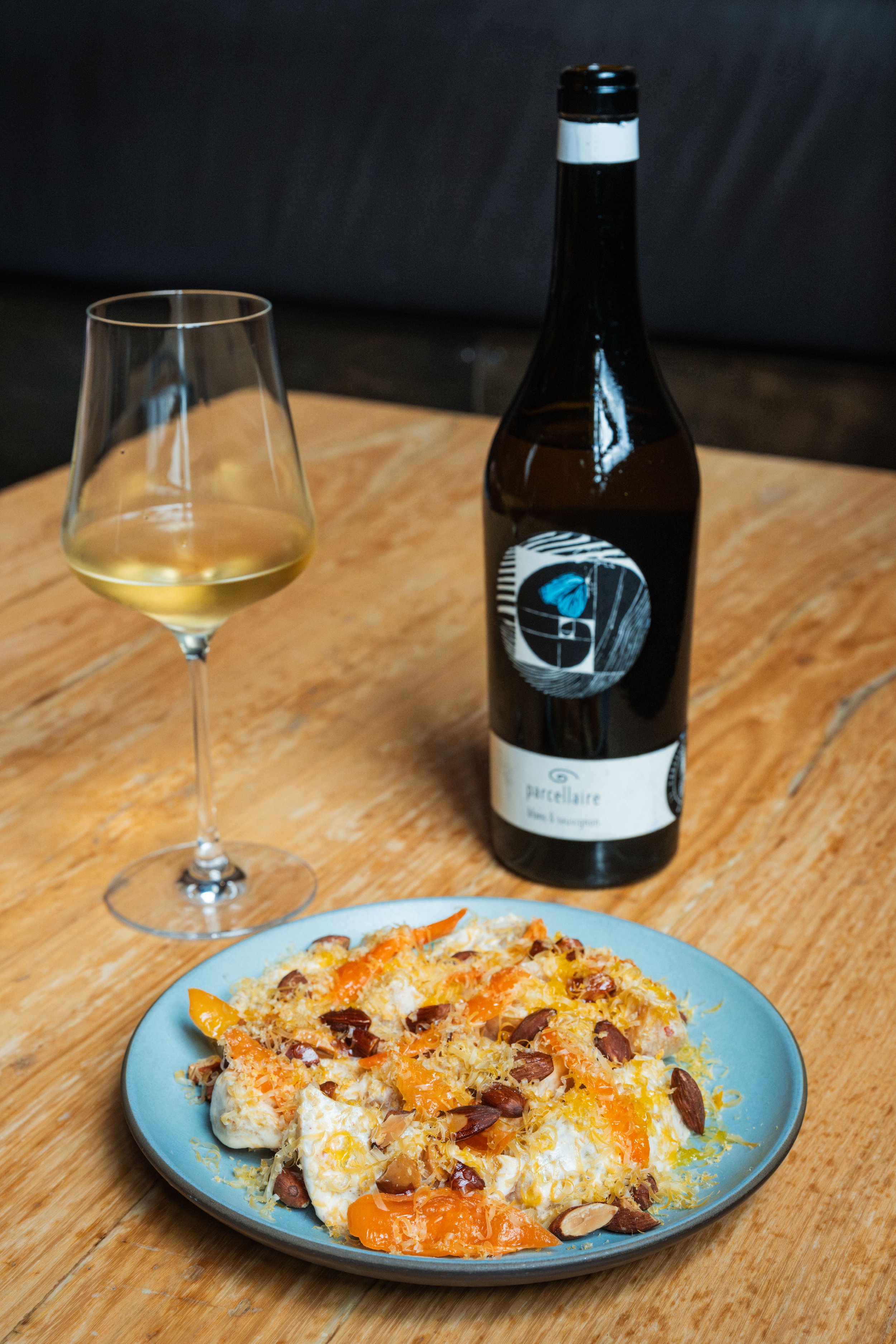 Golden Beets, Citrus Segments, Pickled Habananda Peppers, Horseradish, Zinfandel Vinegar, Mimolette Cheese, Crème Fraîche, Toasted Hazelnuts paired with Pinot Blanc/Sauvignon Blanc, Johannes Zillinger, Parcellaire, Weinviertel, Austria, 2021