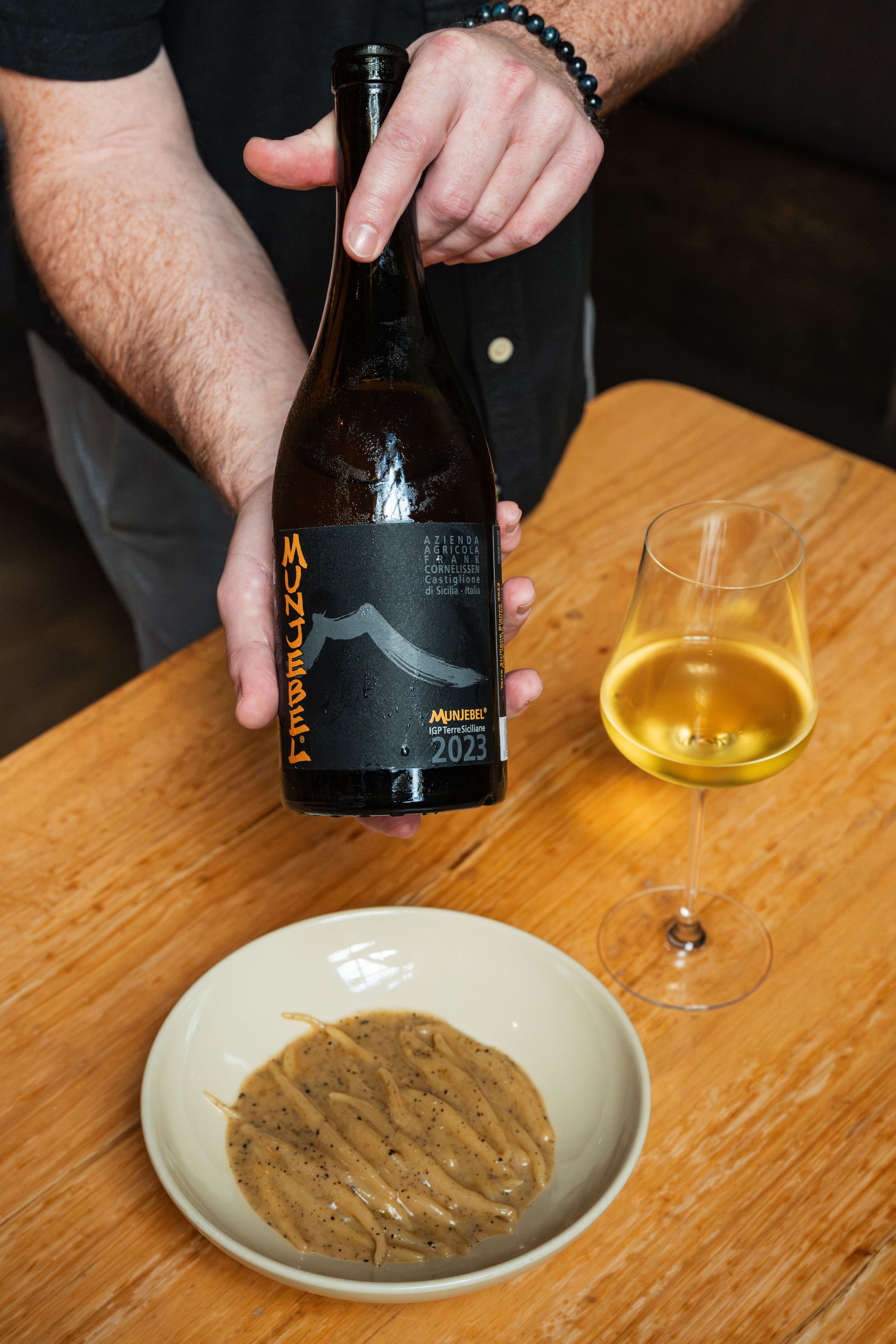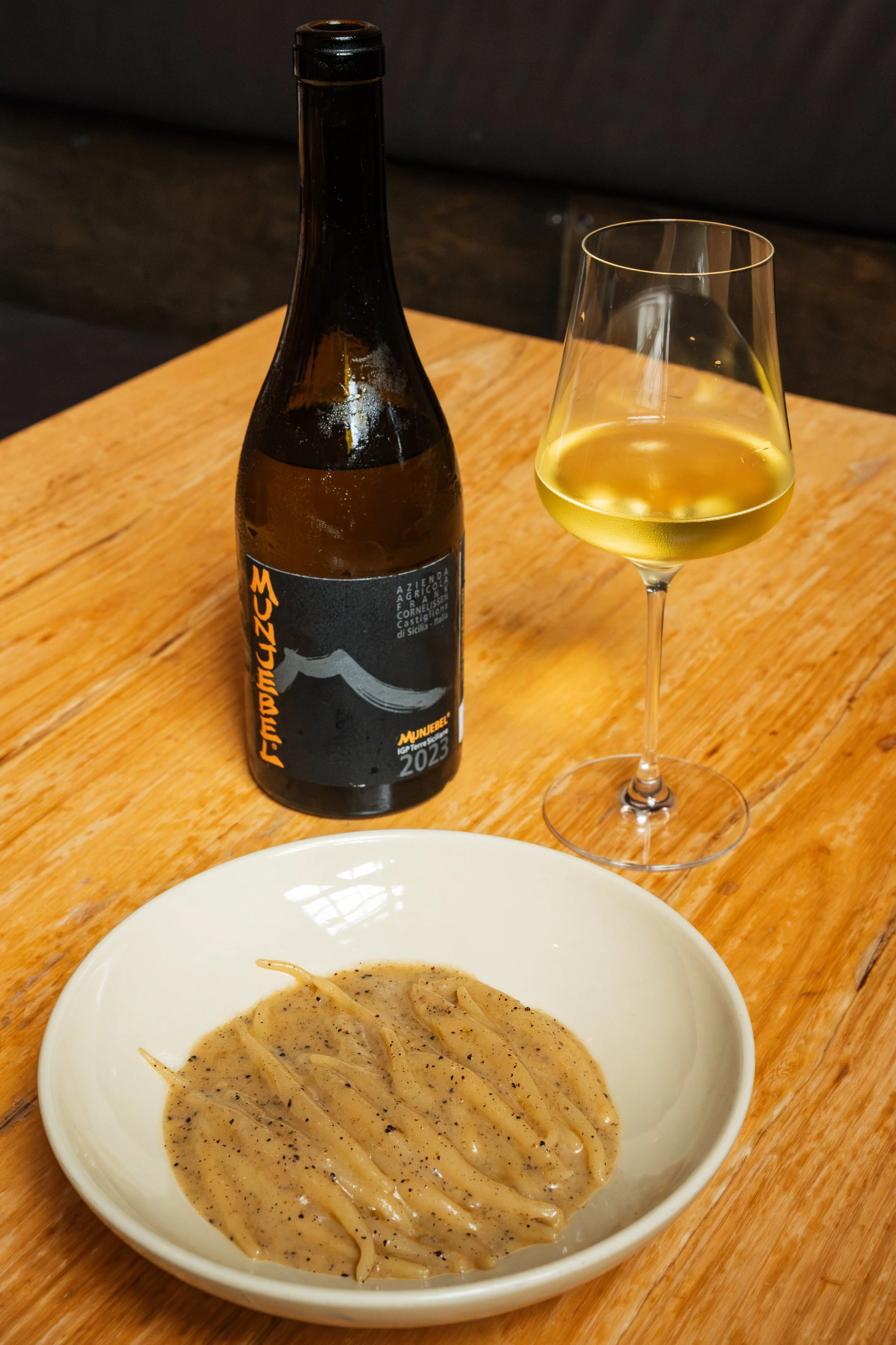 Cecamariti, Sourdough-Miso Sauce, Tellicherry Peppercorns paired with Carricante/Grecanico Dorato, Frank Cornelissen, Munjebel Terre Siciliane, Sicily, Italy, 2023