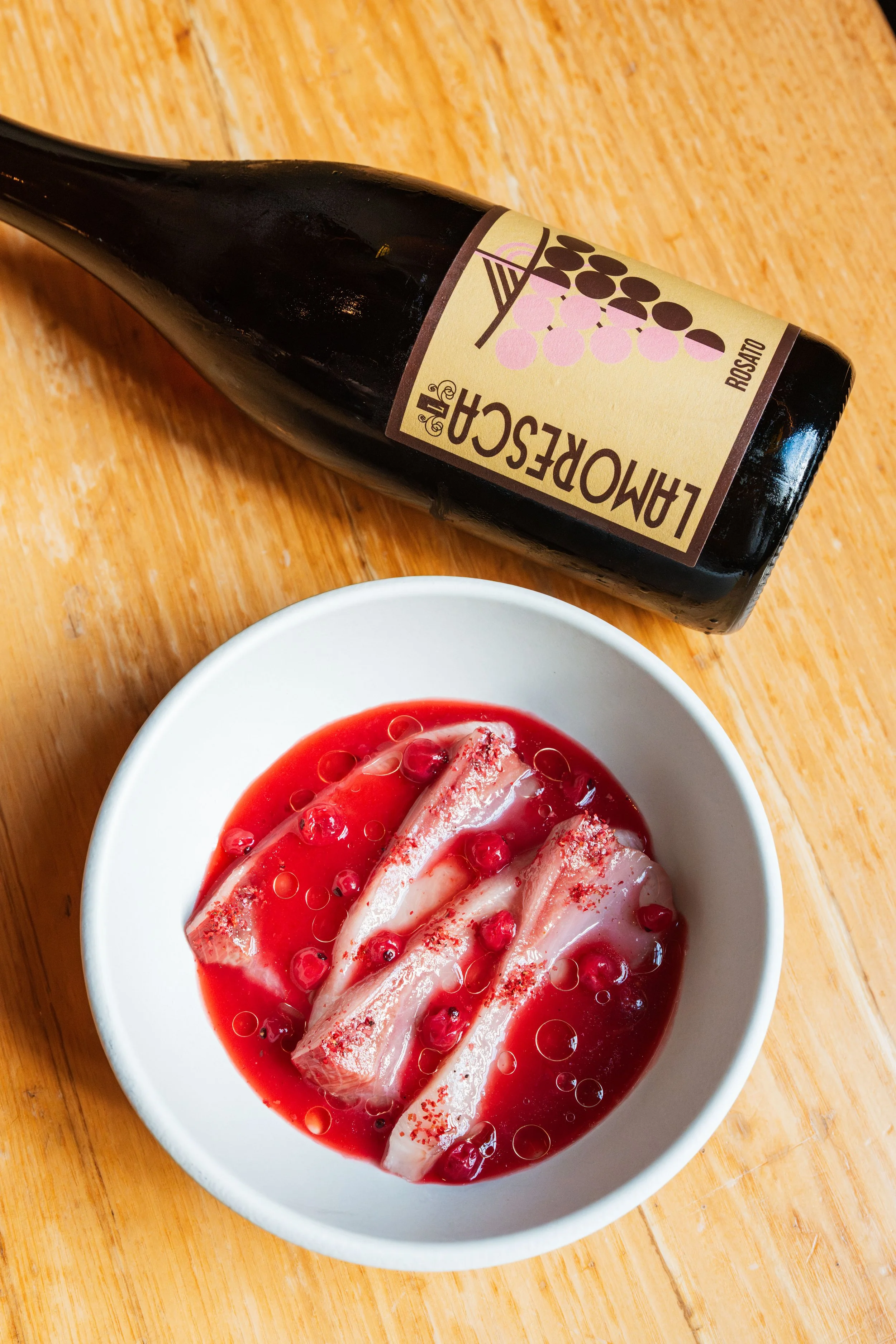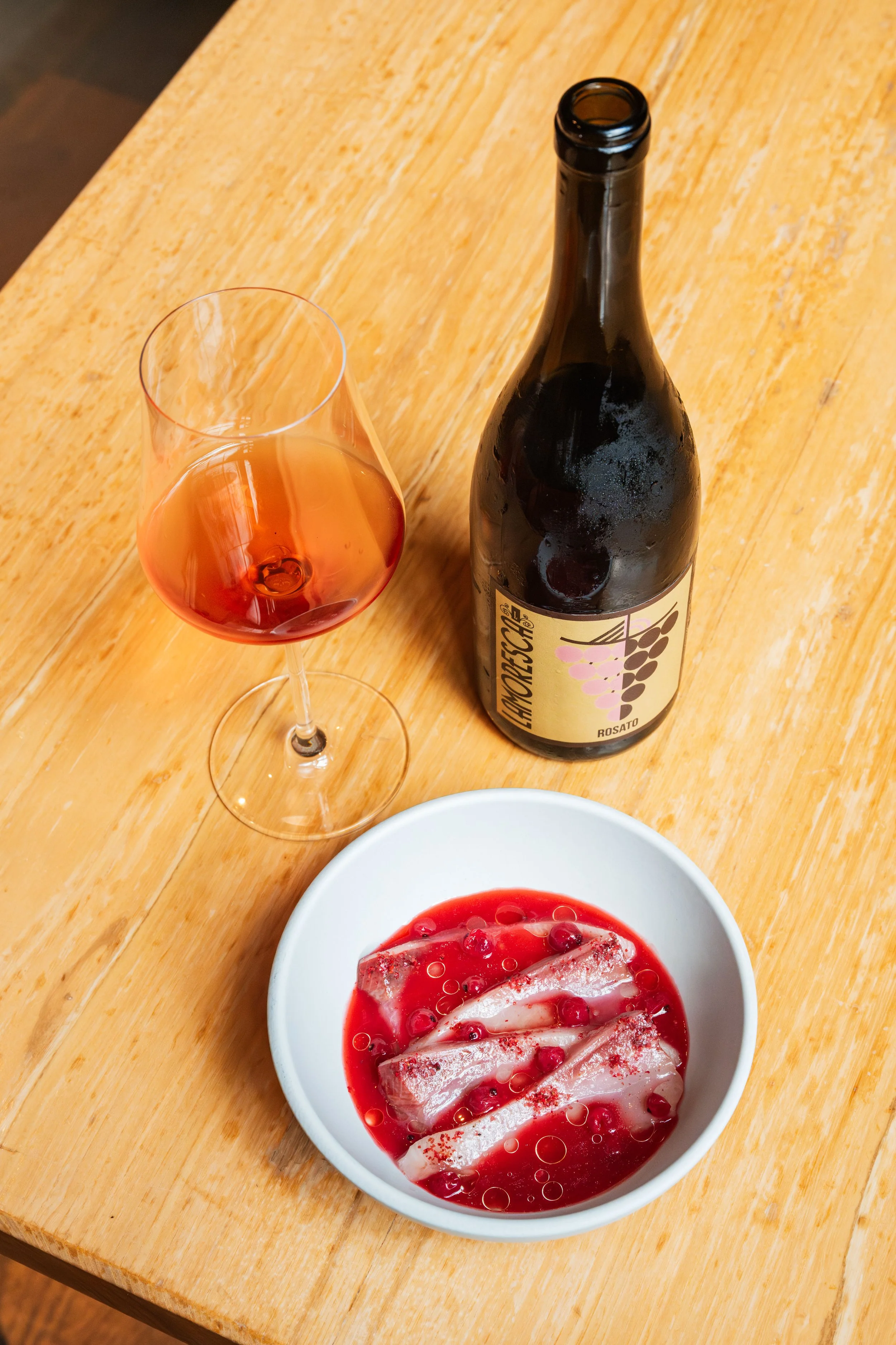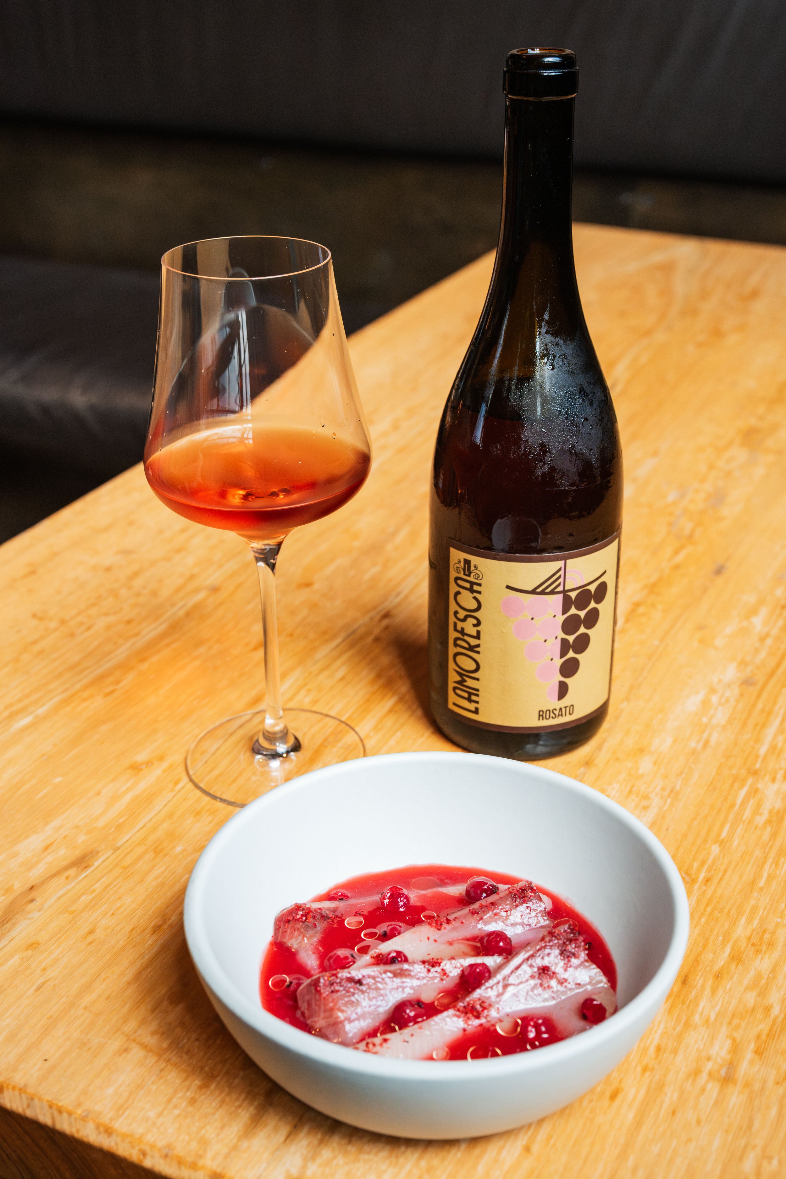 Hamachi, Raspberry Aguachile, Red Currants, Pink Peppercorn Oil paired with Frappato/Nero d’Avola/Zibibbo, Lamoresca, Lamoresca Rosato, Sicily, Italy, 2024