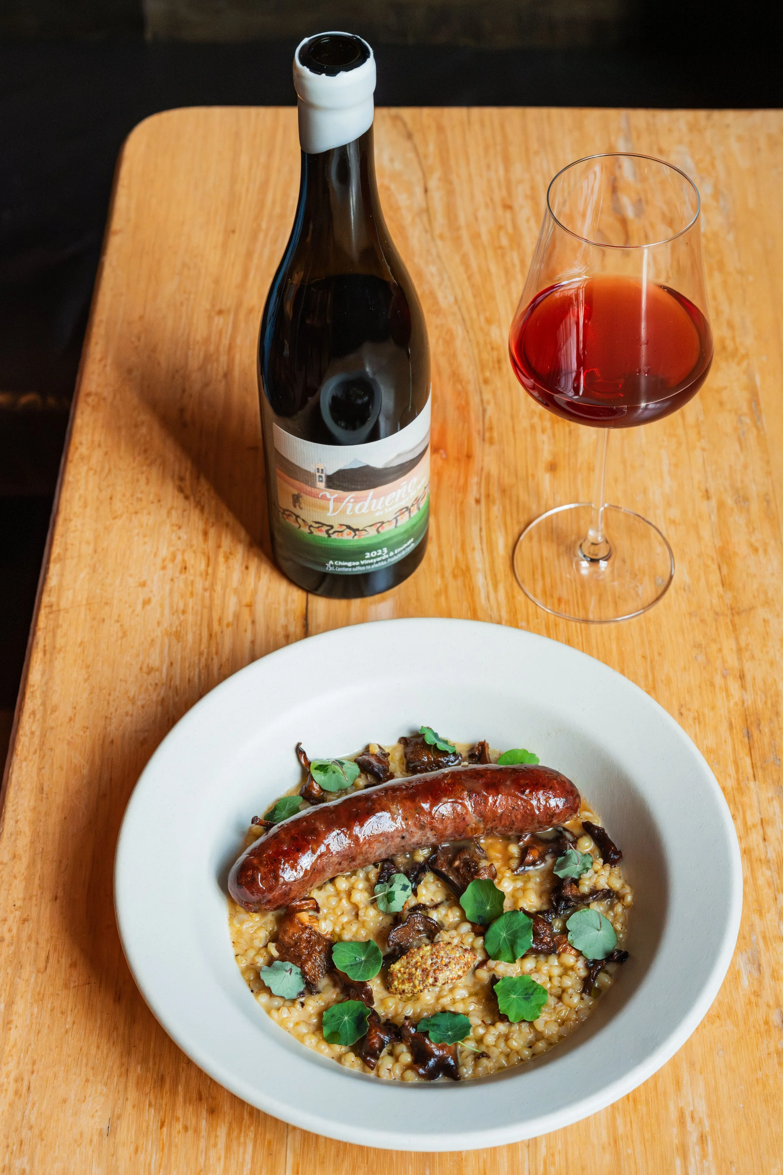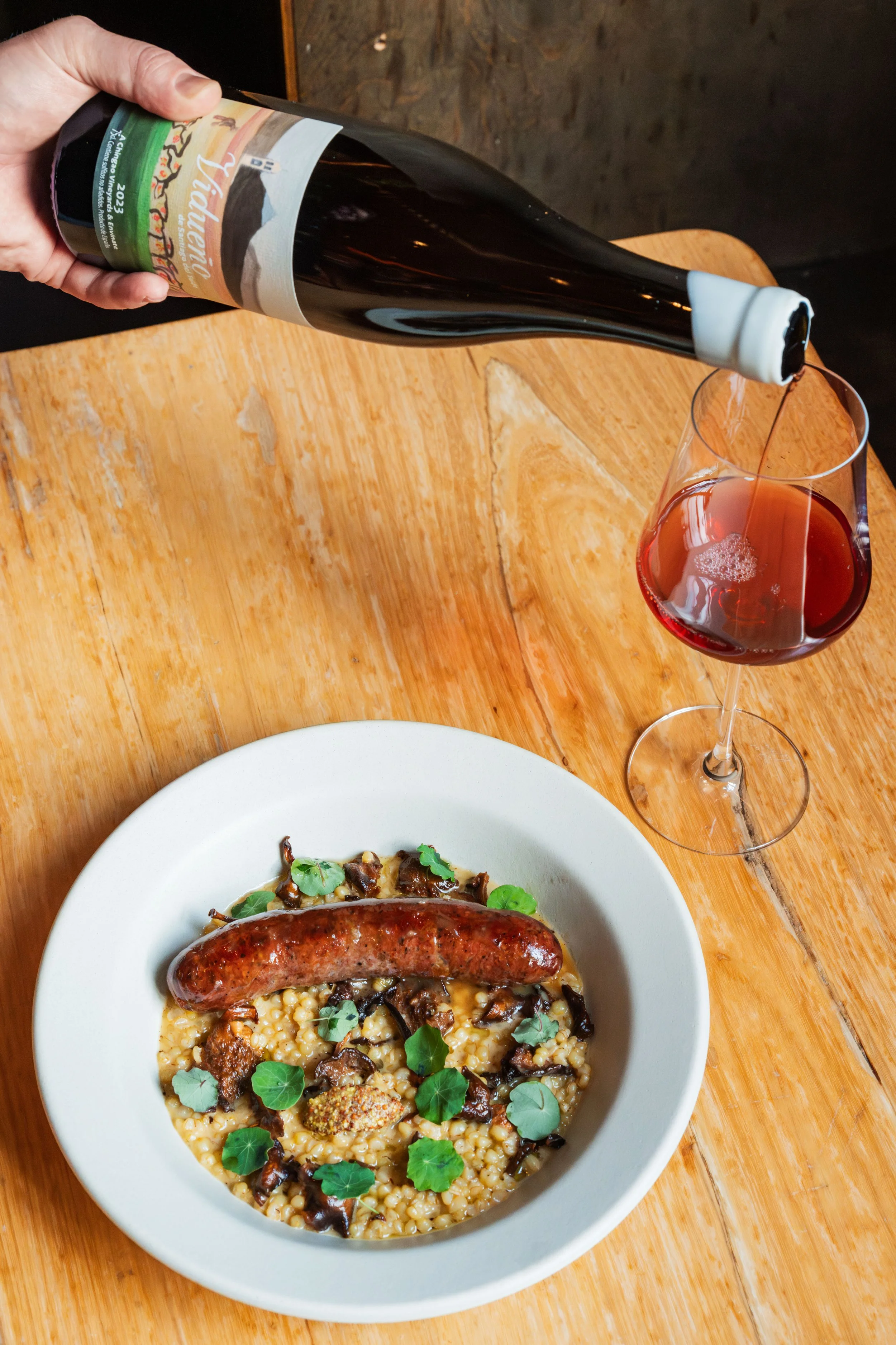 Tuna-Pork Sausage, Fermented Orchid Peppers, Hedgehog Mushrooms, Sonora Berries, Whole Grain Mustard, Nasturtium paired with Listan Blanco/Listan Prieto, Envinate, Vidueño de Santiago del Teide, Tenerife, Spain, 2023