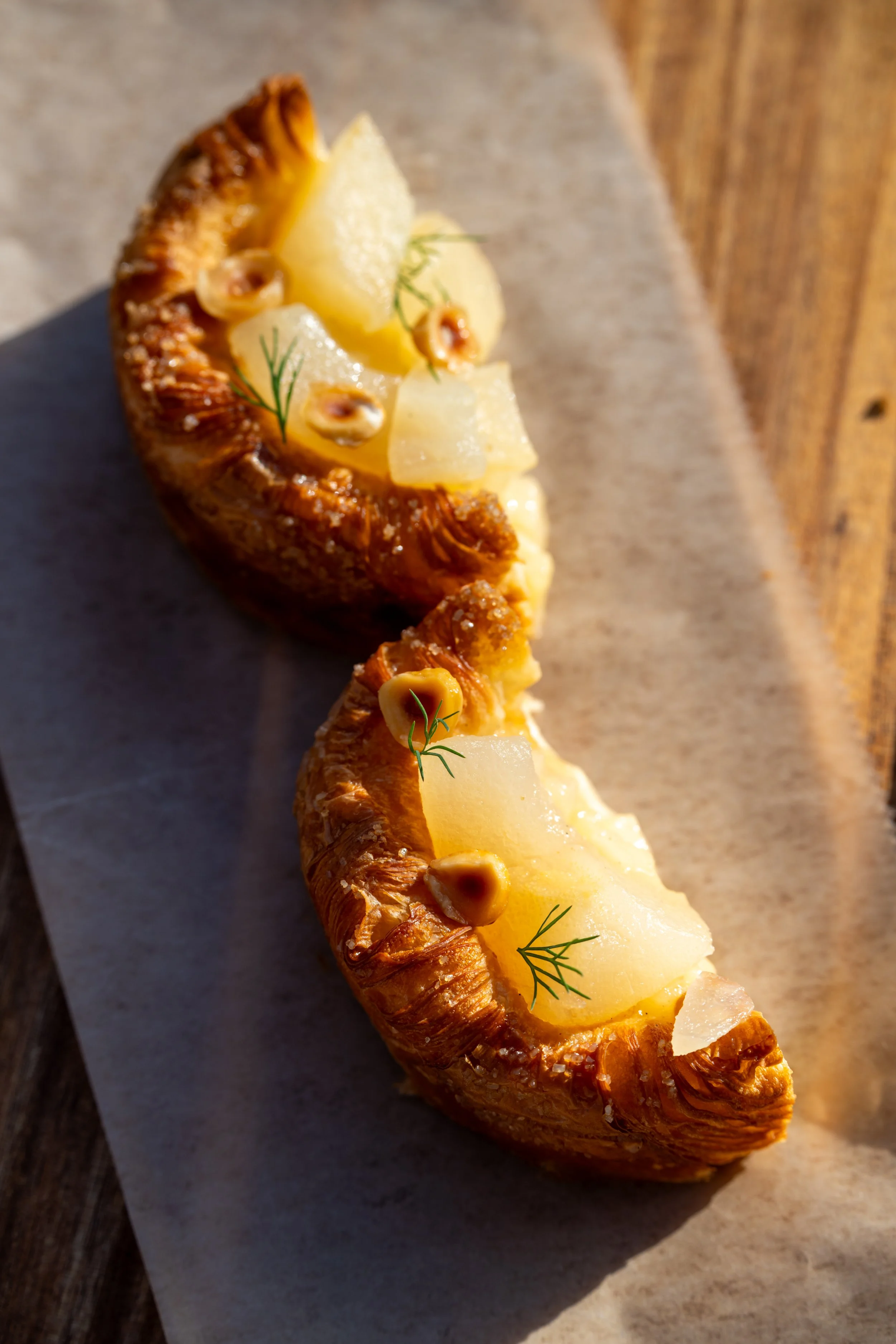 Poached Pear Danish, Vanilla-Cream Cheese Custard, Pea Compote, Hazelnuts, Elderflower